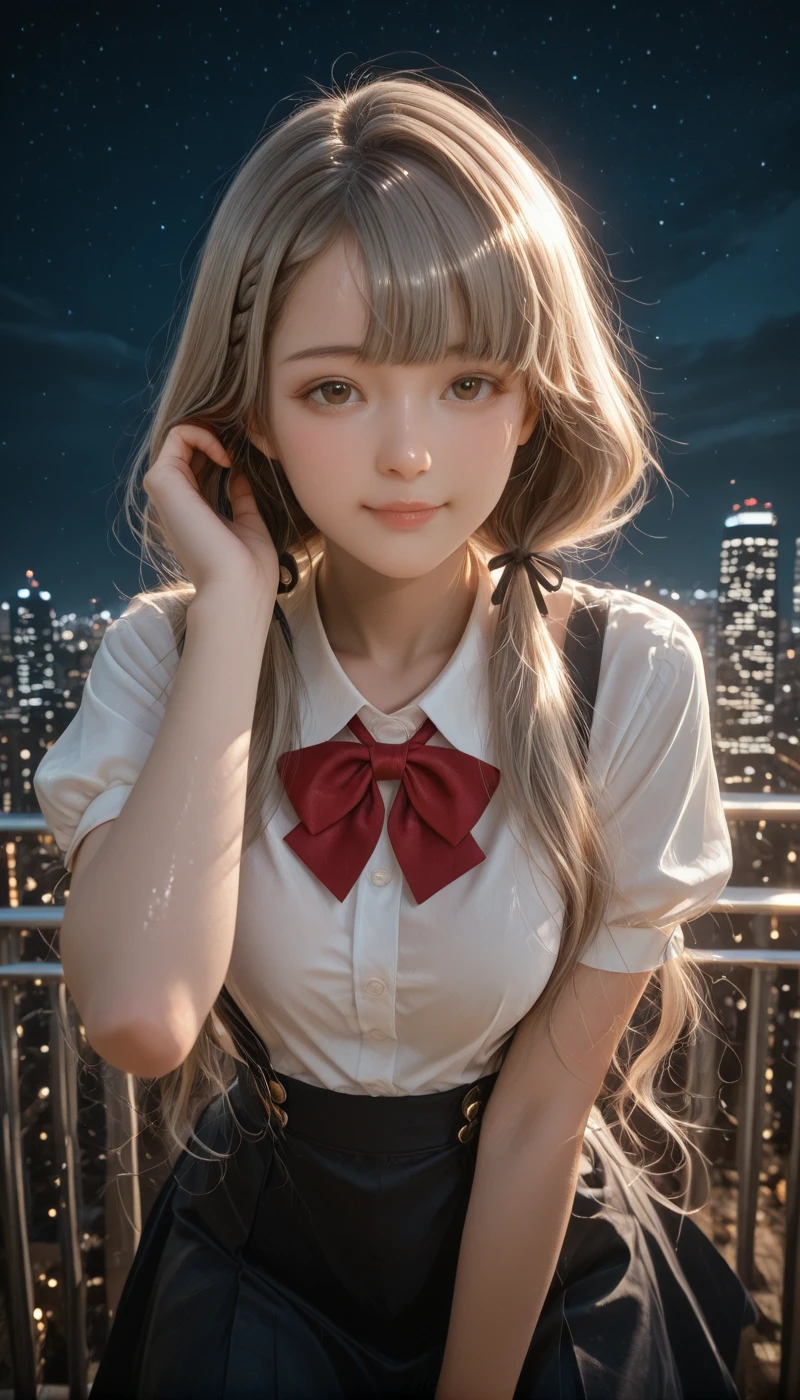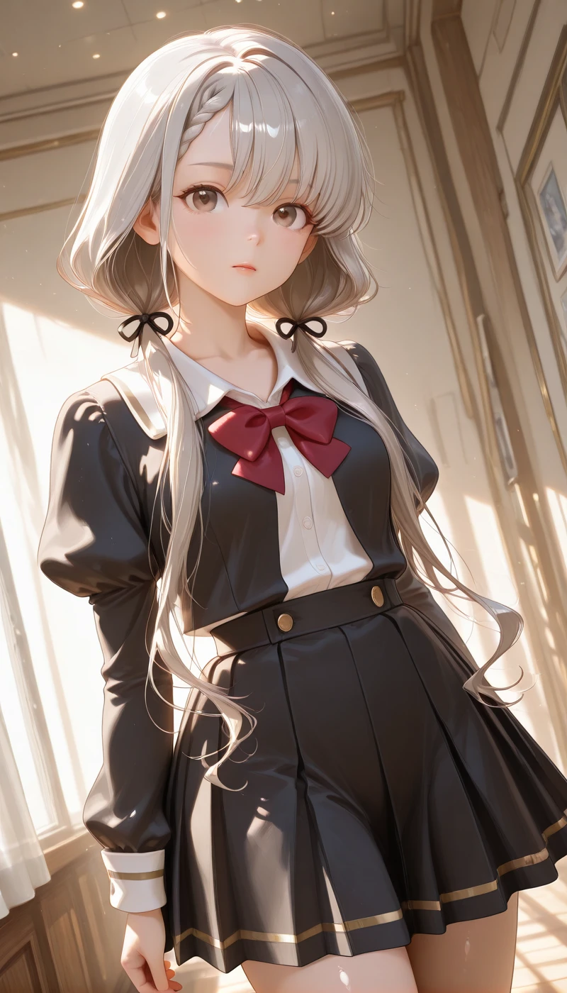 shirt, skirt, long sleeves, bow, ribbon, jacket, school uniform, collarbone, white shirt, hair ribbon, pleated skirt, collared shirt, puffy sleeves, bowtie, black skirt, red bow, black jacket, black ribbon, dress shirt, juliet sleeves, red bowtie, dress, sleeve cuffs, thighs,