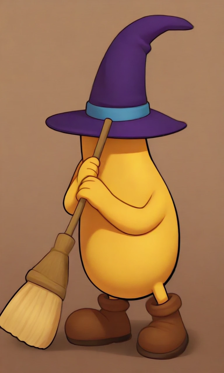 Broom Hatter, round body, yellow skin, no face, purple hat, yellow hands, brown shoes, holding broom