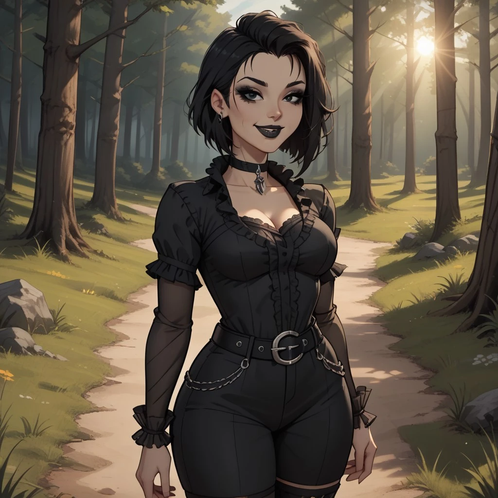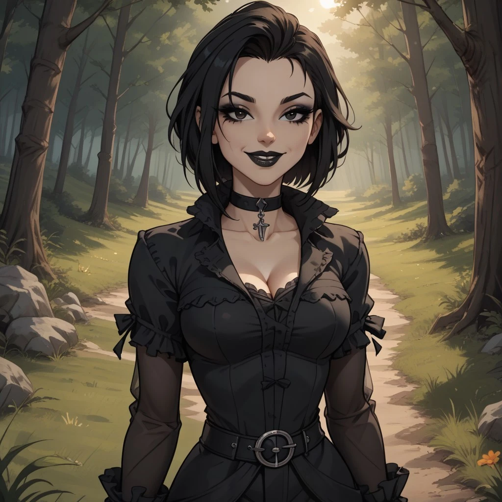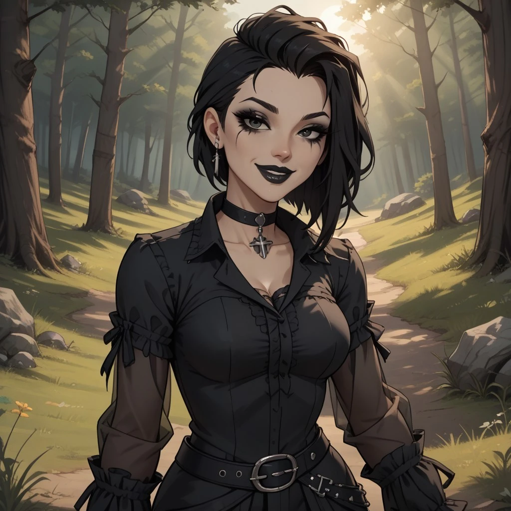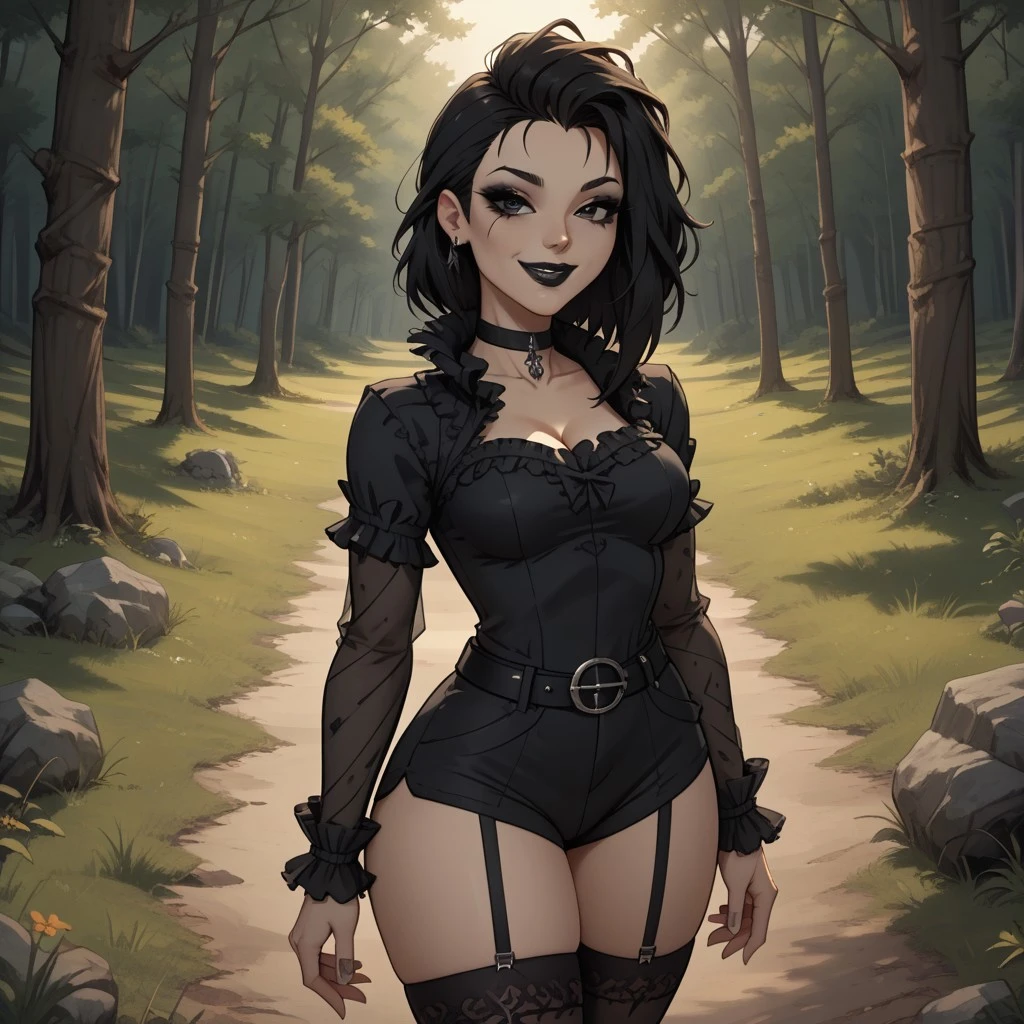 1girl, black hair, black eyes, black eyeshadow, gothic makeup, black lips, lipstick, choker, black shirt with tassels on the neck and sleeves, black belt, black knee-high stockings, black heels, breasts, Annika_(Disventure_Camp)