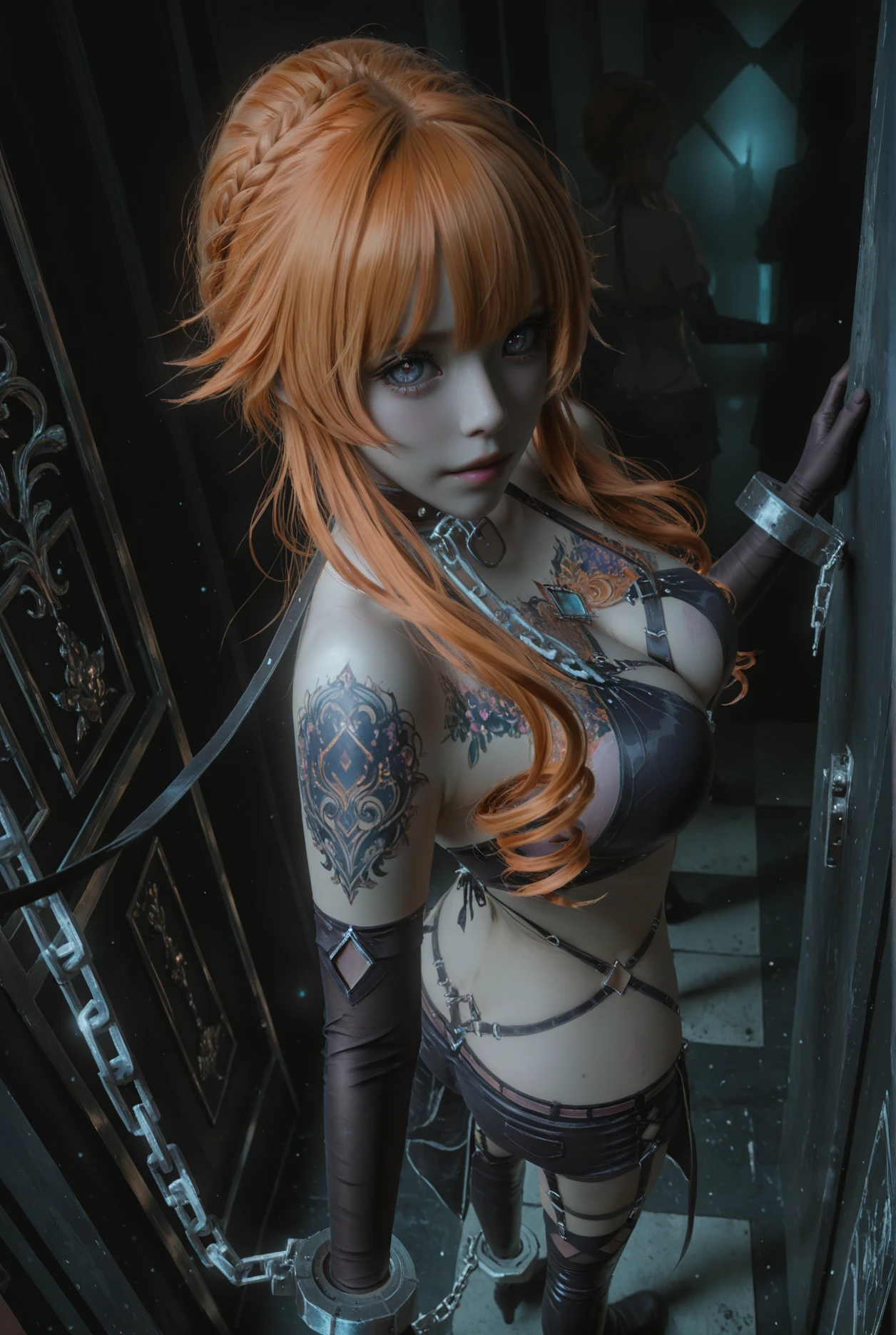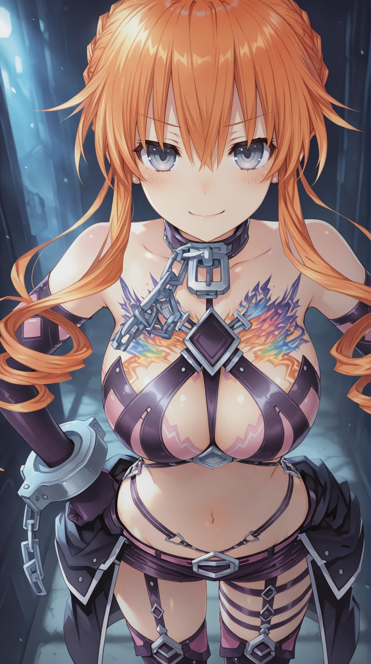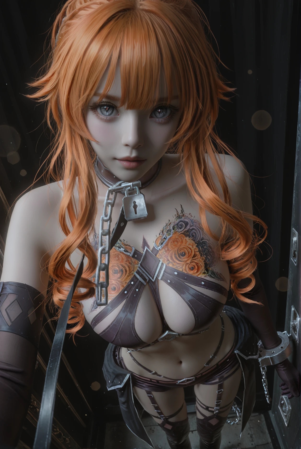 BersakerA,1girl,solo,thighhighs,shorts,orange hair,navel,drill hair,short shorts,thigh boots,cuffs,midriff,grey eyes,boots,chain,blue eyes,garter straps,gloves,leash,metal collar, cleavage,large breasts,chest tattoo