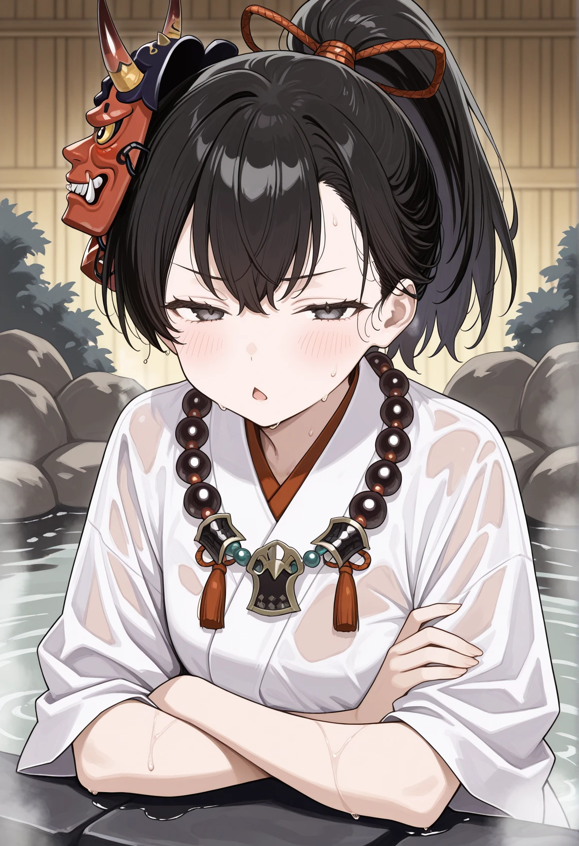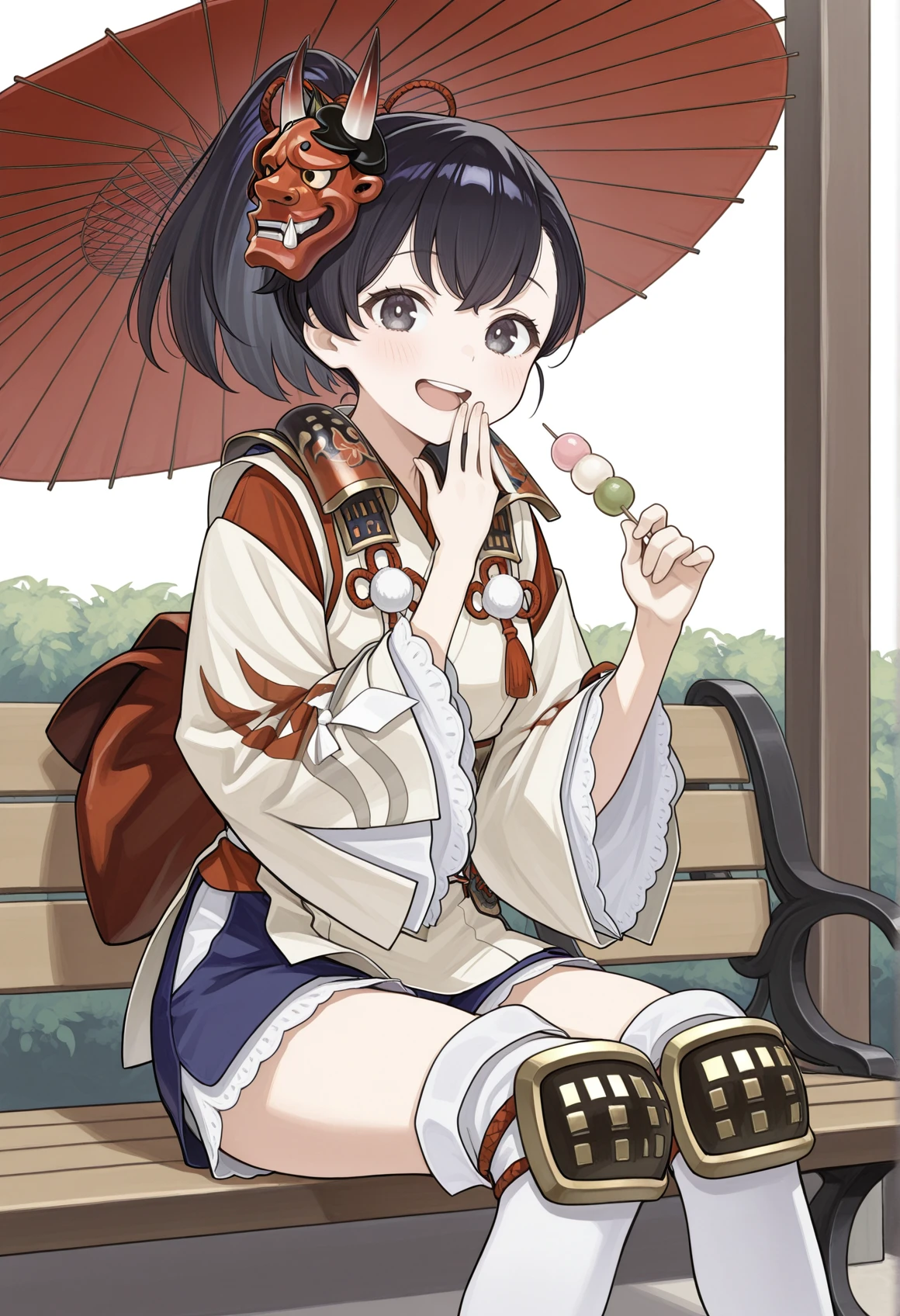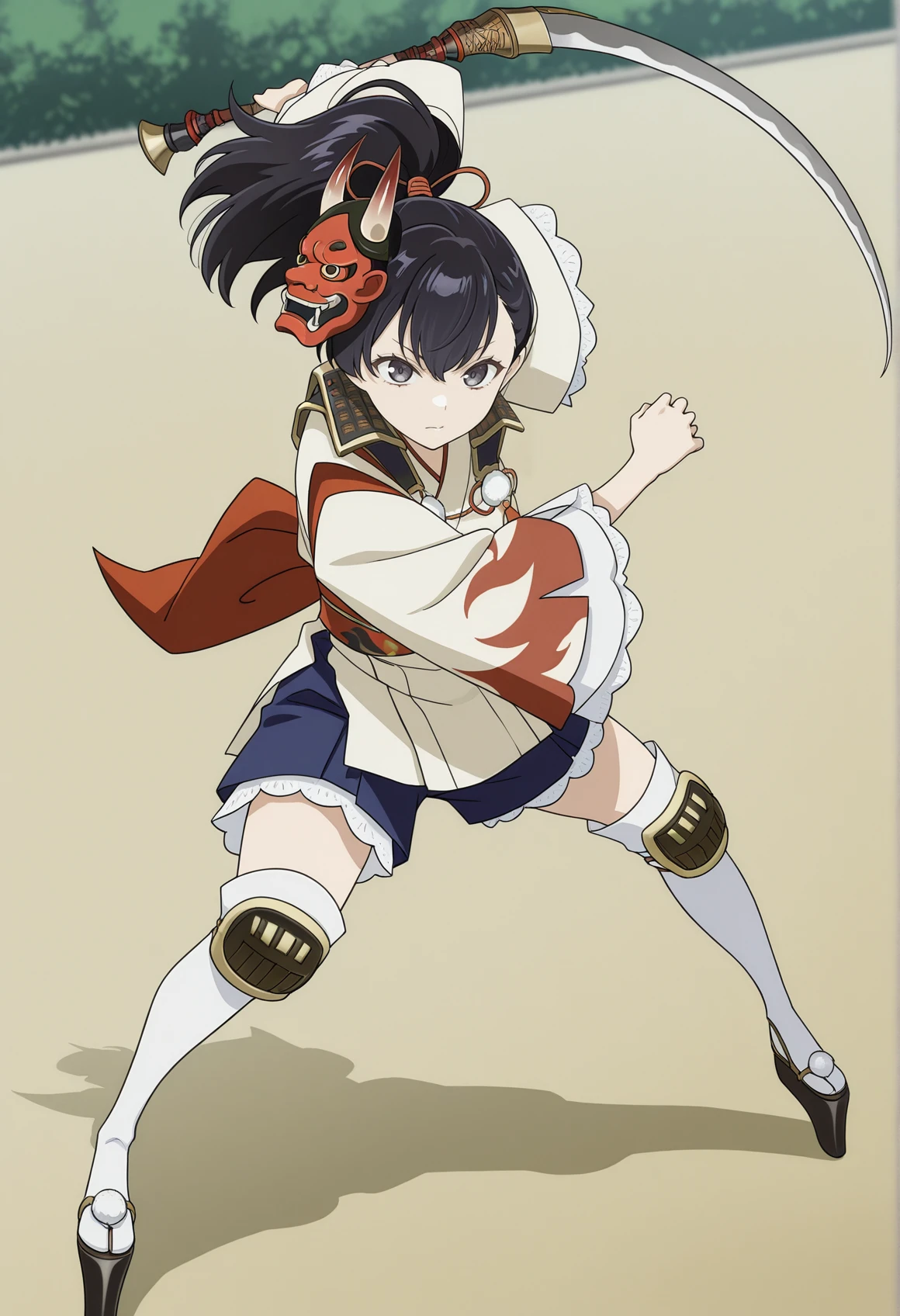 ponytail, black hair, black eyes, hair ribbon, oni mask, mask on head, japanese clothes, pom pom (clothes), wide sleeves, long sleeves, blue shorts, thighhighs, knee pads, platform footwear