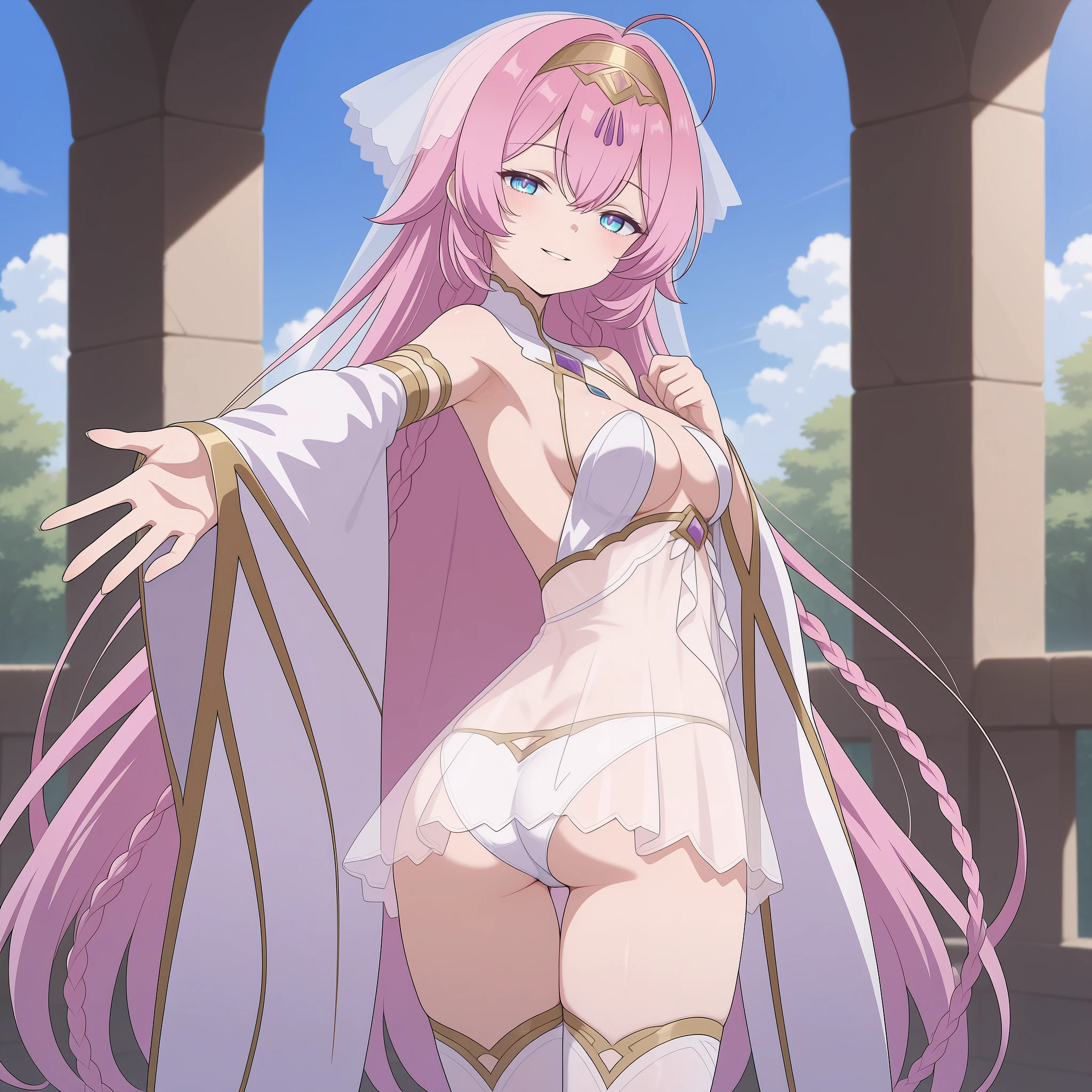 **Note: Her eyes can be a bit messy on some perspectives other than close-ups. I'd probably recommend using Eye Detailer.Outfit and everything else: gold headband, purple hair ornament, veil, revealing clothes, detached sleeves, wide sleeves, detached high collar, see-through mid-split chemise, white thighhighs, barefoot