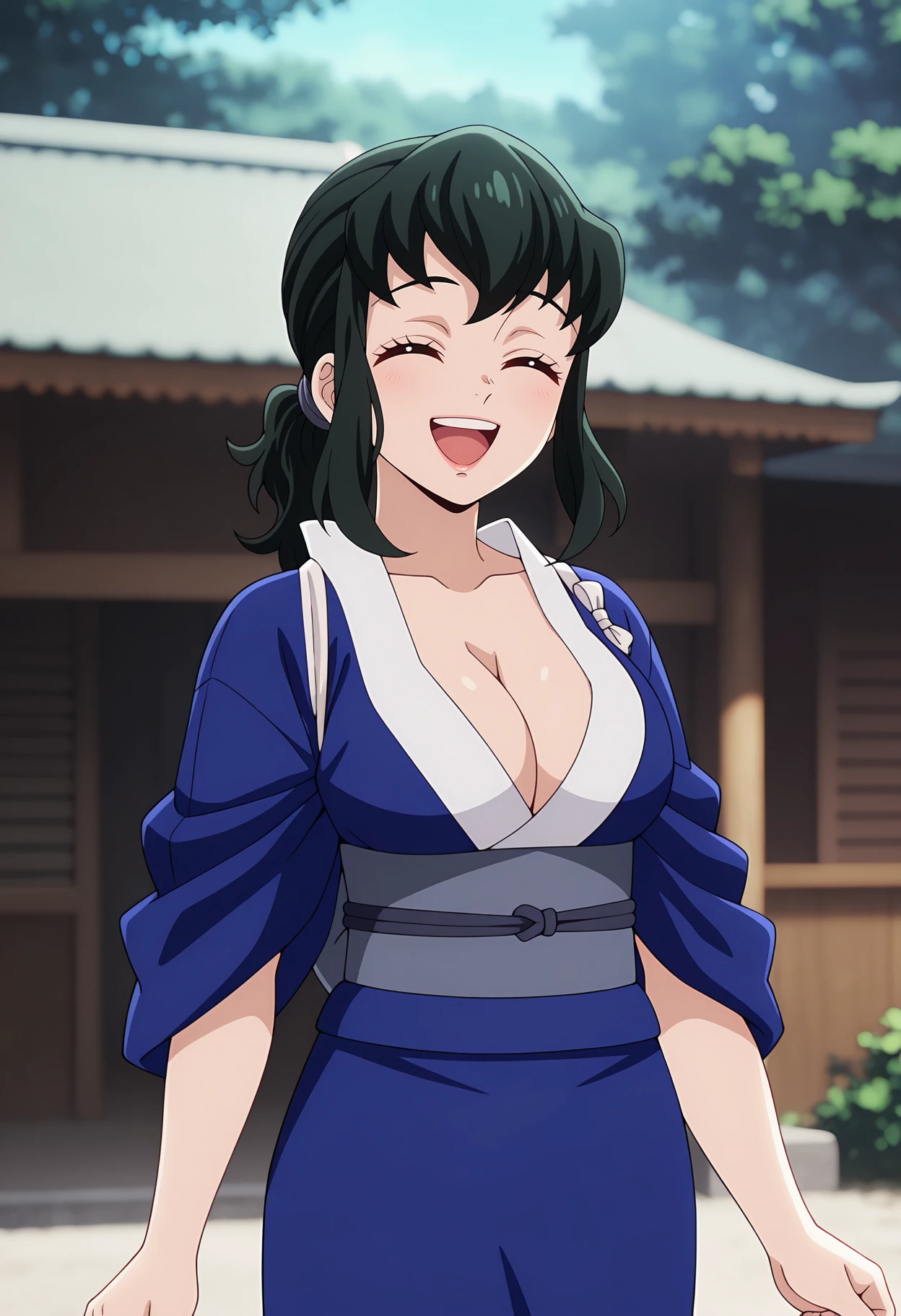 SumaKimono, long kimono, blue kimono, cleavage, large breasts, sleeves rolled up, grey sash