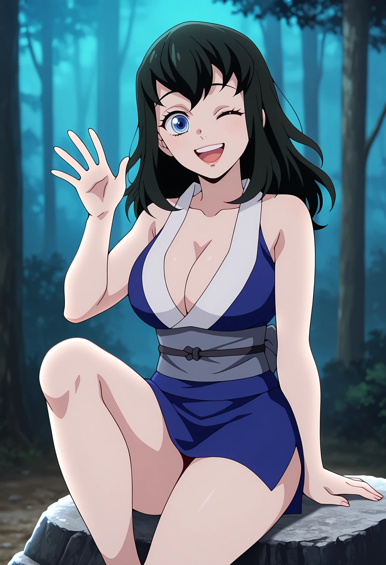 SumaNinja, sleeveless kimono, short kimono, blue kimono, cleavage, large breasts, grey sash
