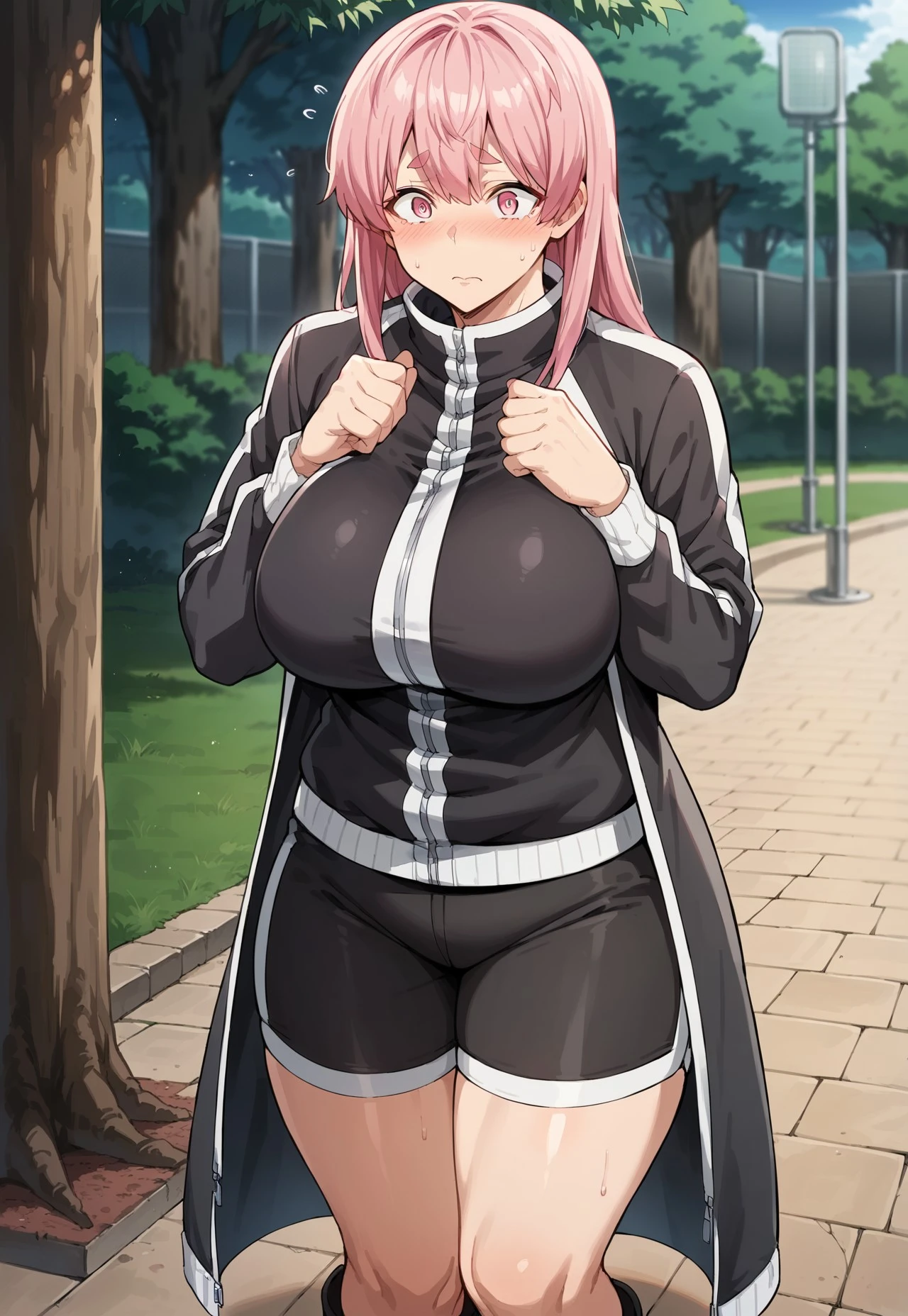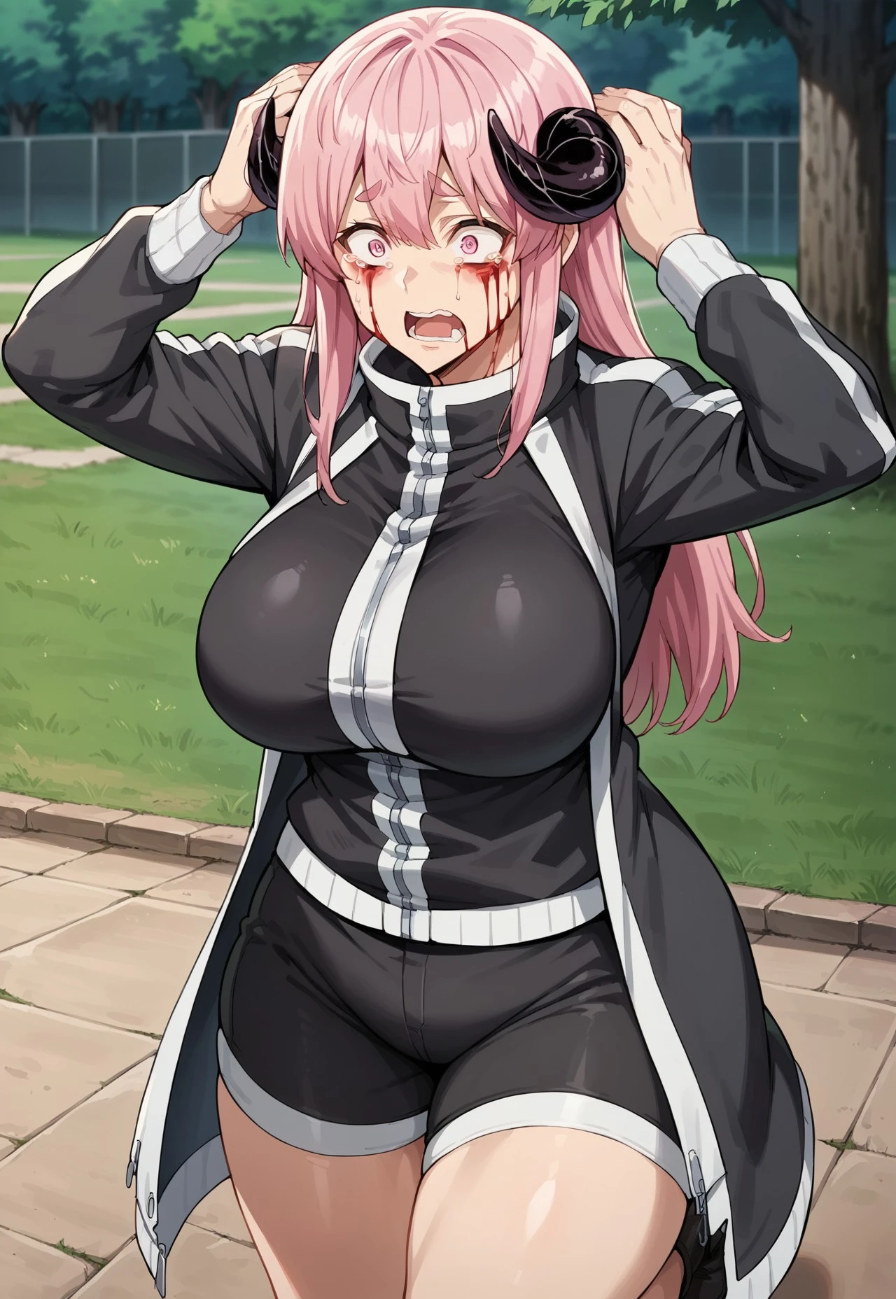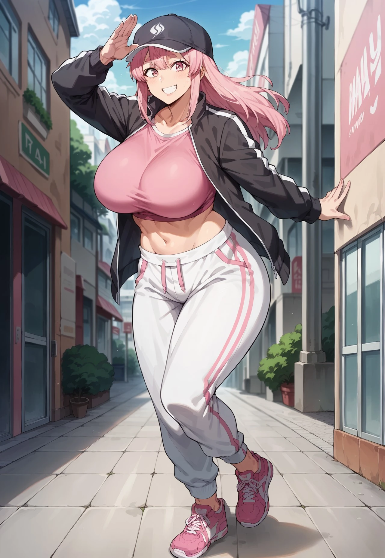 pink crop top, white sweatpants, black cap, black jacket, sneakers, Now in addition you may use bloody tears trigger words, but making her cry makes me sad too so don't.