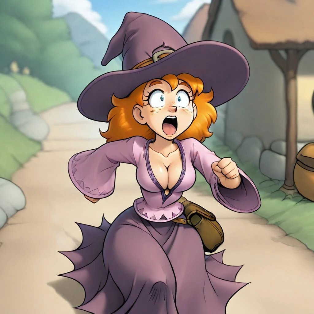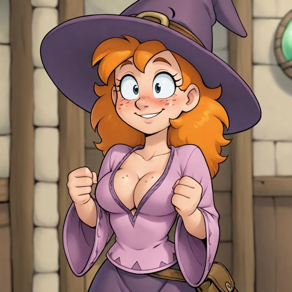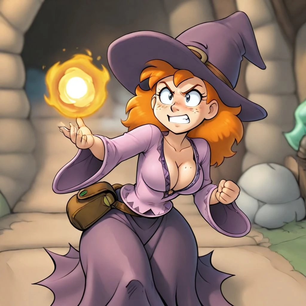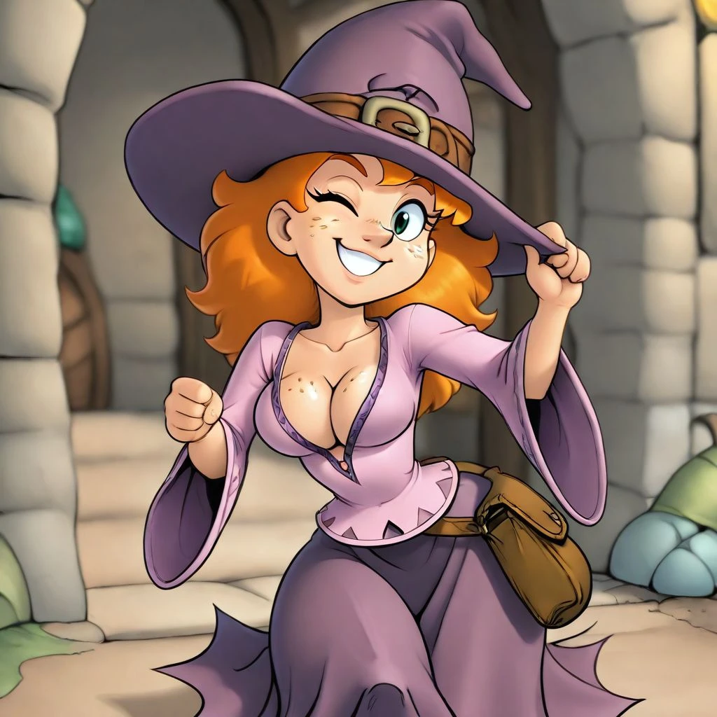 magicienne_naheulbeuk, smiling, witch hat, belt, witch shirt, witch pants, ginger, staff, cleavage, satchel, freckles, large sleeves,