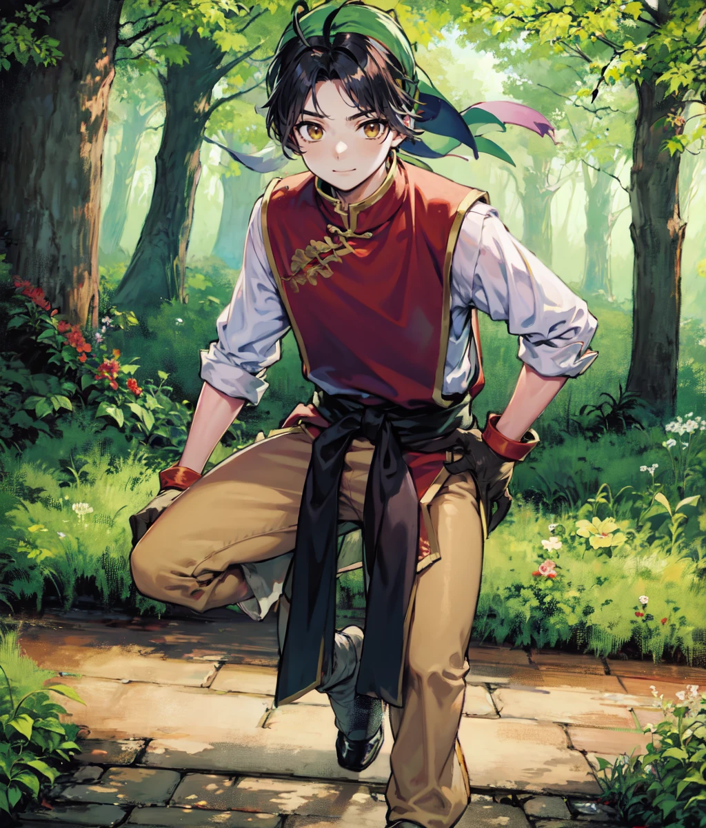 Notable tags: black hair, bandana, chinese clothes, red shirt, white sleeves, yellow pants,