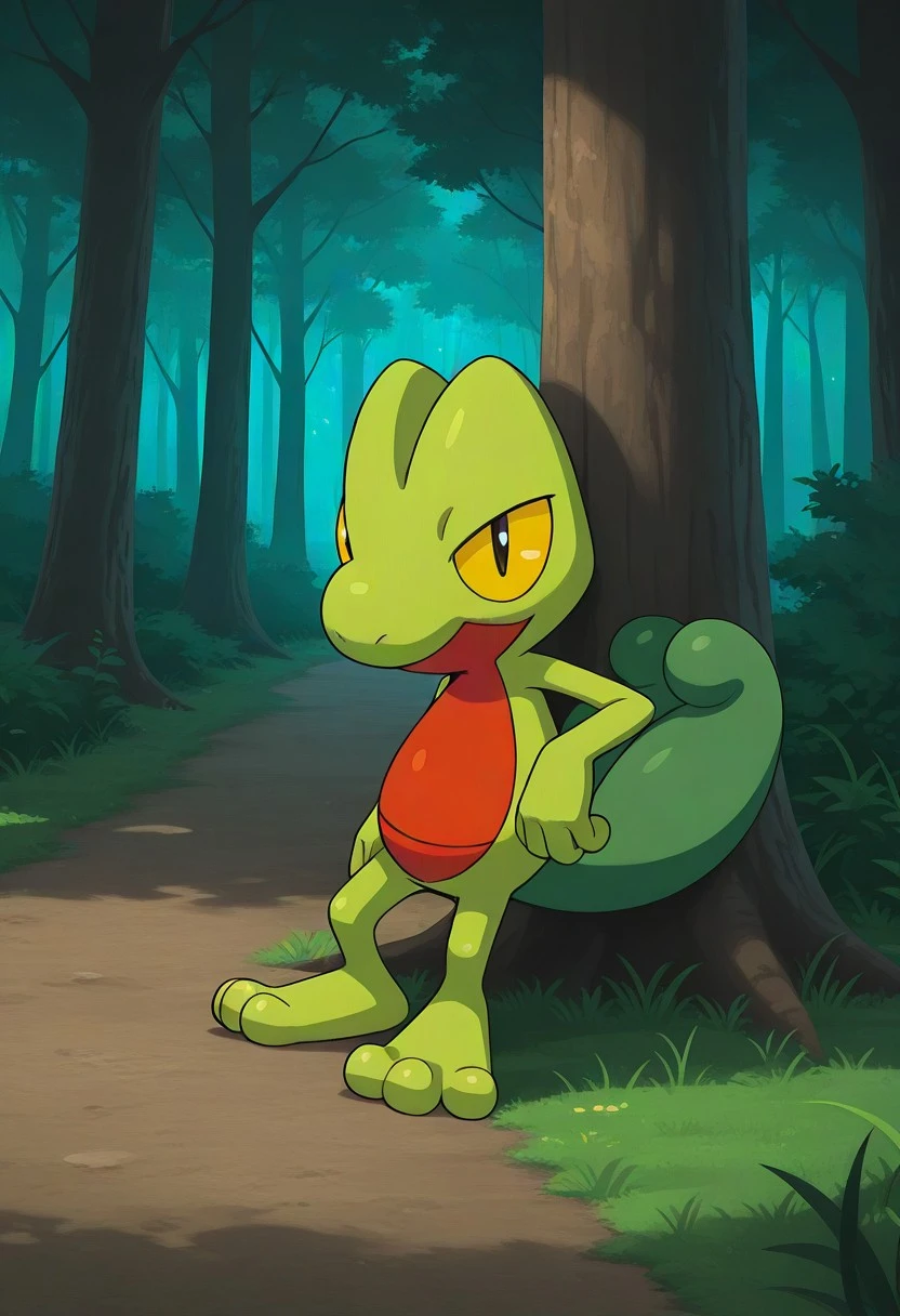 Treecko, green skin, yellow sclera, black pupils, green tail, webbed feet