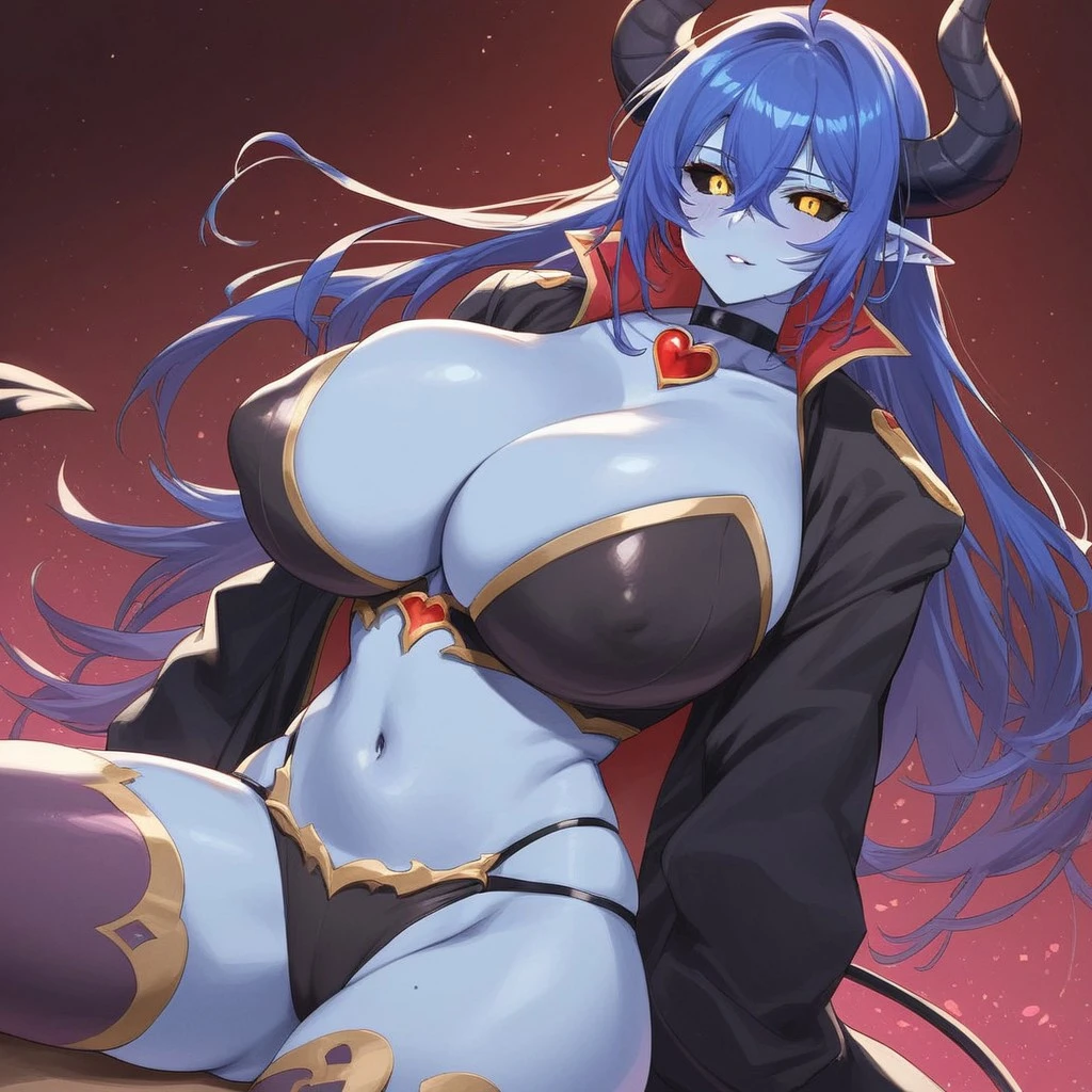 1girl,Asmodeus, demon girl,Milf,black sclera, breasts, colored sclera, horns, blue skin, colored skin,blue hair, yellow eyes, pointy ears, huge breasts, long hair, demon tail, cleavage, navel, covered ???????, demon horns, choker, black jacket, thighhighs, asymmetrical clothes, midriff ,