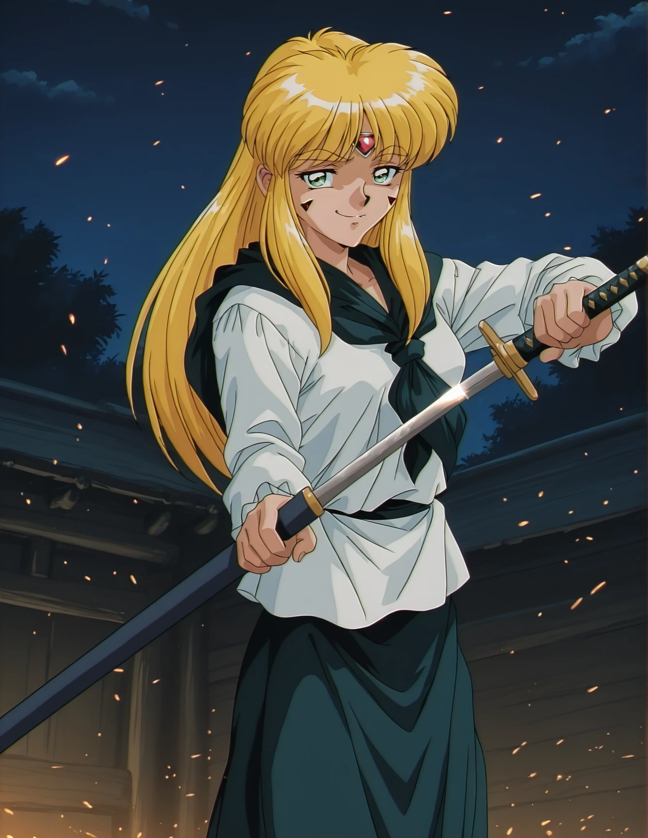 karisu, facial mark, forehead jewel, neckerchief, white shirt, long sleeves, long skirt