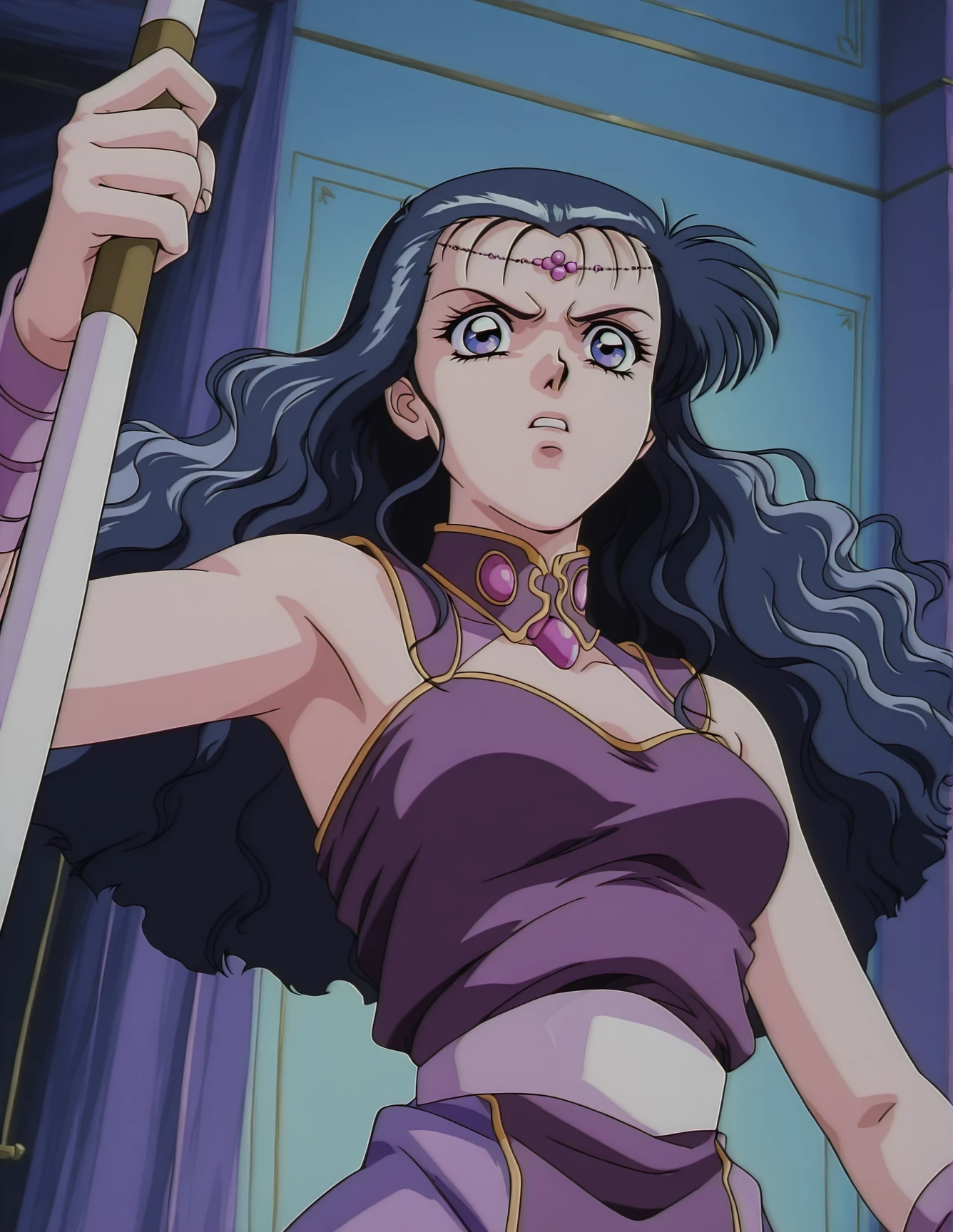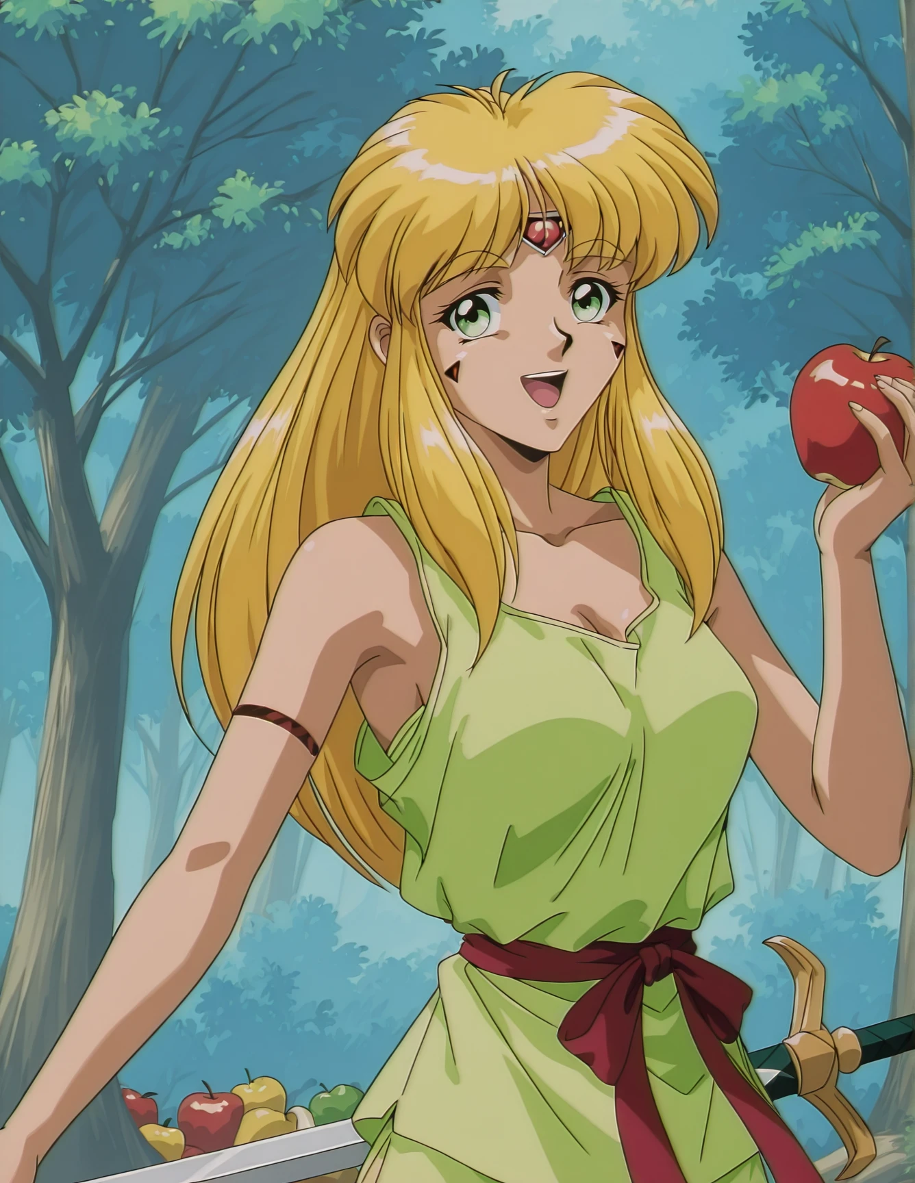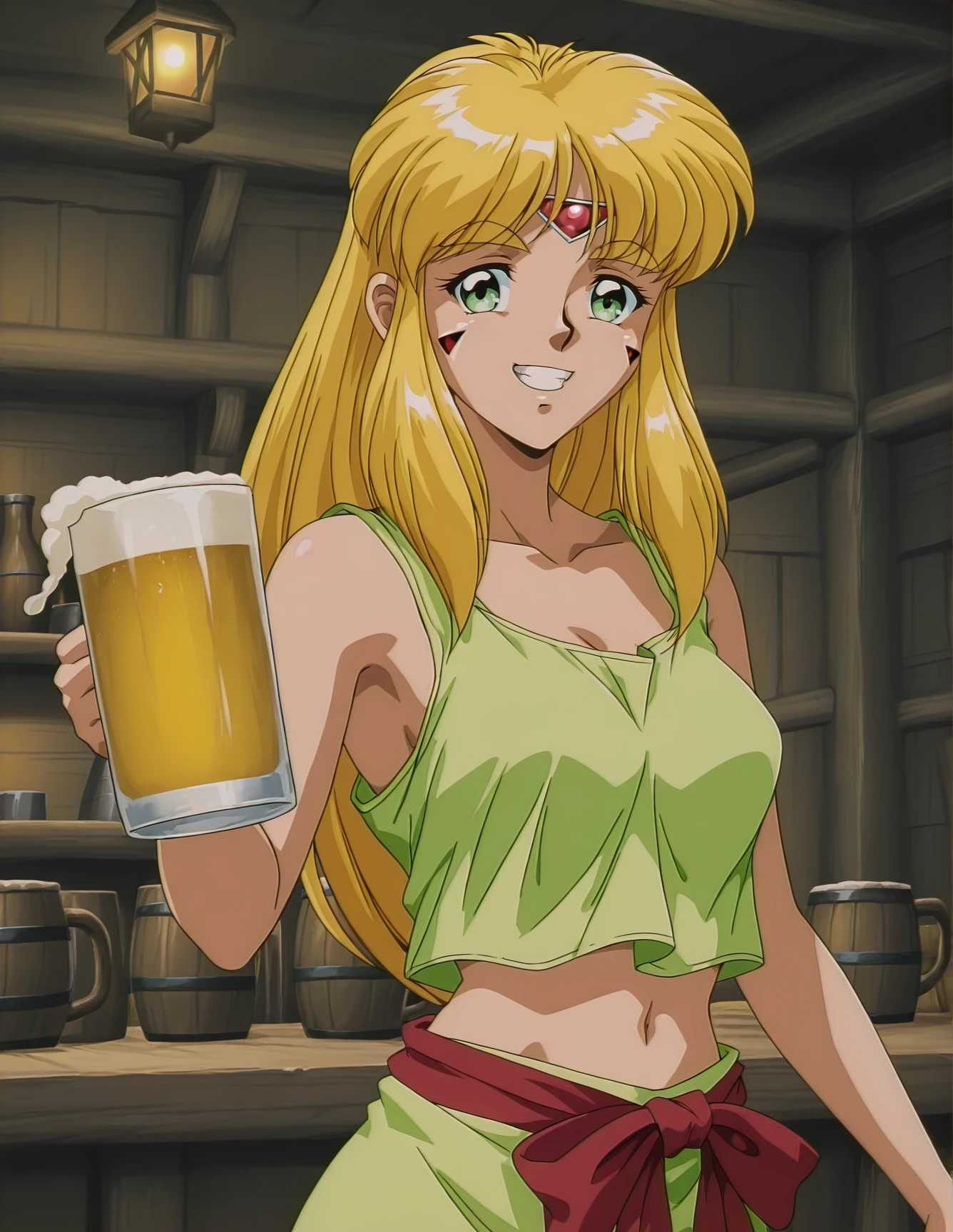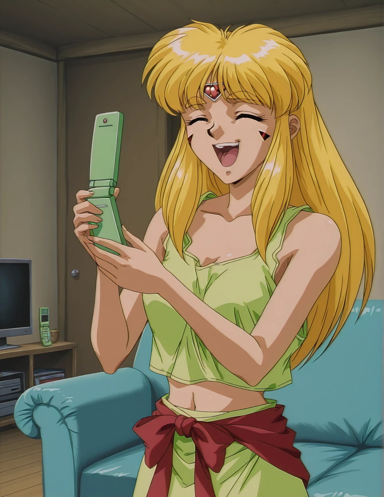 karisu, facial mark, forehead jewel, light green tank top, midriff, red ribbon around waist, light green skirt