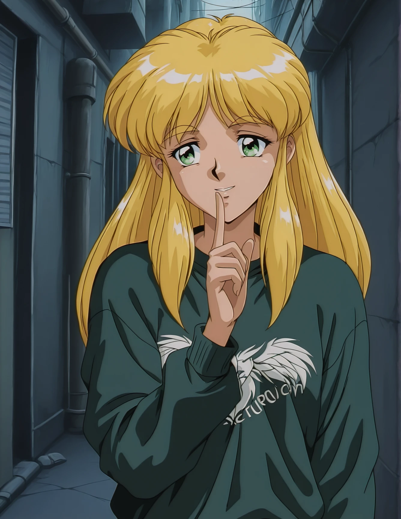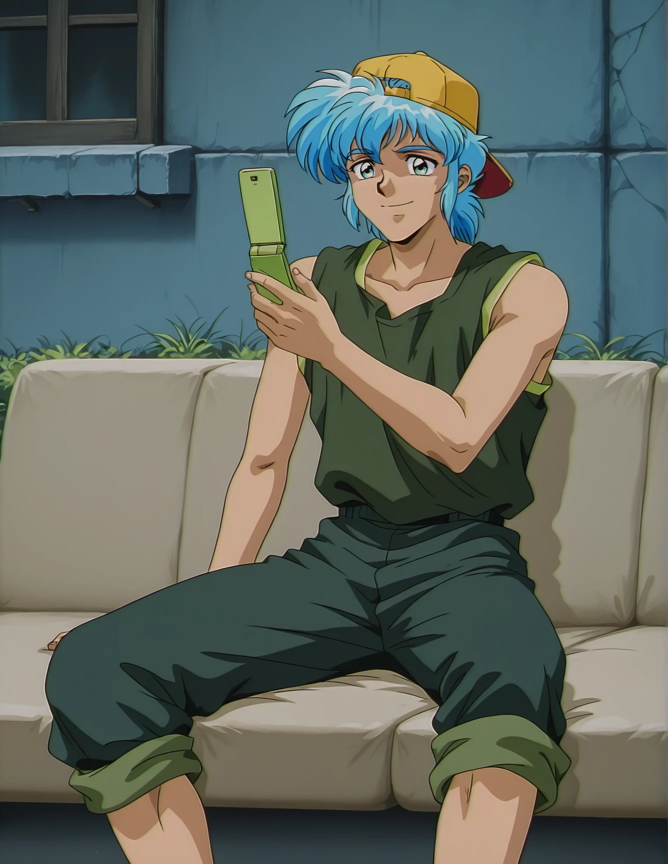 rike, blue hair, dark green sleeveless shirt, dark green pants rolled up