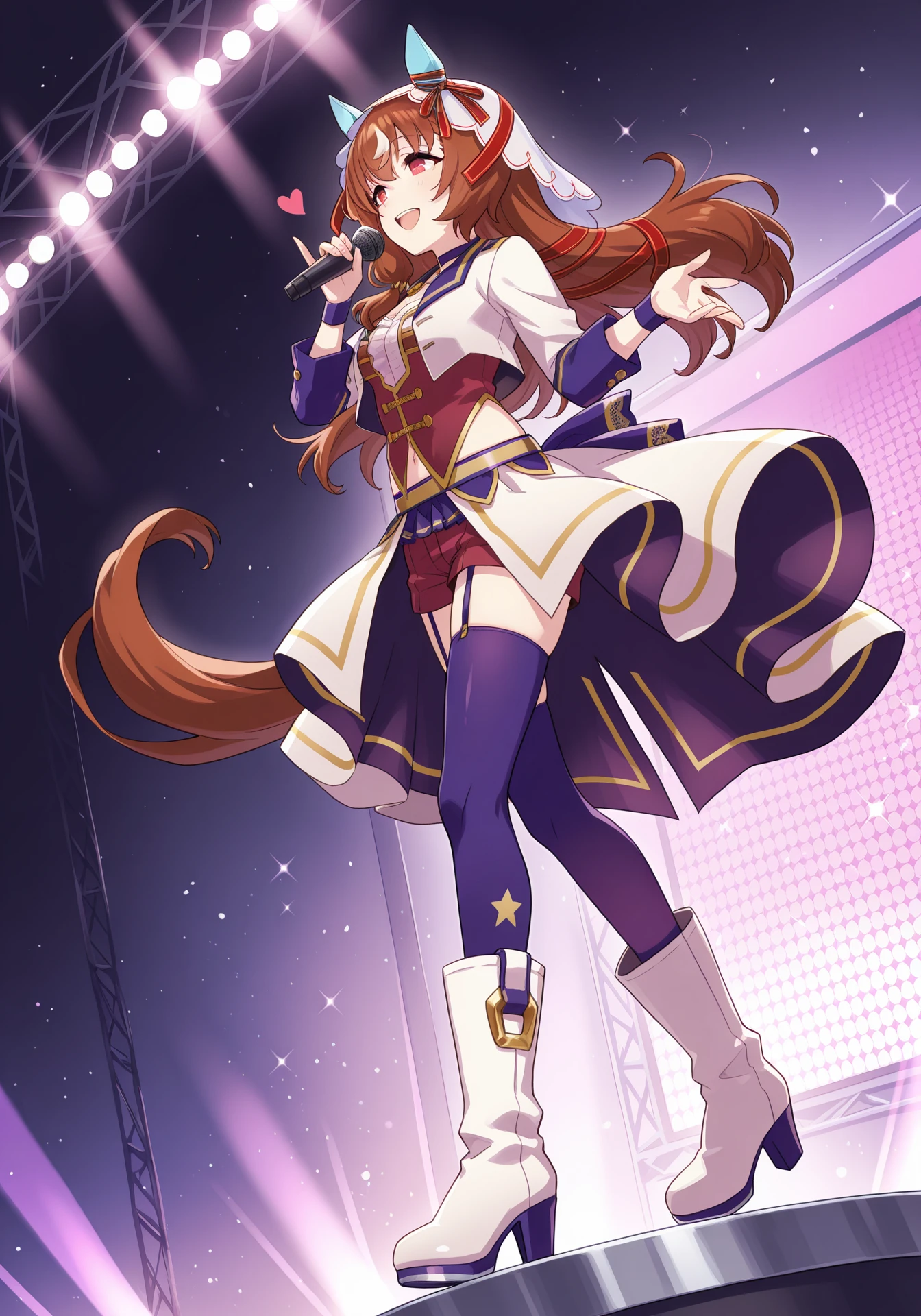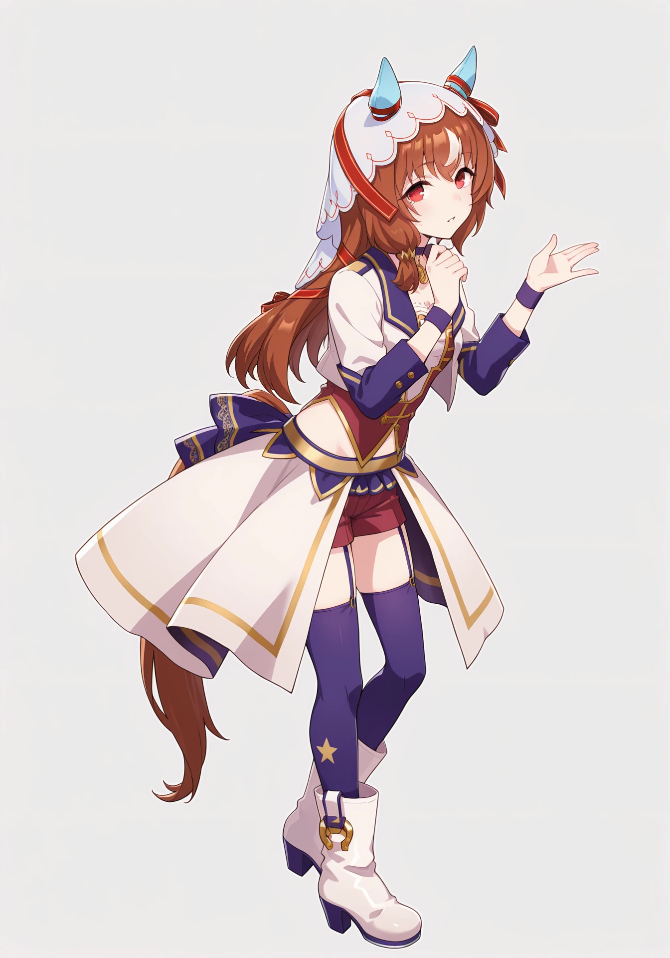 SILstartingFuture,white cropped jacket,dark red shorts,purple choker,garter straps,purple thighhighs,white high heel boots,purple wristband,veil, ear covers, red hair ribbon