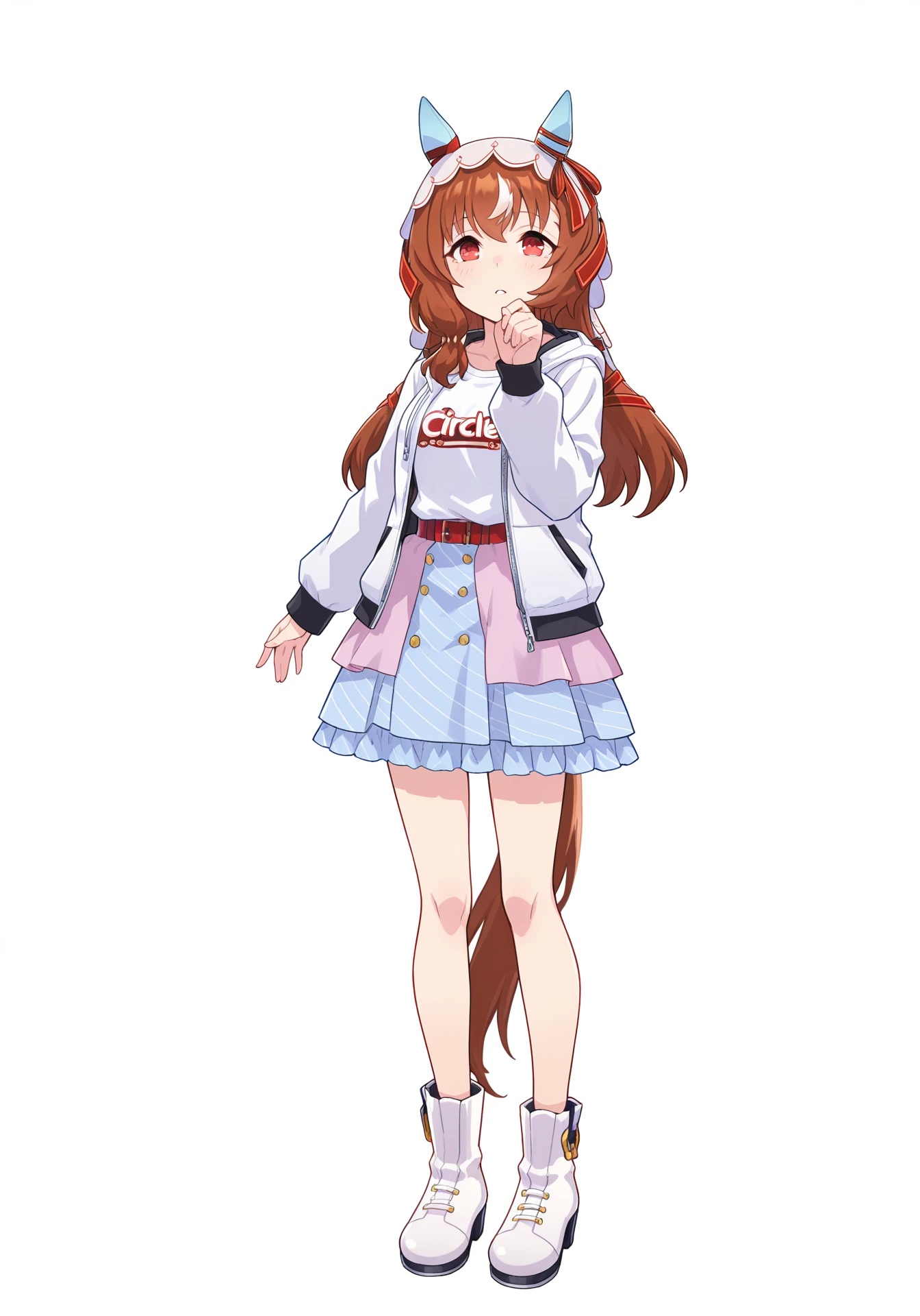 SILtwinkleCircle,white hooded jacket,open jacket,blue frilled skirt,white shirt,white footwear,red belt,veil, ear covers, red hair ribbon