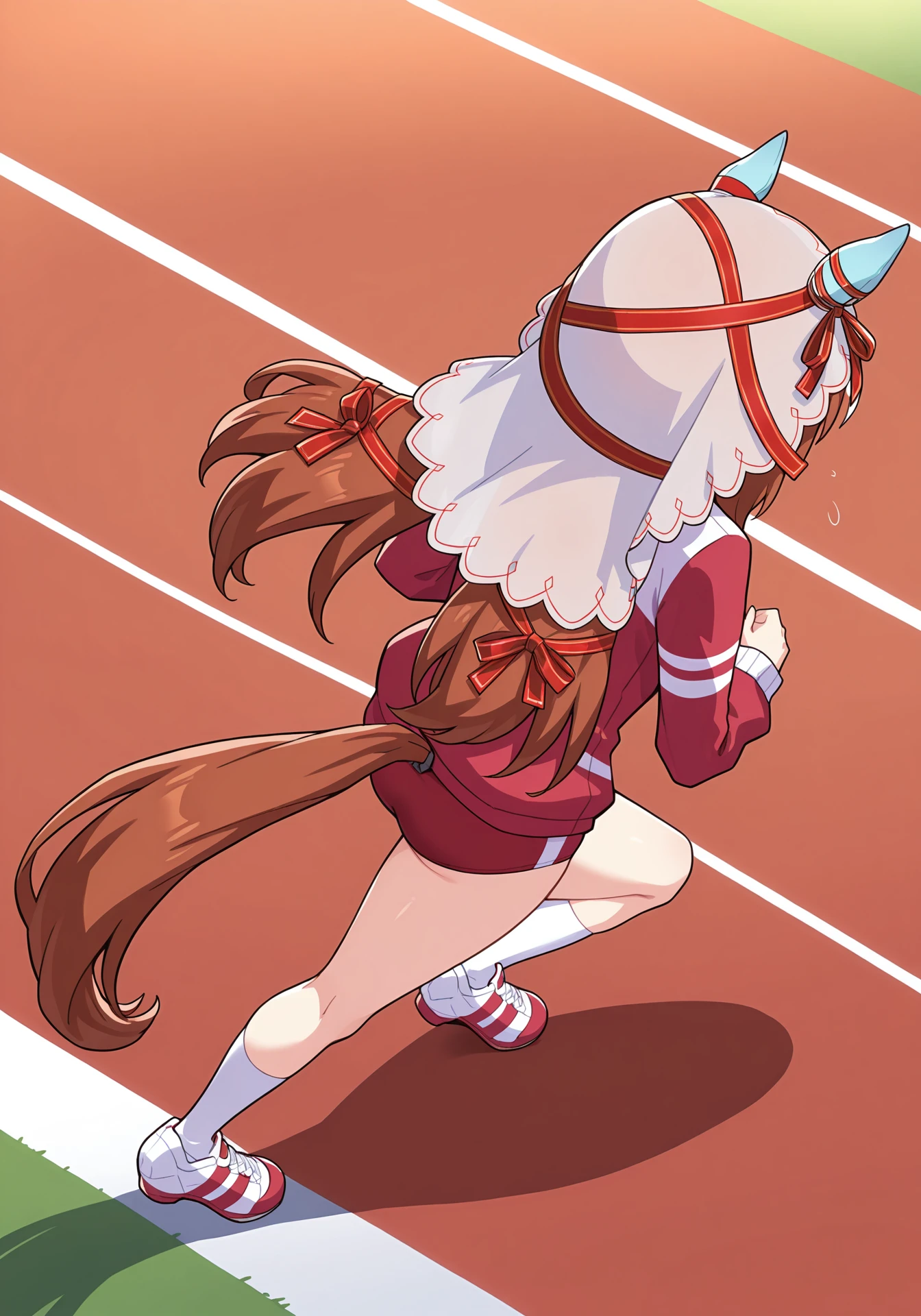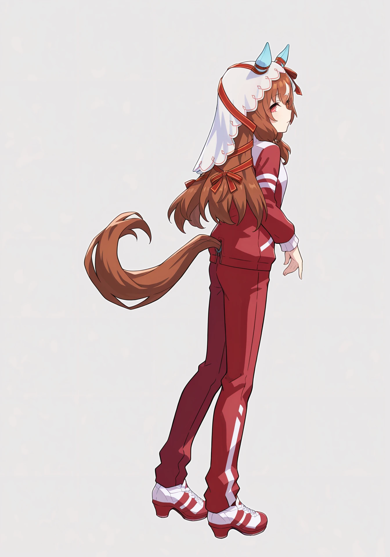 SILtraining,red track jacket,tracen training uniform,red track buruma,white socks,red sneakers,veil, ear covers, red hair ribbon