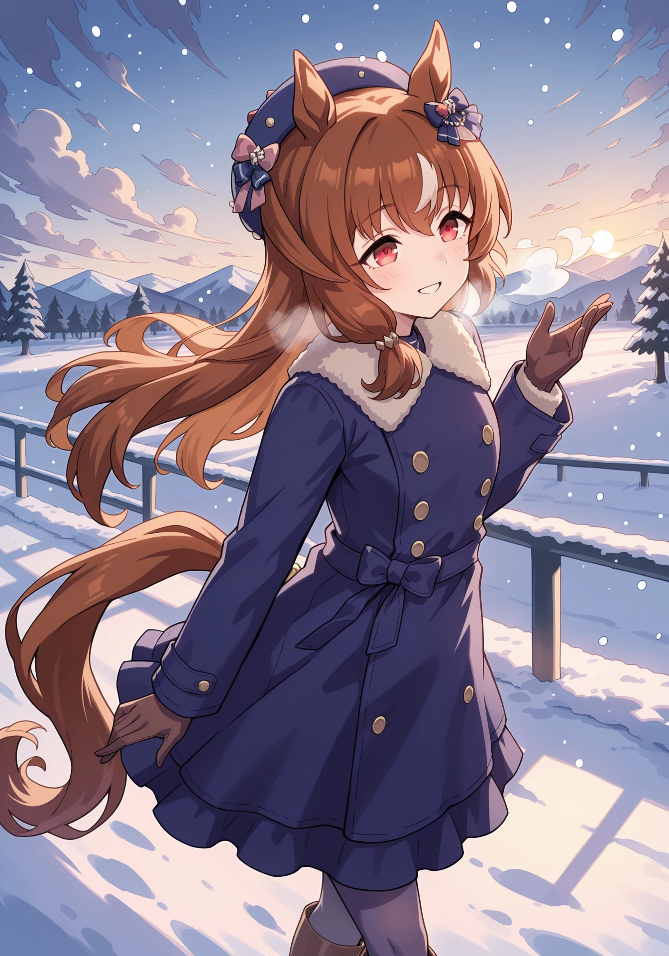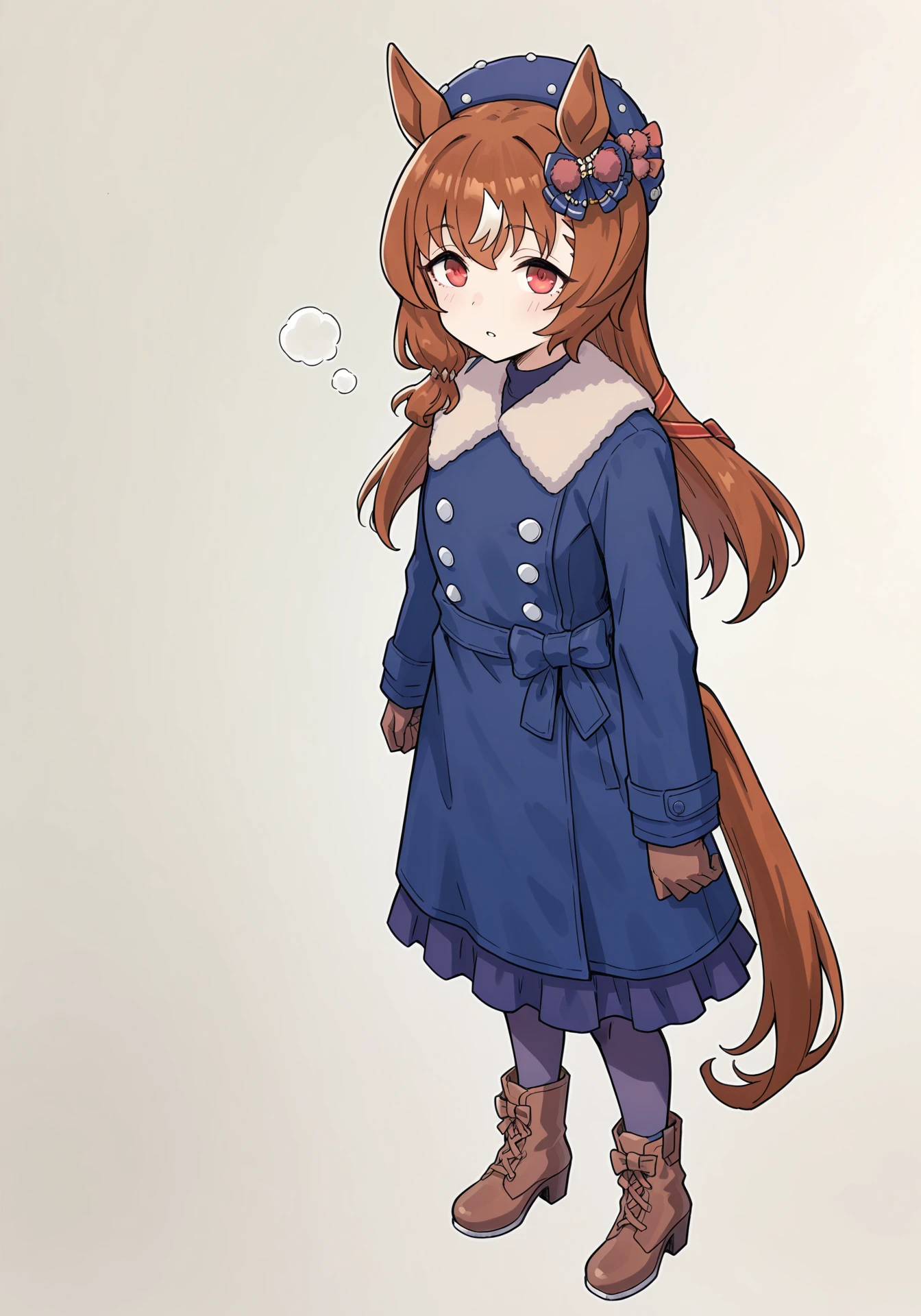 SILwinterExtra,blue coat,blue beret,blue ear ornament,brown gloves,fur trim,brown boots,blue bow,grey pantyhose,buttons