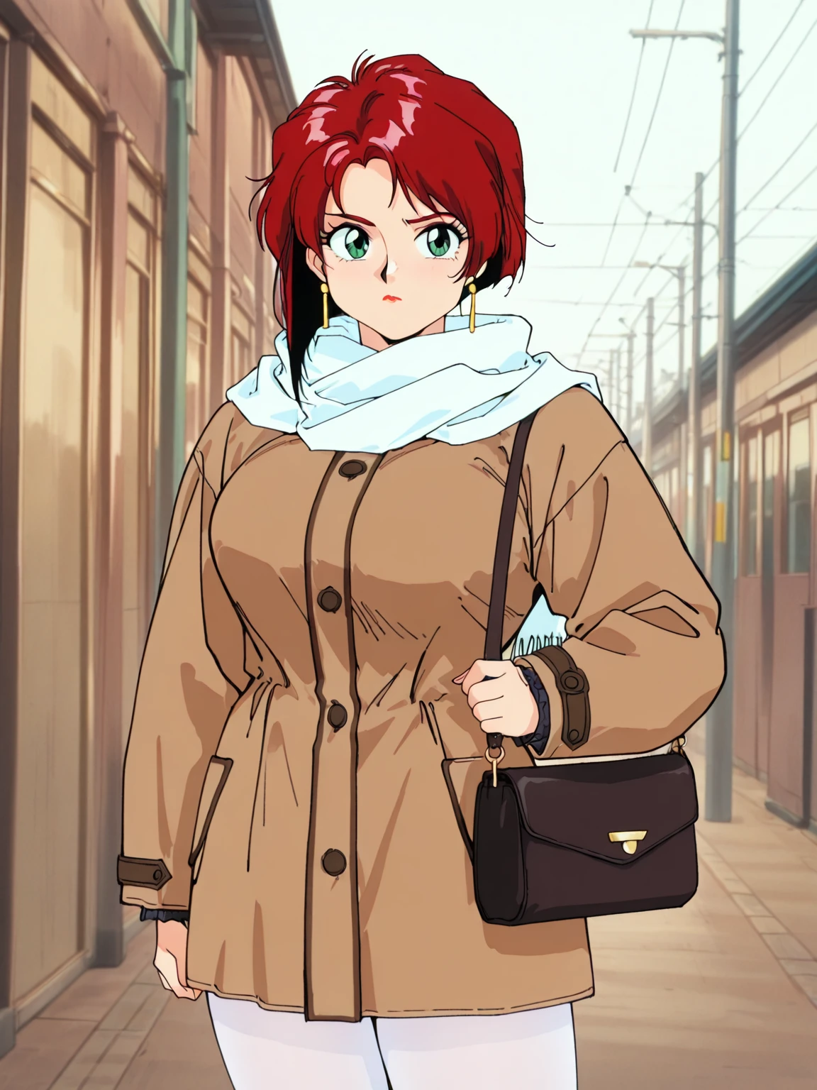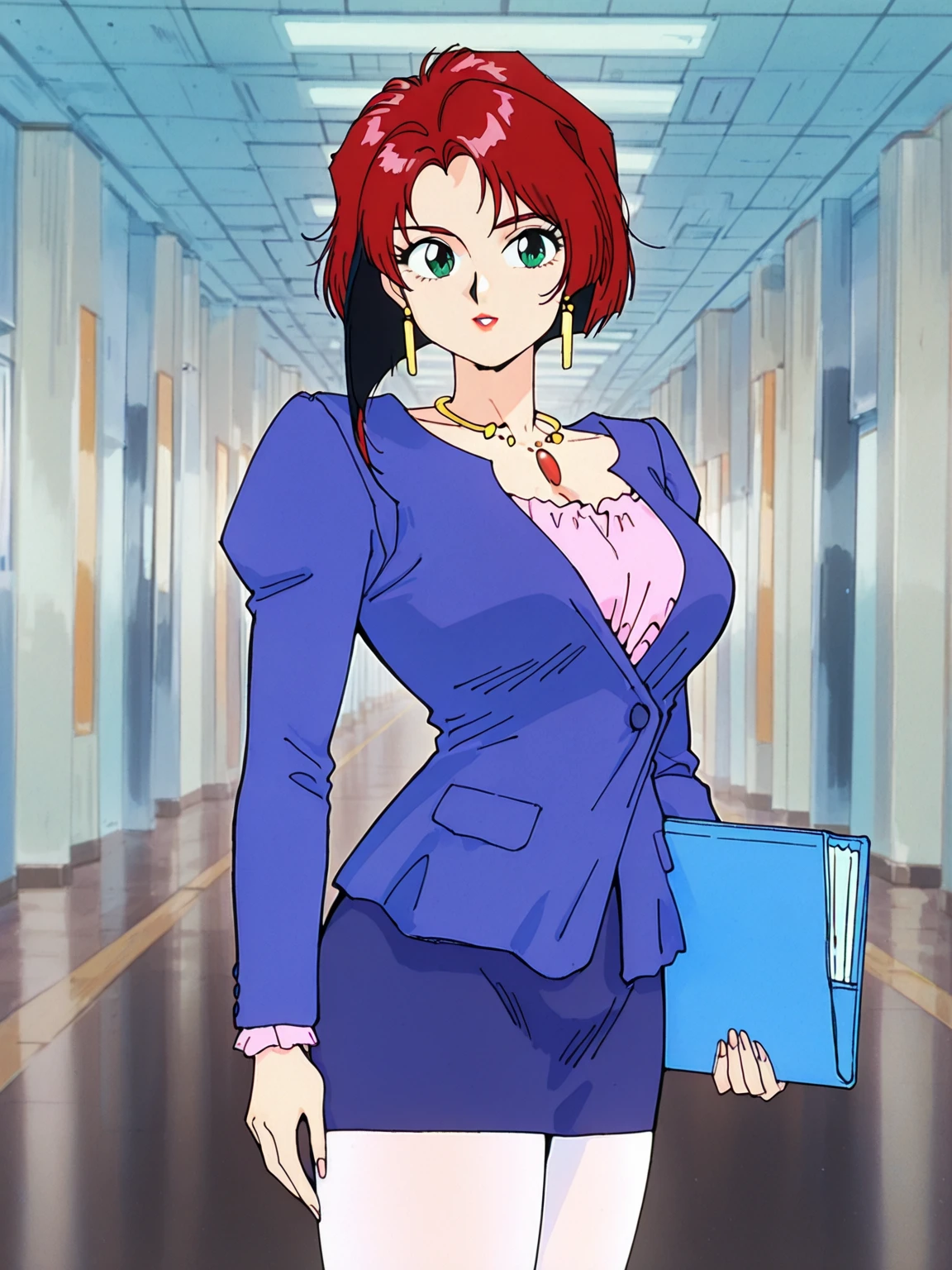 1girl, solo, matsubara izumi, yuusha tokkyuu might gaine, anime coloring, retro artstyle, 1990s \(style\), general, office, folder, looking at viewer, red hair, black hair, green eyes, red lips, shiny lips, ?????????????, thick thighs, purple jacket, pink shirt, pencil skirt, miniskirt, purple skirt, white pantyhose, yellow earrings, red necklaceDescription