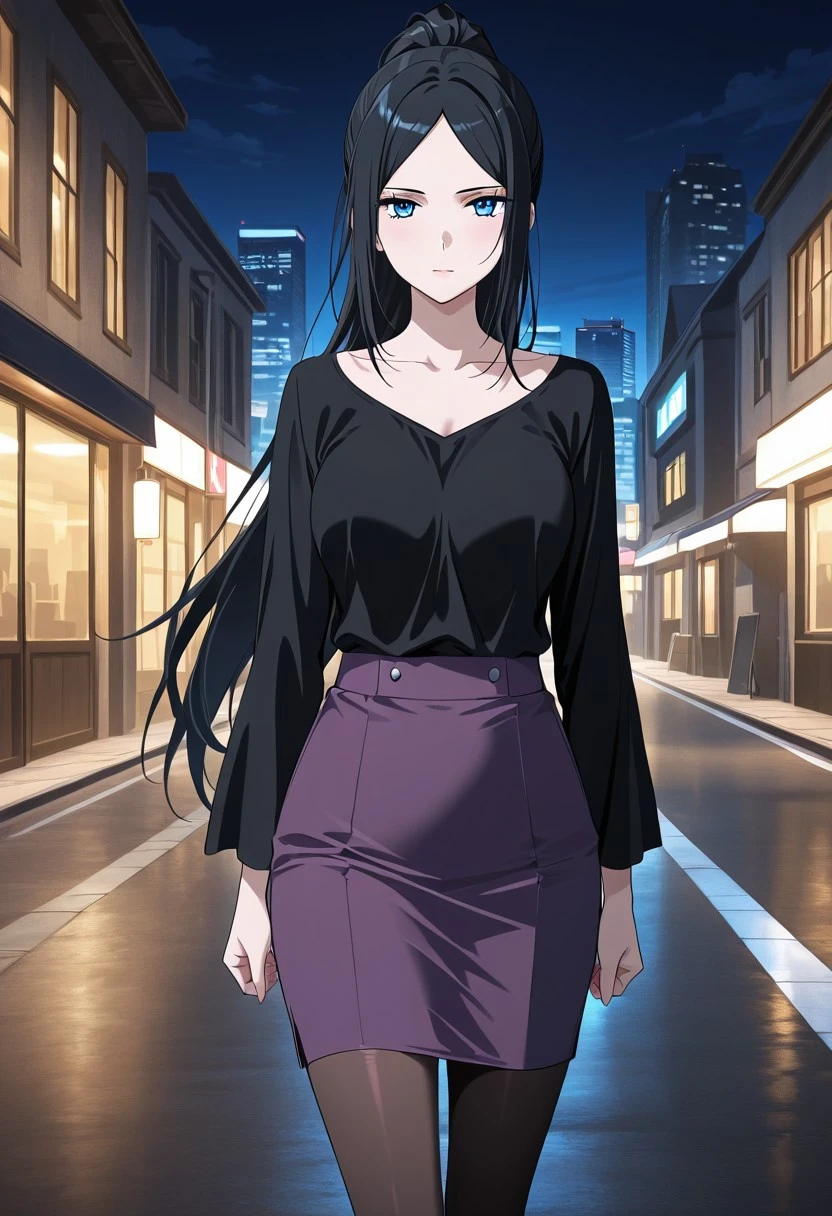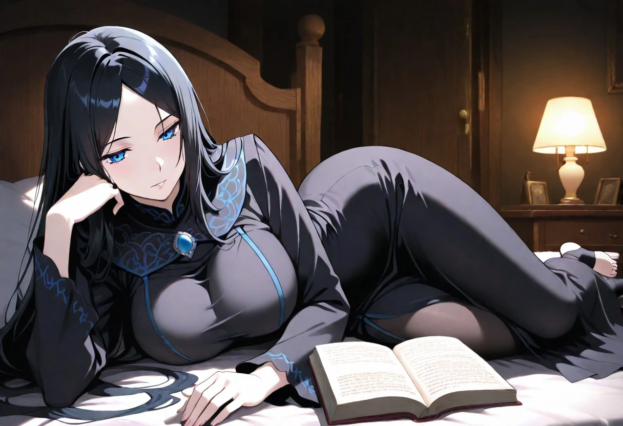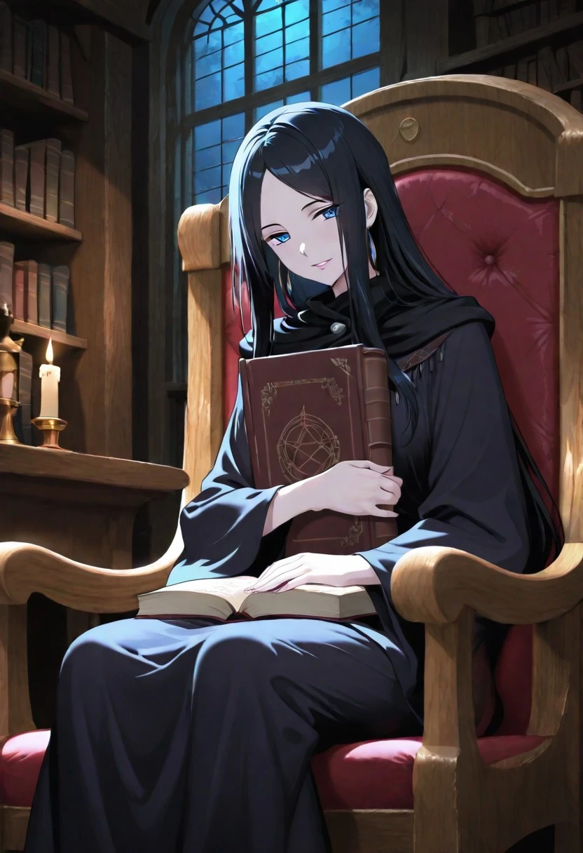 1girl, solo, DianRubens, blue eyes, black hair, long hair, pale skinned female, pink lipstick, long simple dress, dark dress, long sleeves, black cape