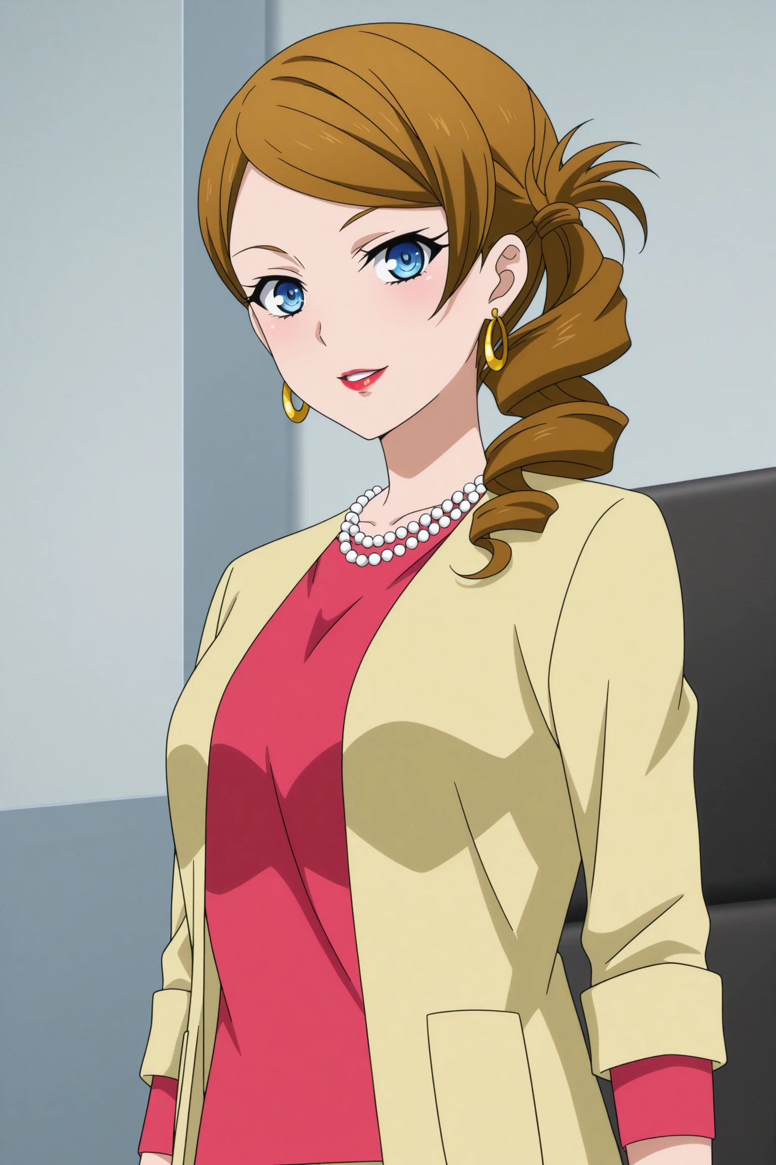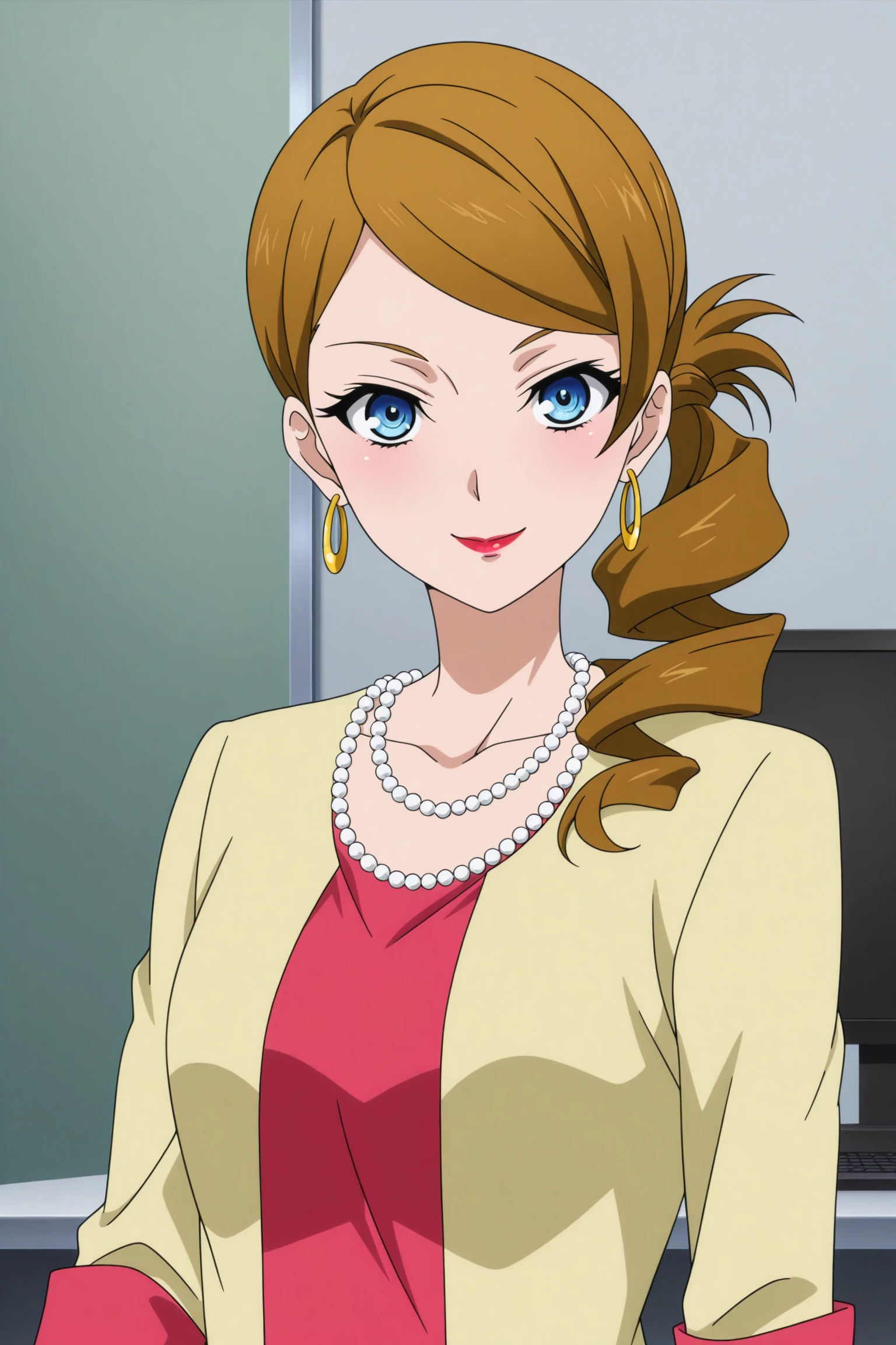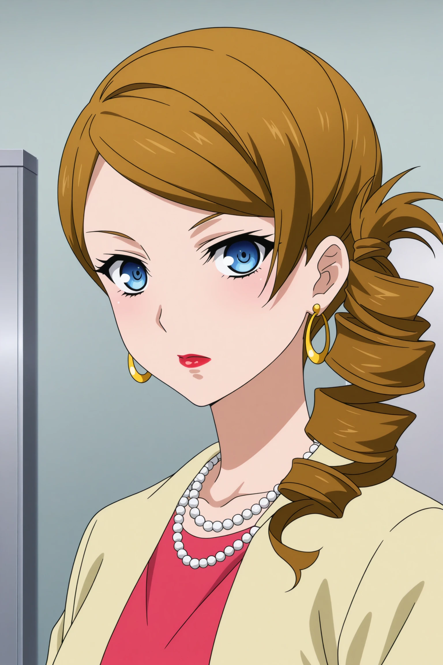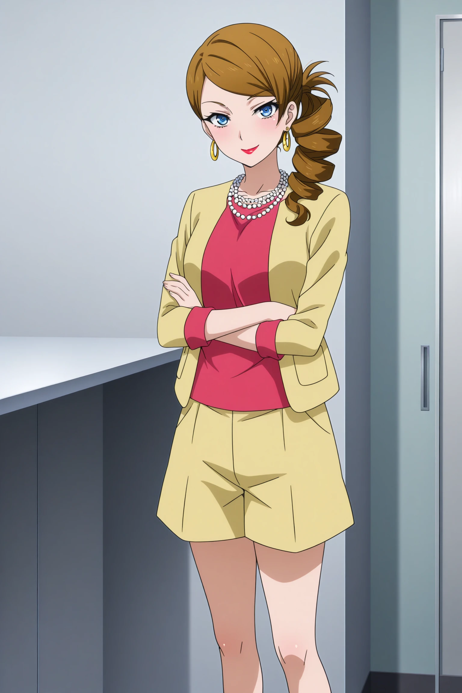 kominato eriko, long hair, brown hair, parted bangs, side ponytail, drill ponytail, blue eyes, makeup, red lips, pearl necklace, hoop earrings, yellow jacket, sleeves past elbows, pink shirt, yellow shorts, white footwear, high heelsSeason 2 costumes