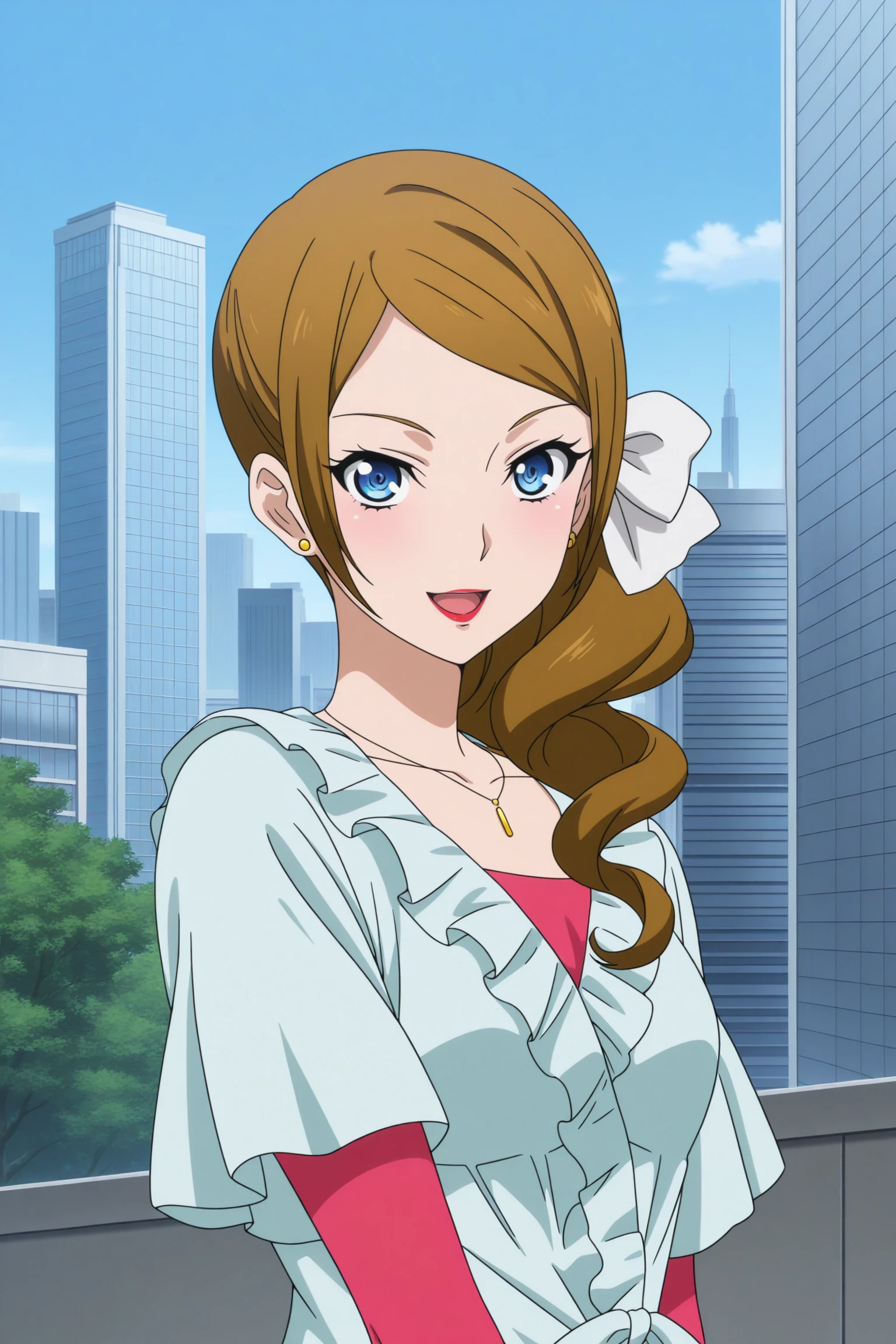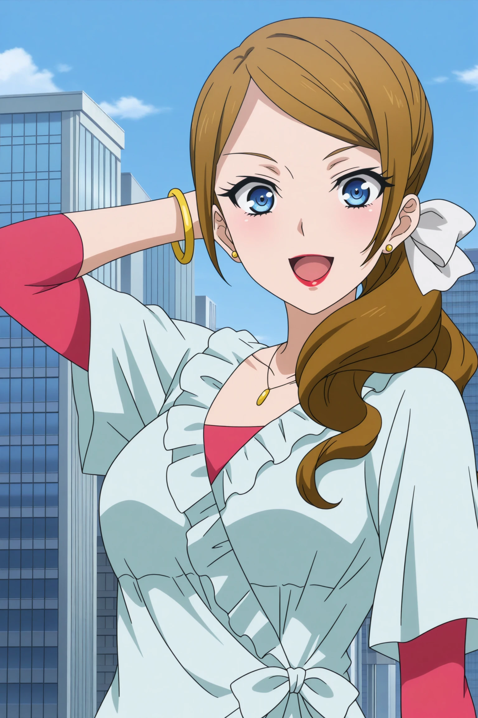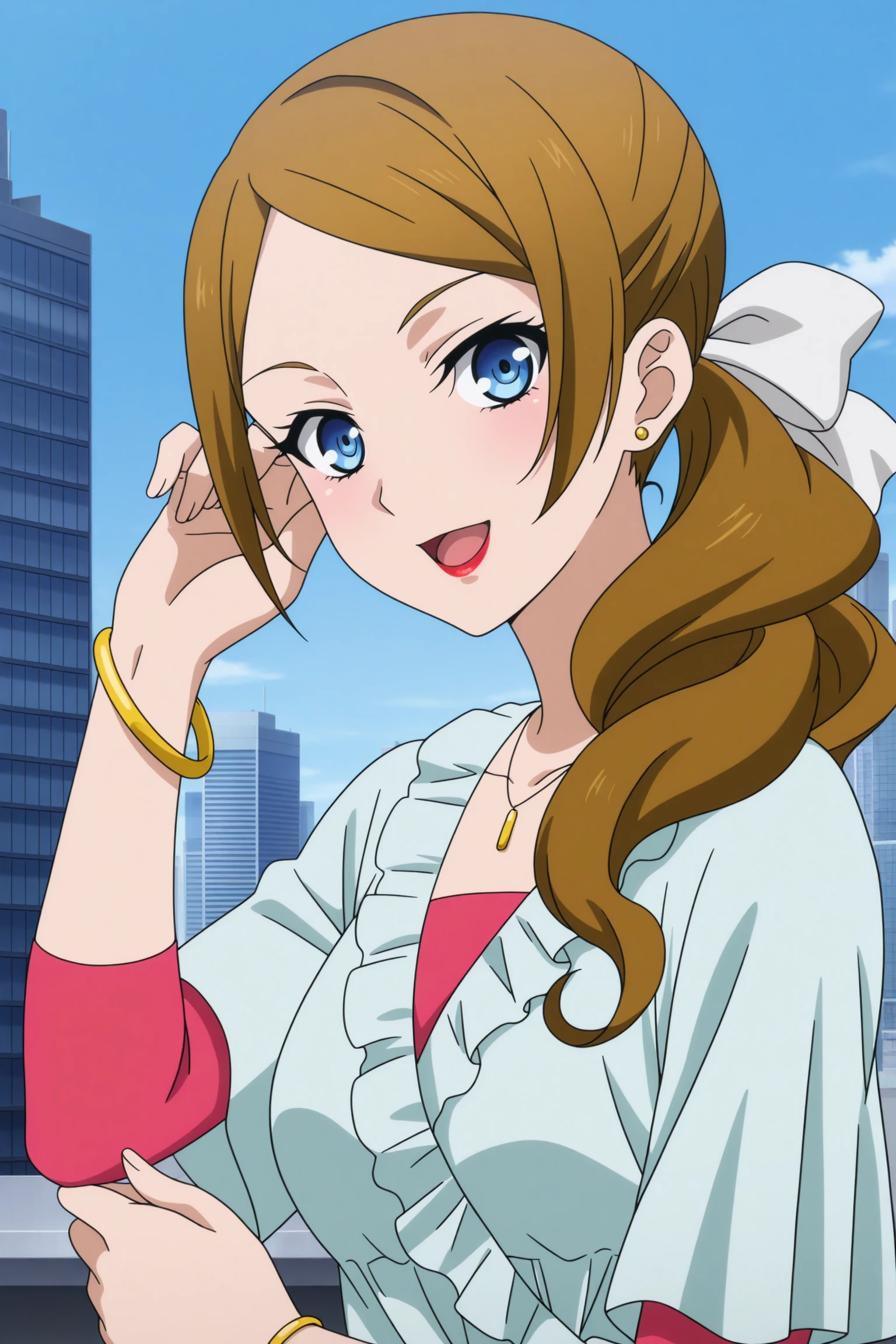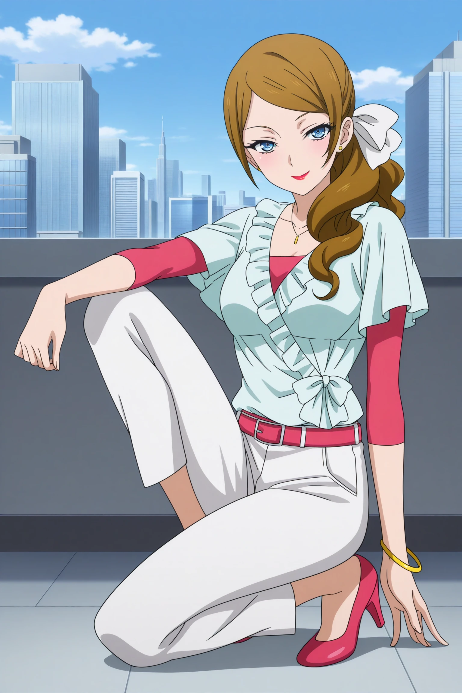 kominato eriko, long hair, brown hair, parted bangs, sidelocks, side ponytail, drill ponytail, white hair ribbon, blue eyes, makeup, red lips, necklace, stud earrings, green blouse, short sleeves, pink shirt, sleeves past elbows, bracelet, pink belt, white pants, pink footwear, high heelsNOTE