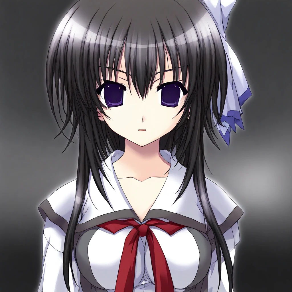 sui2:iysui,black hair,long hair, bangs,hair ribbon,purple eyes,large breasts,,school uniform, serafuku,long sleeves,pleated skirt,,black pantyhose,,