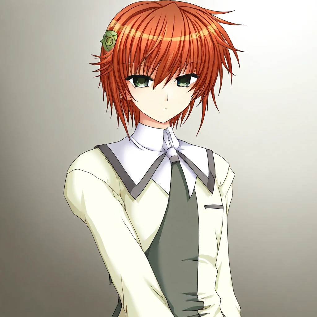 takeru:iytakeru,red hair,short hair,hairclip,hair ornament,green eyes,medium breasts,glasses,