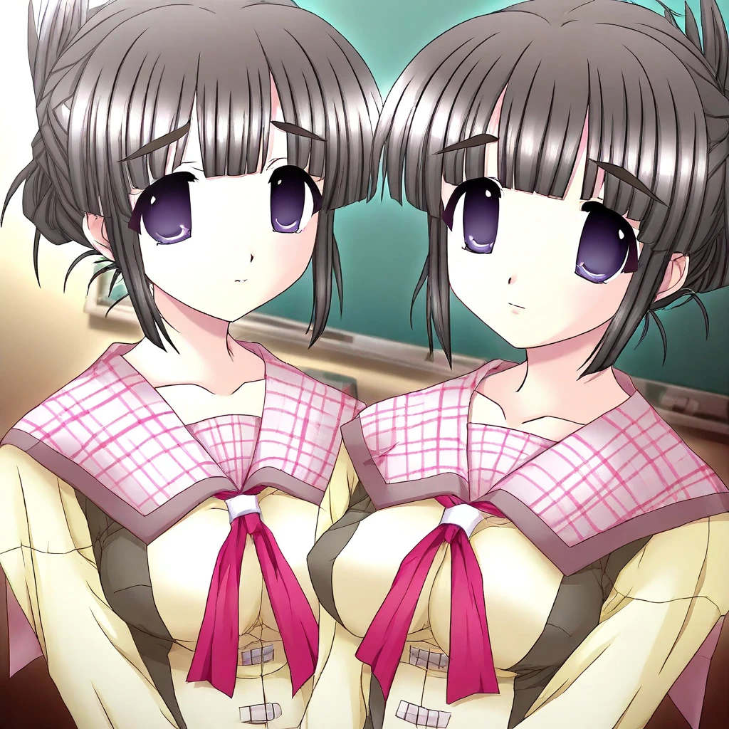 sui1:iysui,black hair,folded ponytail,bangs,,purple eyes,large breasts,,school uniform,checkered_clothes ,pleated skirt,,black pantyhose,