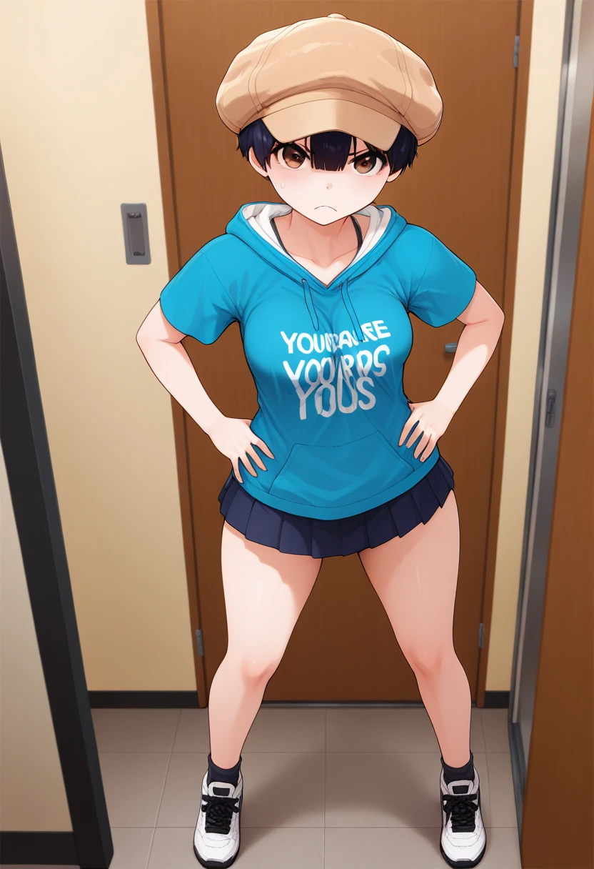 cabbie hat, clothes writing, hoodie, hood, hood down, short sleeves, miniskirt, socks, shoes,