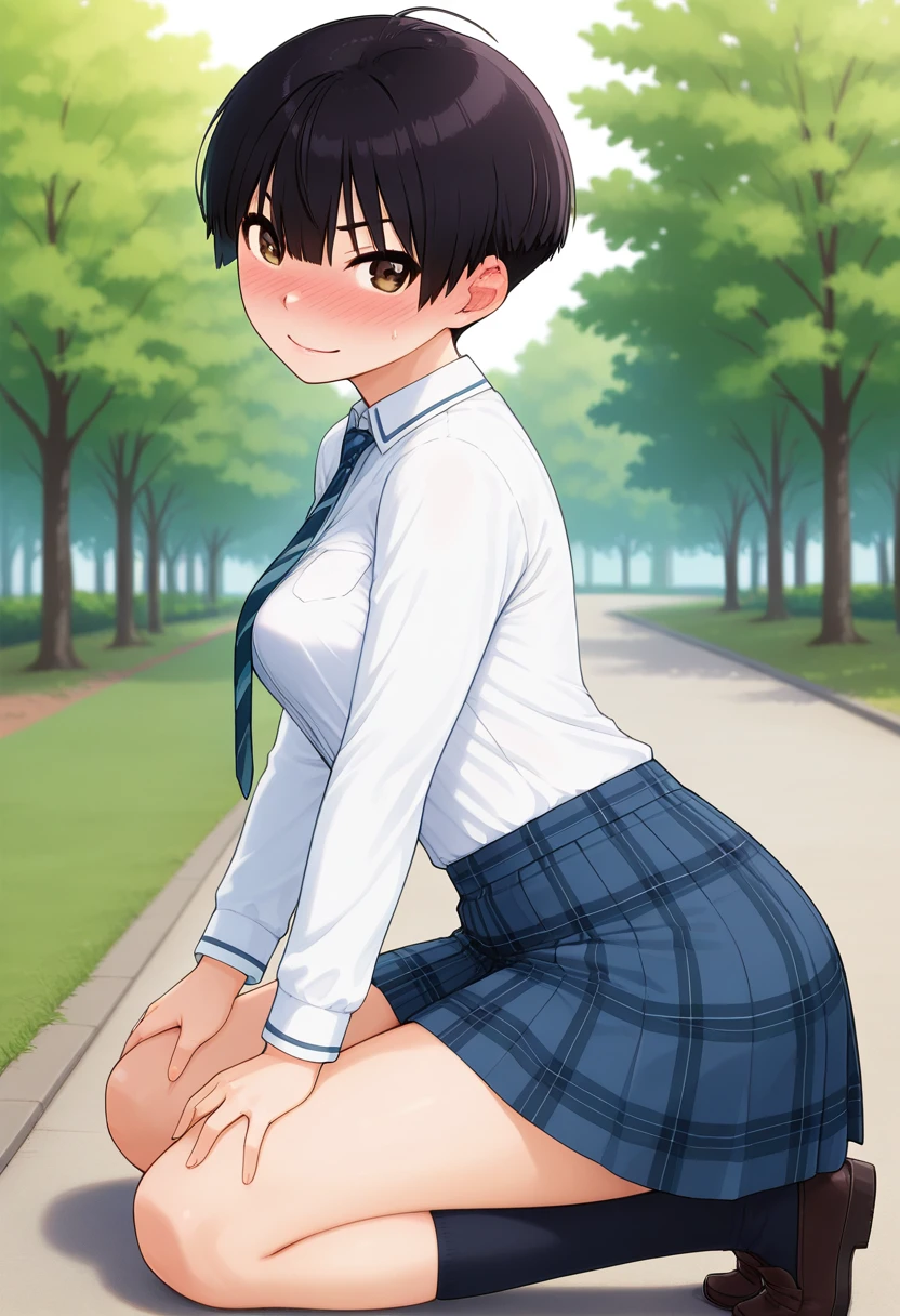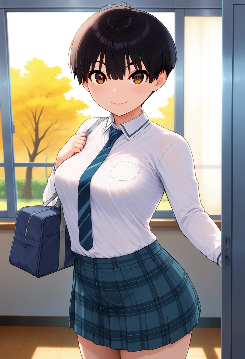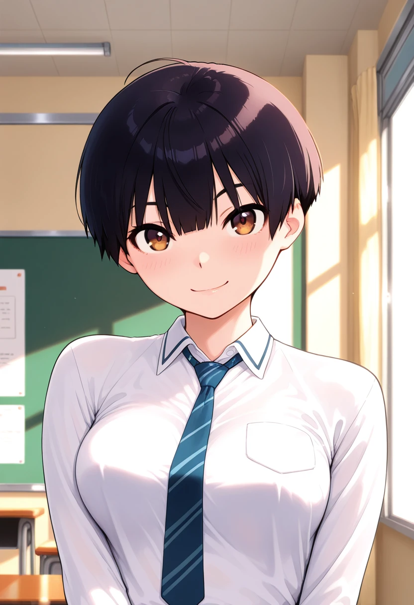 makoww, tomboy, brown eyes, black hair, short hair, medium breasts,