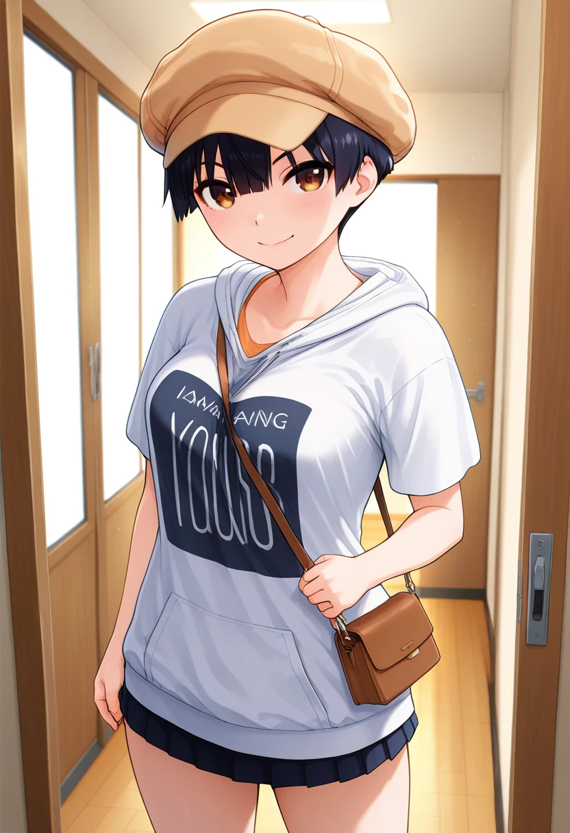 • cabbie hat, clothes writing, hoodie, hood, hood down, short sleeves, miniskirt, socks, shoes,