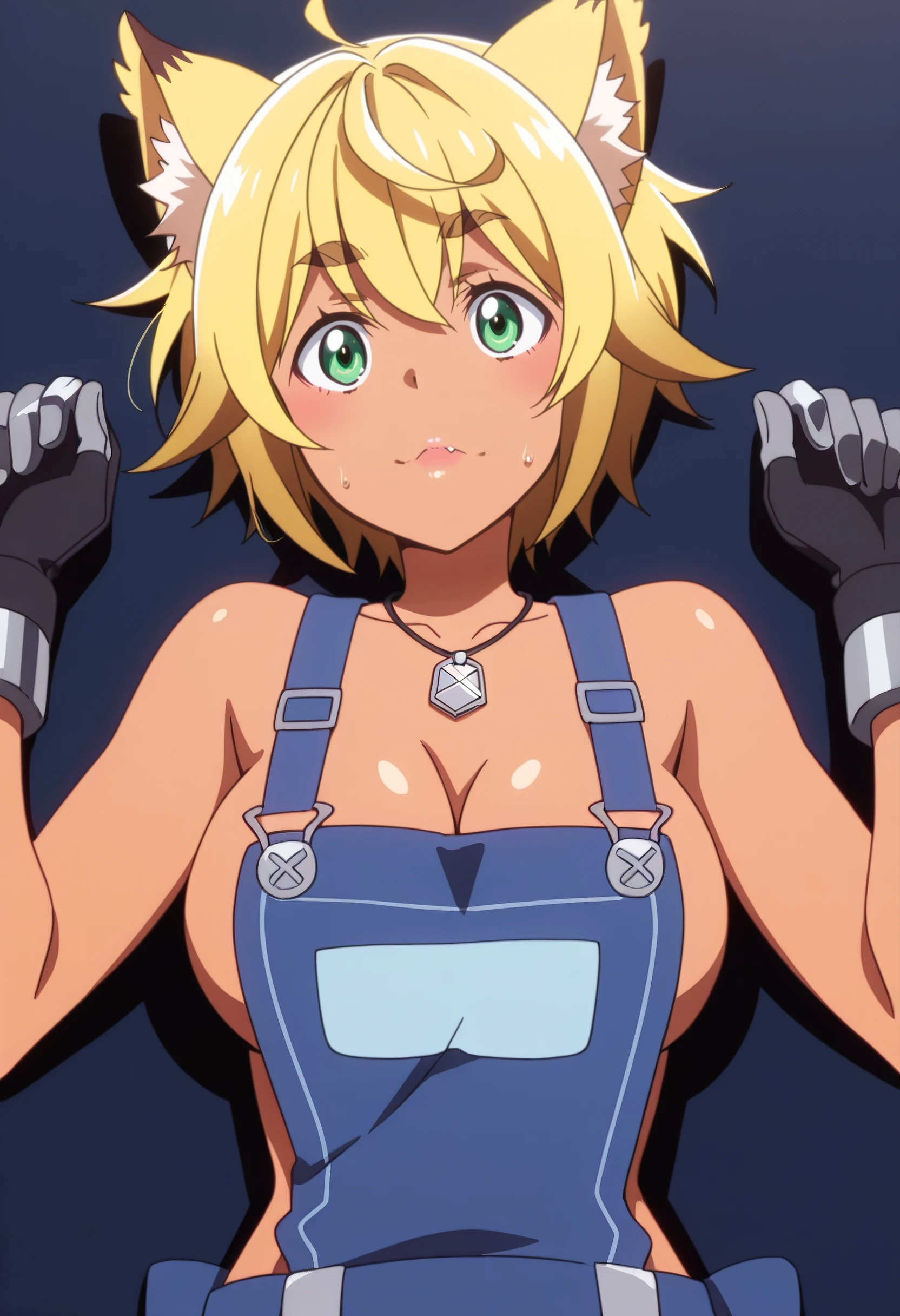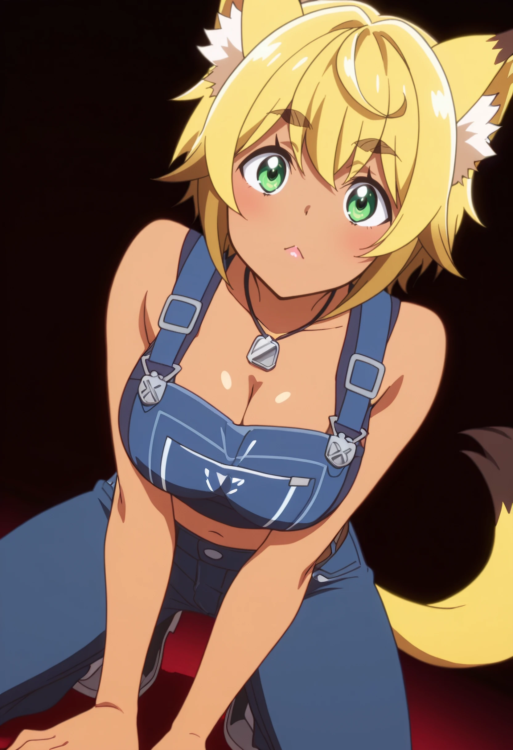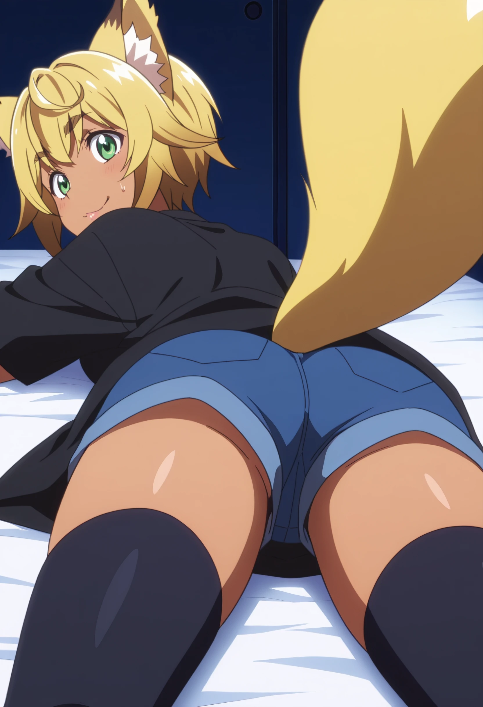 BVulcan, dark-skinned female, blonde hair, short hair, animal ears, green eyes, cat ears, bangs, eyebrows visible through hair, hair between eyes, fox ears, animal ear fluff, tail, ahoge, dark skin,