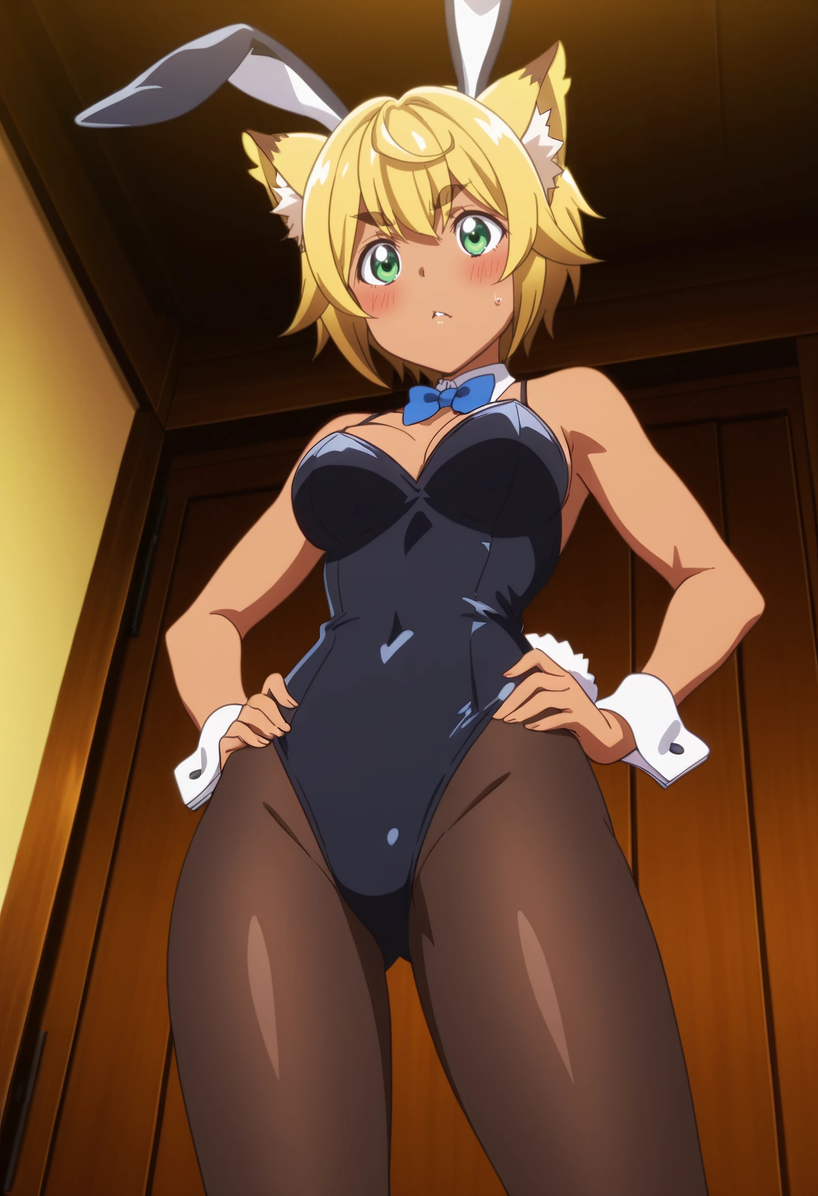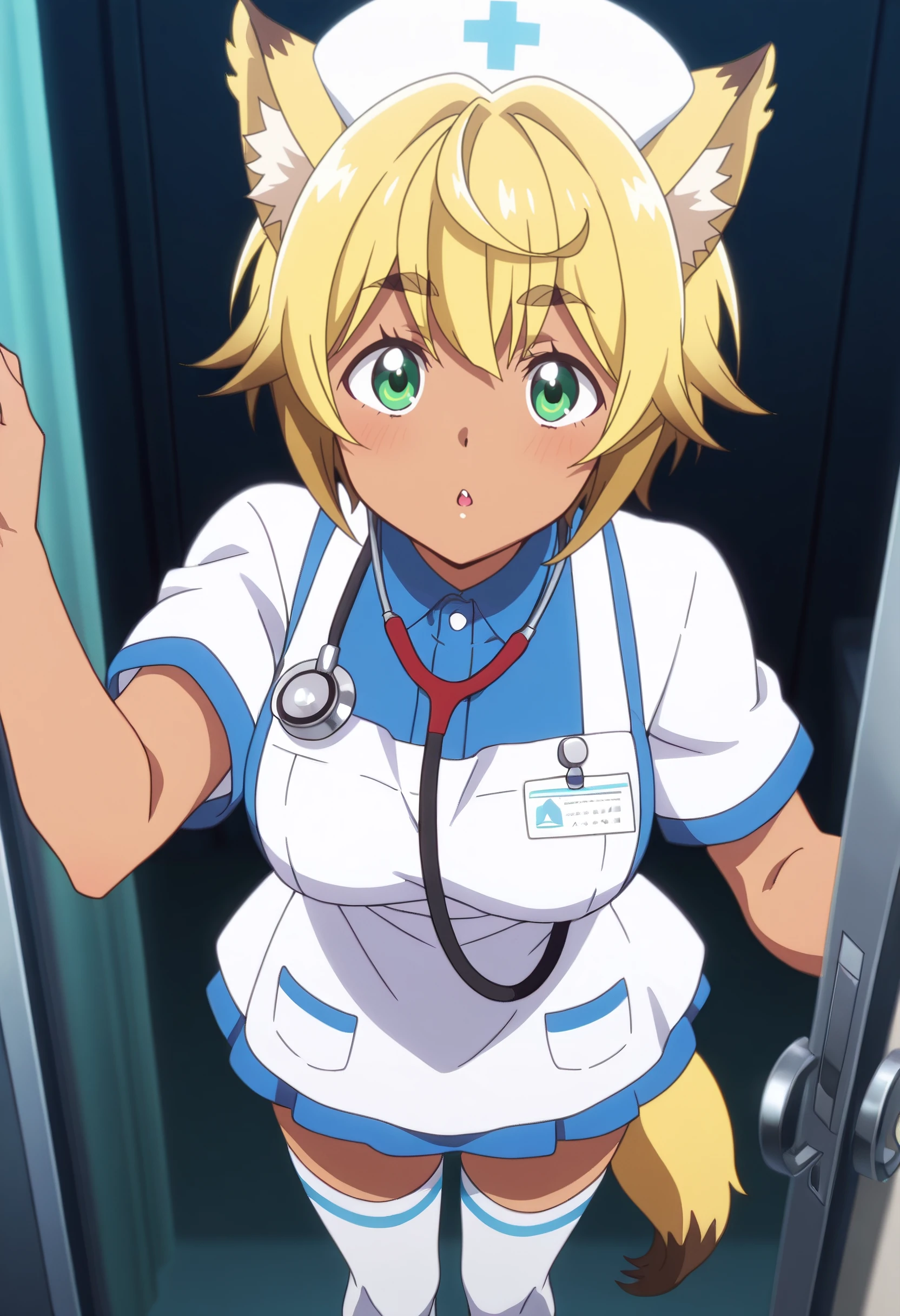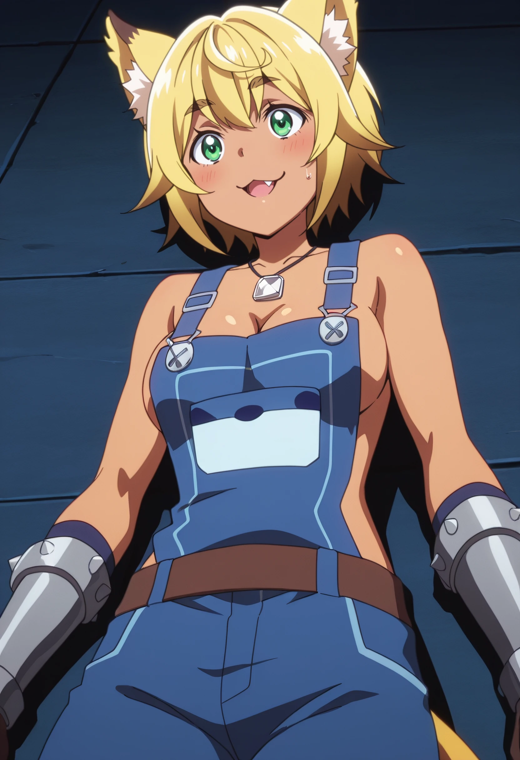 BVulcan, dark-skinned female, blonde hair, short hair, animal ears, green eyes, cat ears, bangs, eyebrows visible through hair, hair between eyes, fox ears, animal ear fluff, tail, ahoge, dark skin,