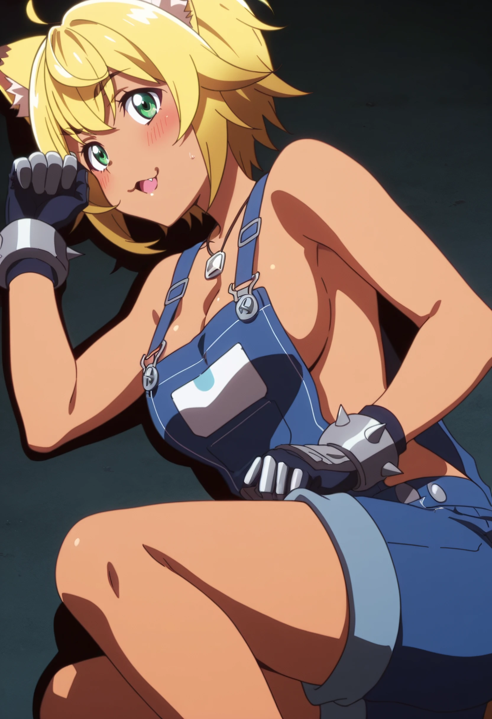 jewelry, bare shoulders, necklace, fang, collarbone, gloves, overalls, cleavage, tank top, pendant, armor, suspenders, naked overalls, sideboob, sleeveless,