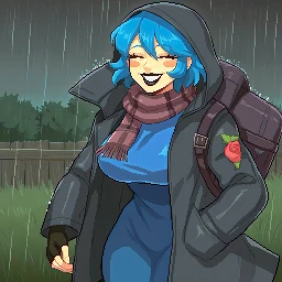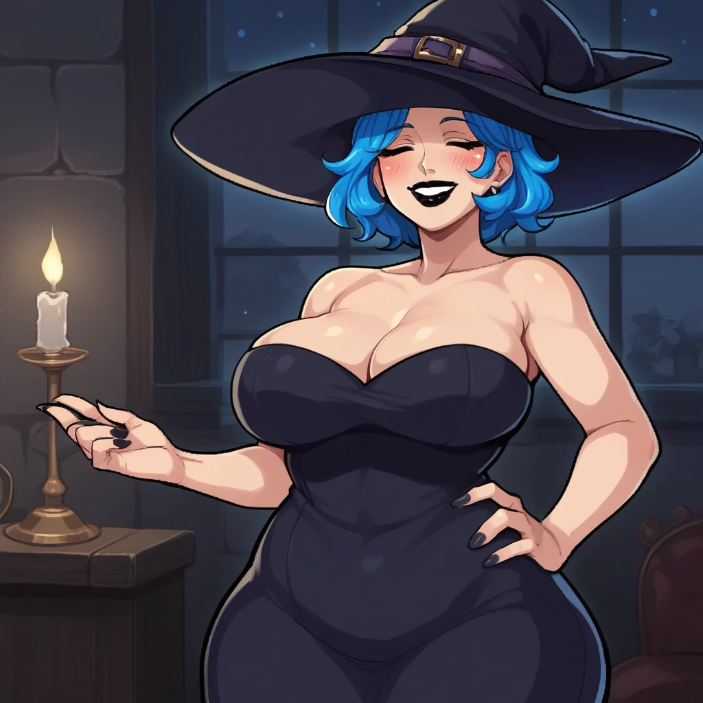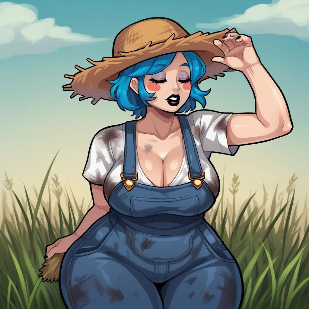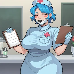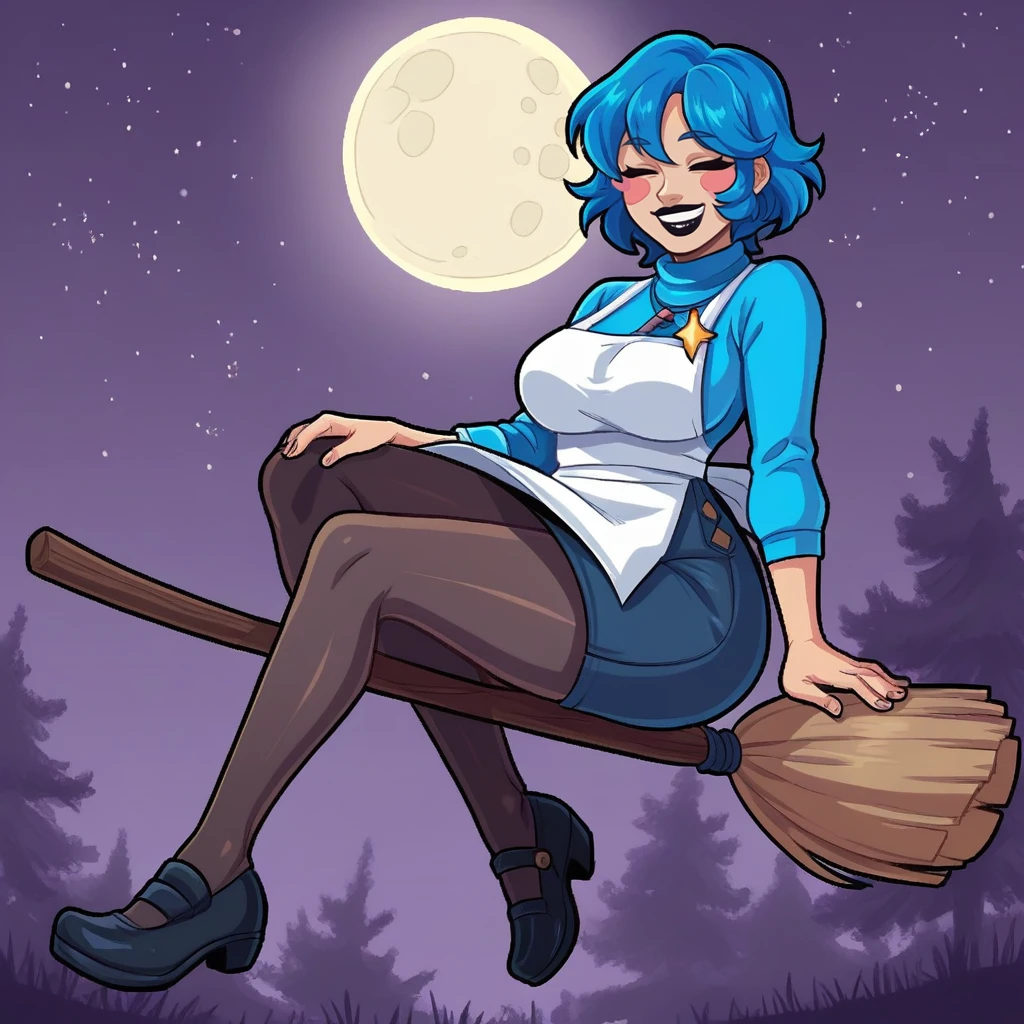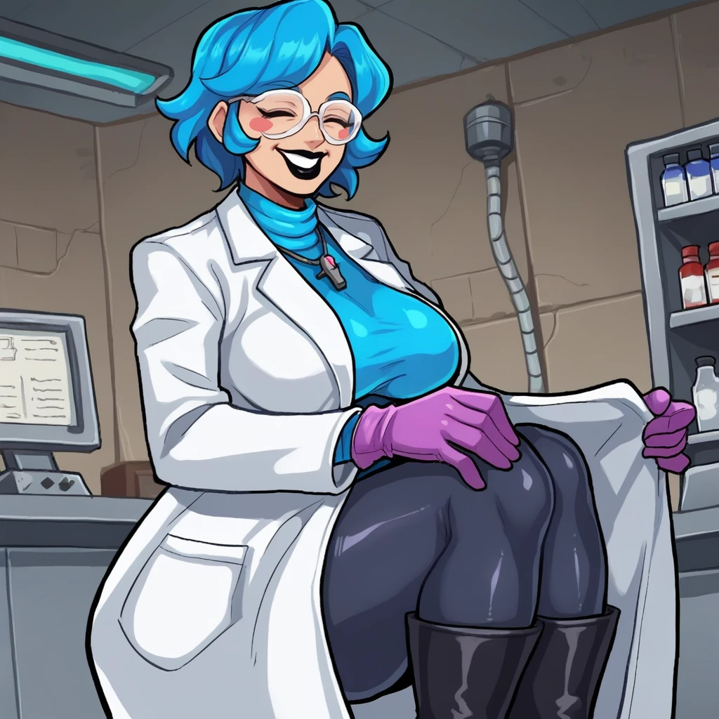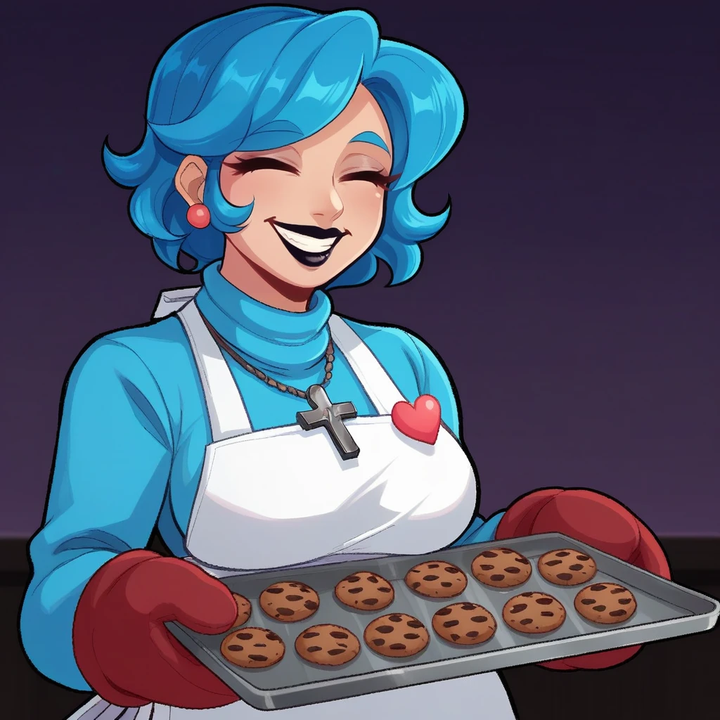 blue hair, short hair, closed eyes, black lipstick, blush stickers, jewelry, crucifix necklace,turtleneck sweater, white apron, heart badge, blue pencil skirt, black pantyhose