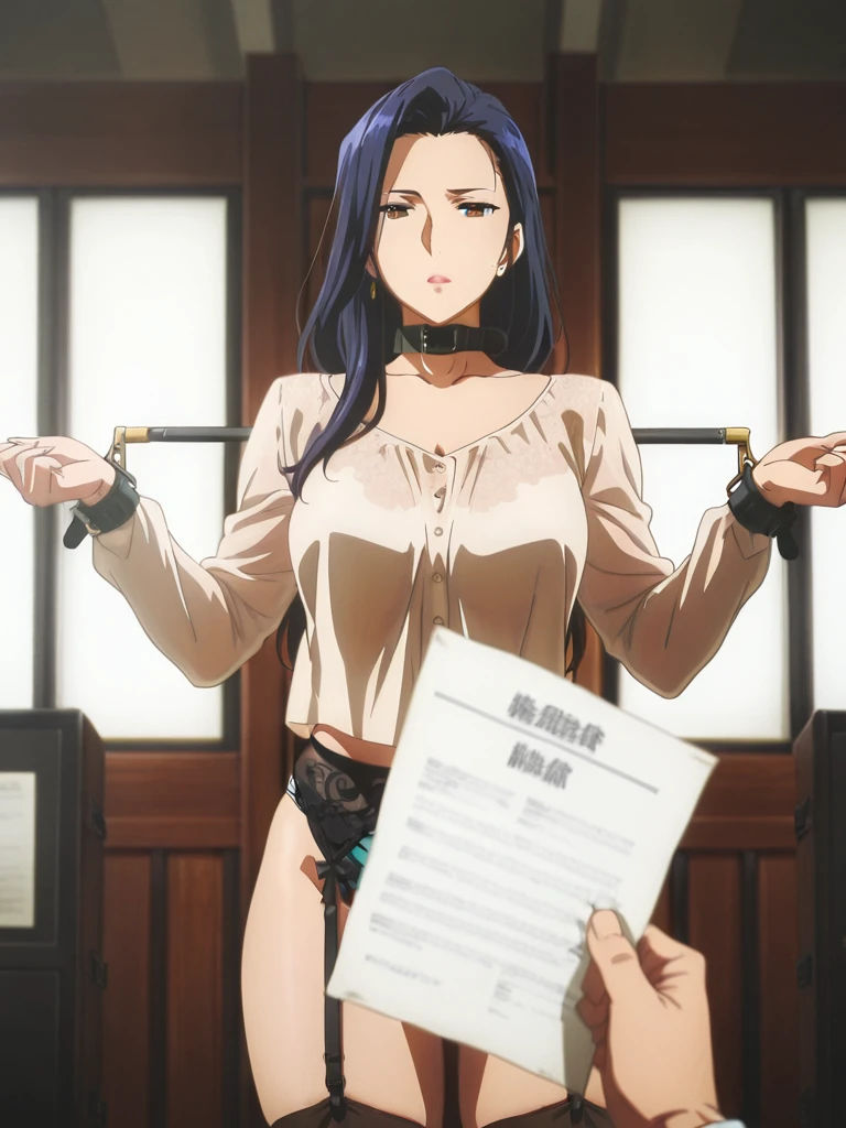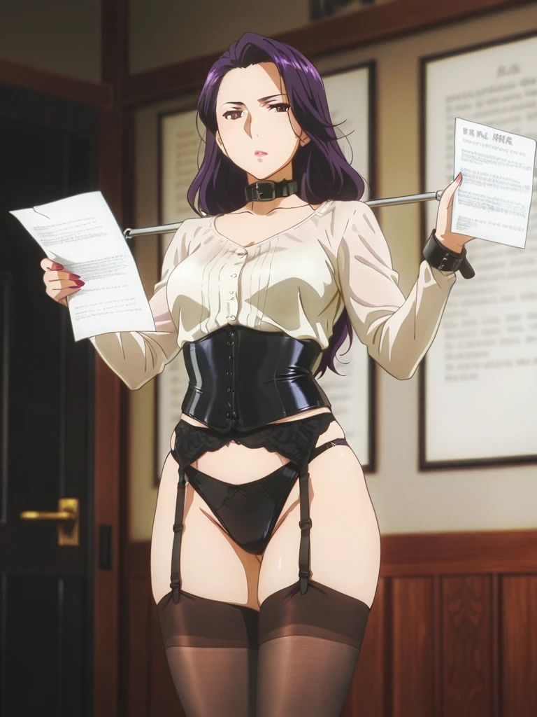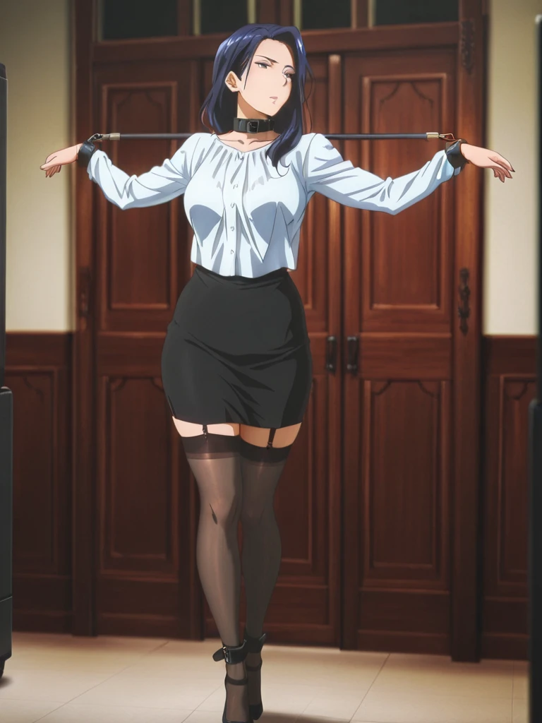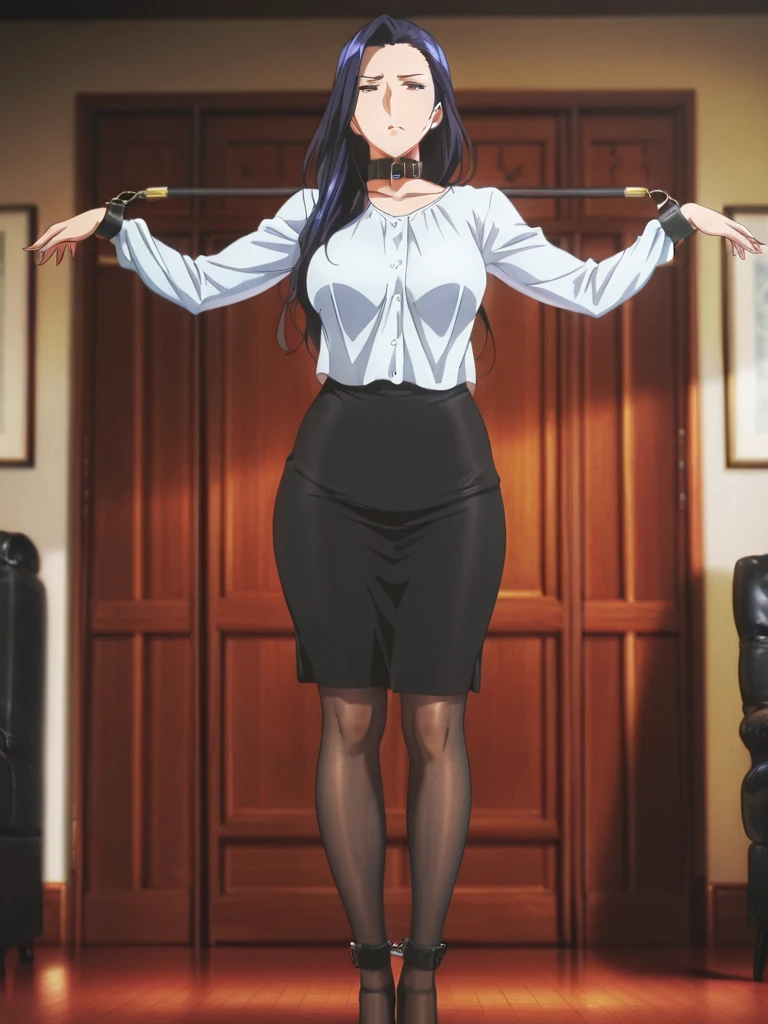 bondage spreader arms, Secretary3,white blouse, ruffled front blouse, long sleeves,black skirt,leather collar,brunette hair, wavy hairstyle, natural makeup,office setting, wooden desk, green framed glass panels, warm lighting, indoor scene,