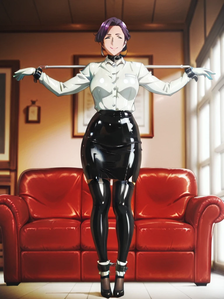 bondage spreader arms, Secretary2,latex maid outfit,white latex top, glossy material,black latex skirt,latex hood, full face mask, red lipstick, eye cutouts,collar with ring, wrist cuffs,ankle cuffs, high platform heels,kitchen interior, wooden cabinets, oven, bright window light, tiled floor,