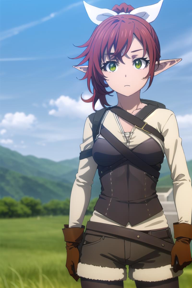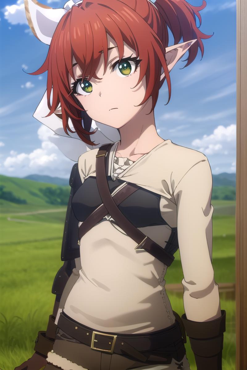 rhea fighter, (green eyes:1.5), hair ribbon, ponytail, red hair, pointy ears, elf, white bow, white ribbon, ribbon,