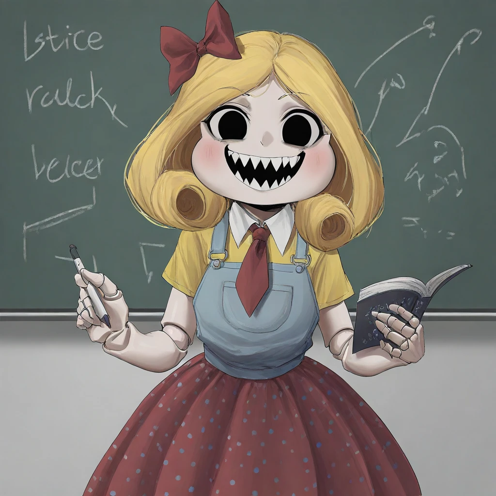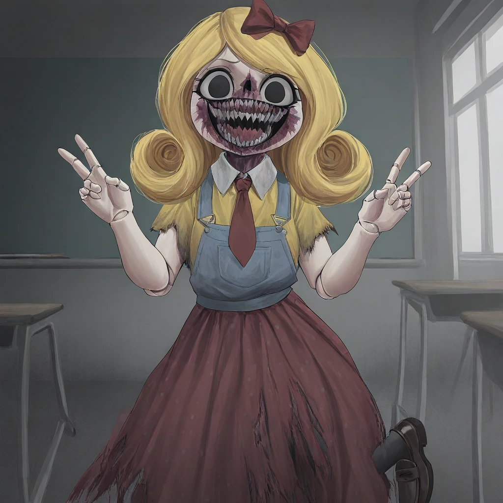 monster doll female, solo, curvy, blonde hair with curled ends, red hairbow, light brown doll skin, broken split face, dark pink face flesh, large smile, rosy cheeks, large white teeth, large black eyes with white sclera, dark pink fleshy mouth, light blue overalls with dark red polkadot skirt, yellow short sleeve shirt with white collar, red tie, brown loafers, ripped clothing, torn clothing, doll joints,
