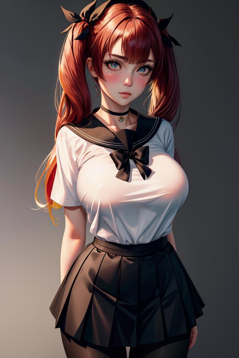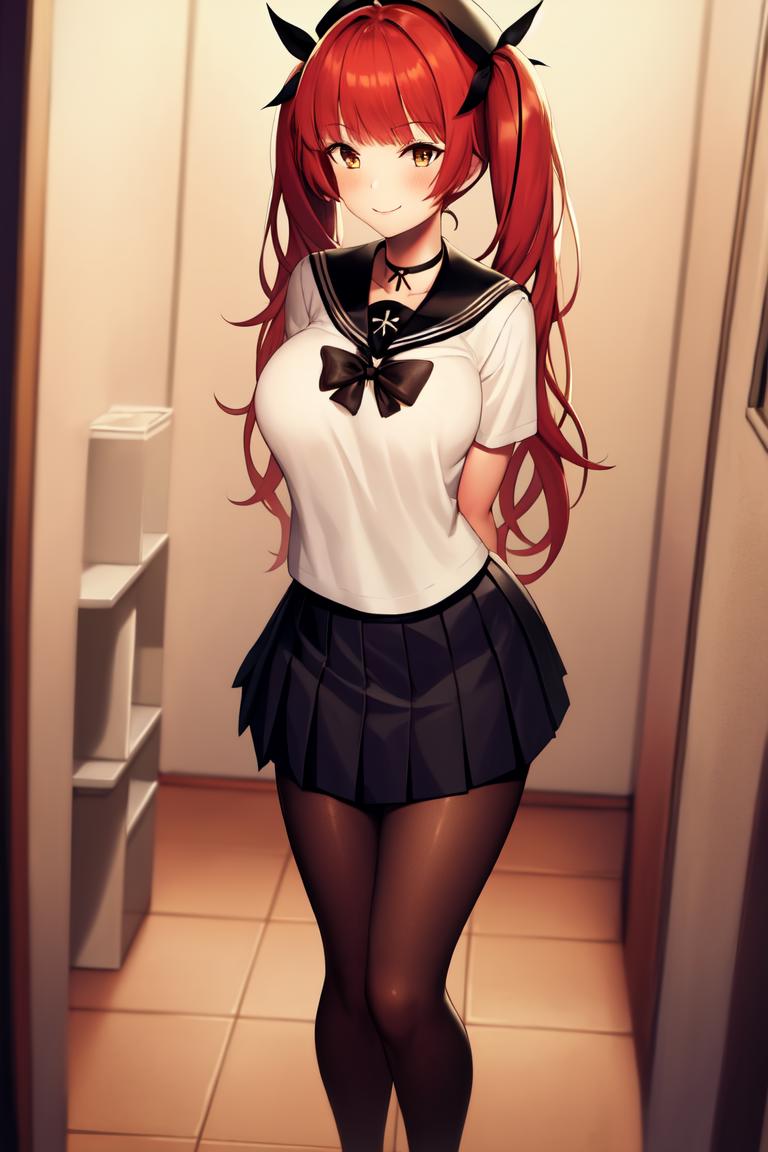 Honolulu, HonoluluSchool, long hair, twintails, serafuku, short sleeves, hair ribbon, black ribbon, black pantyhose, black skirt, beret, choker