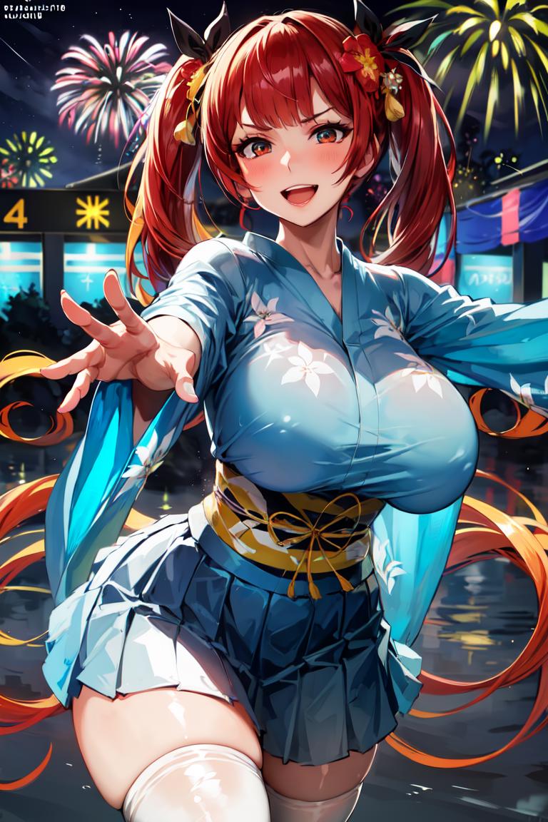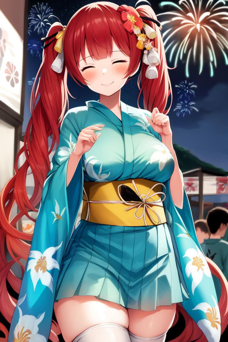 Honolulu, HonoluluKimono, very long hair, twintails, blue kimono, floral print, sash, hair flower, white thighhighs