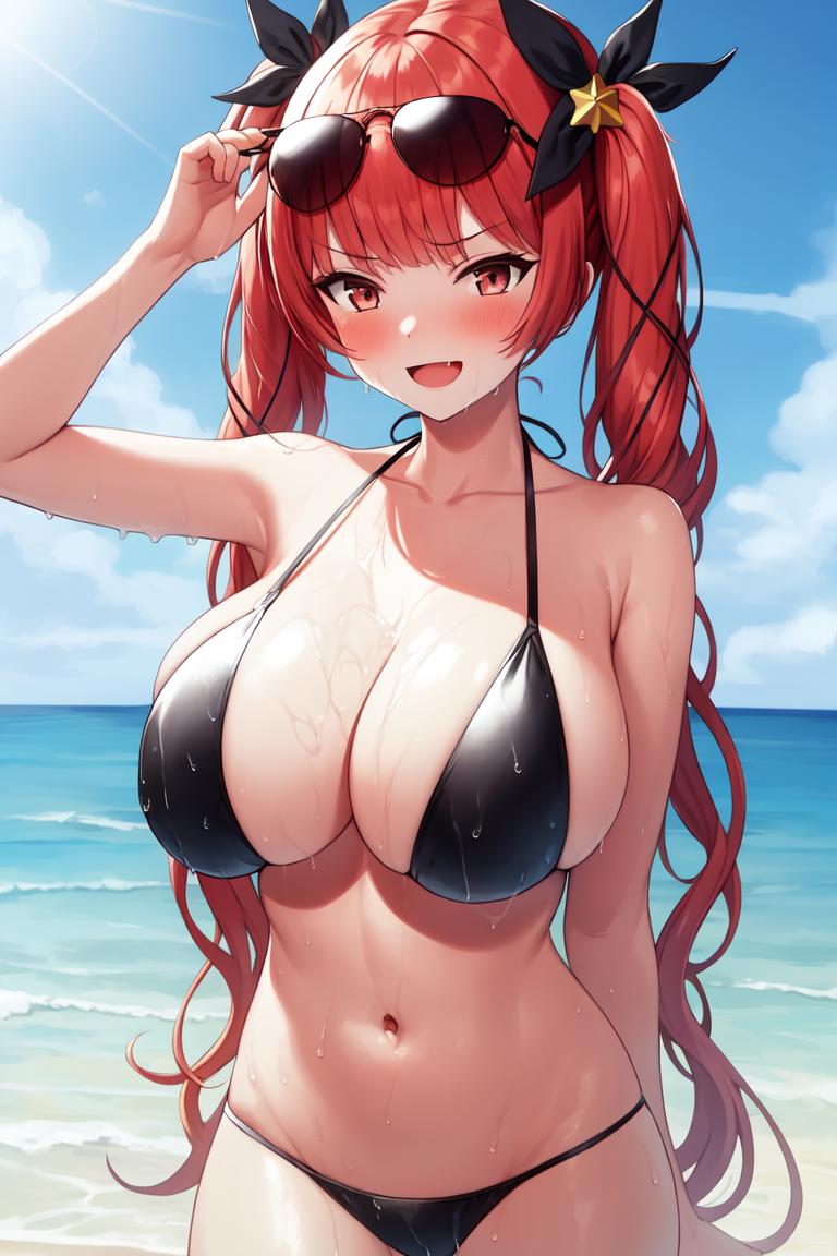 Honolulu, HonoluluBikini, very long hair, twintails, black bikini, hair ribbon, eyewear on head, sunglasses, star hair ornament