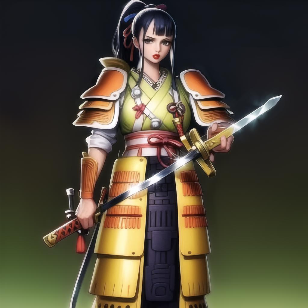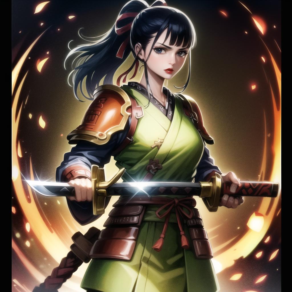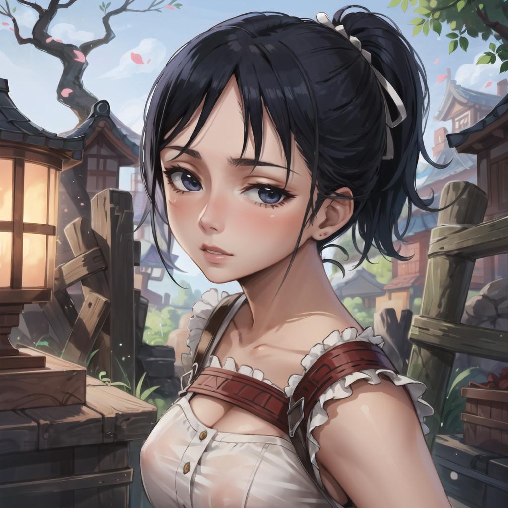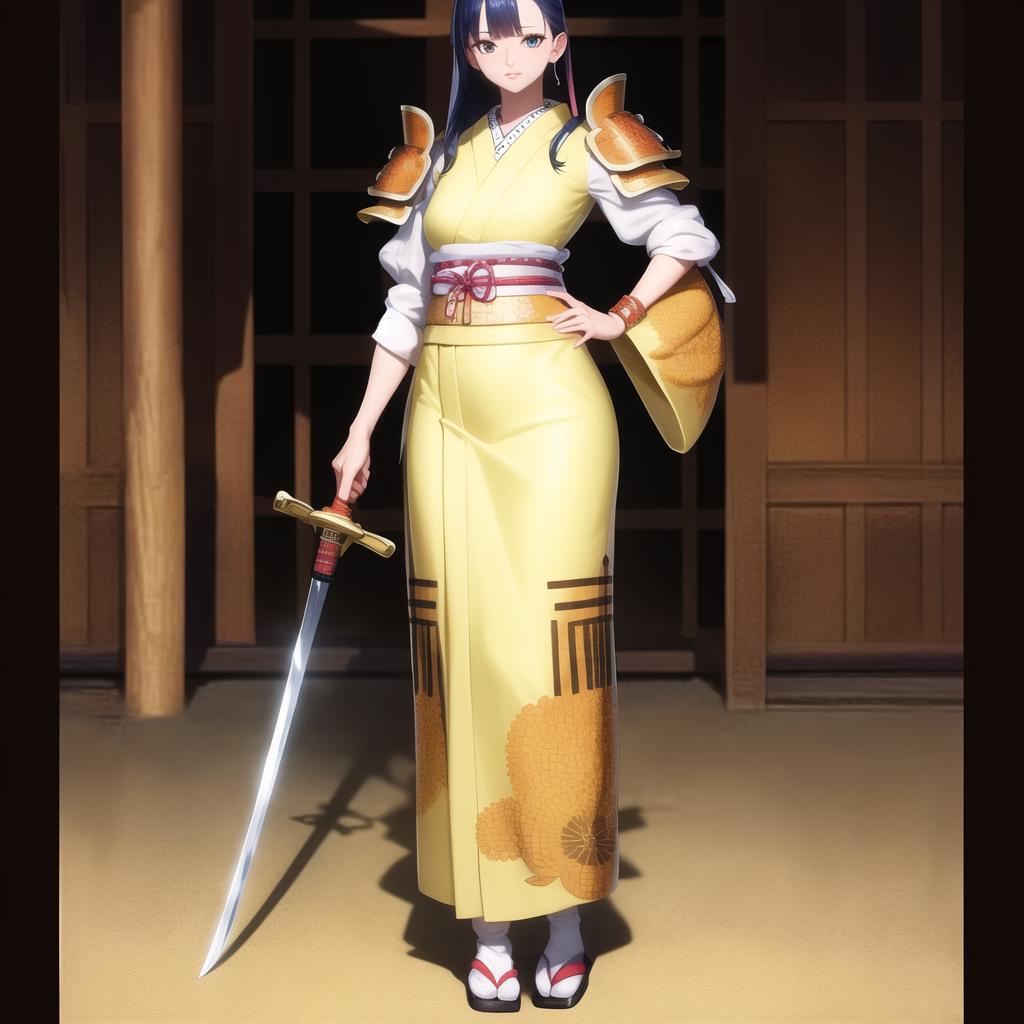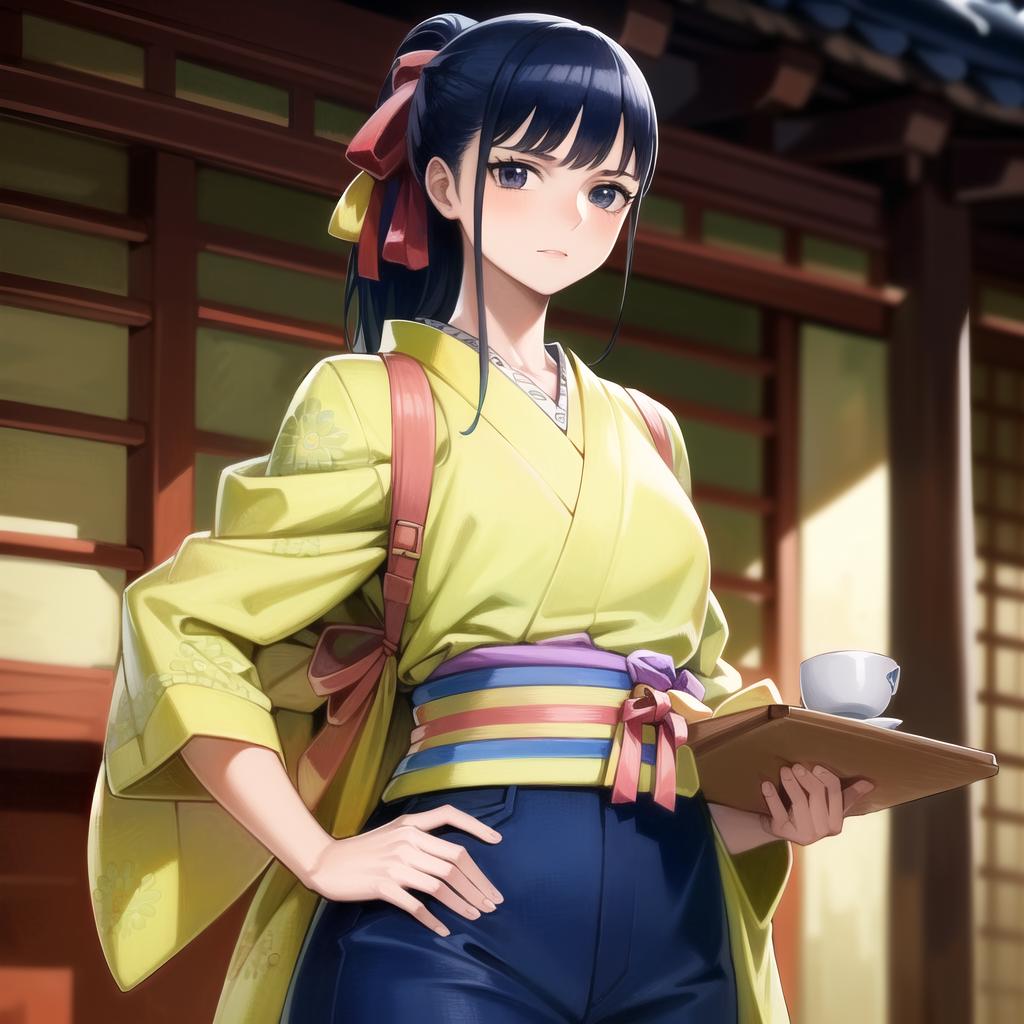 For her original clothes: <lora:Kikunojov320:1>(yellow kimono, bangs, ponytail, red hair ribbon)