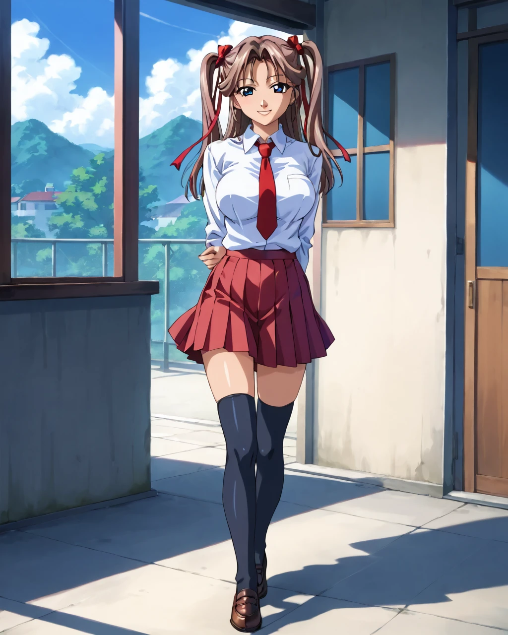 Yuki Toudou, toudou, light brown hair, twintails, long hair, ribbon, hair ribbon, dark blue eyes, large breasts, 1girl, solo, retro artstyle, 1990s (style)