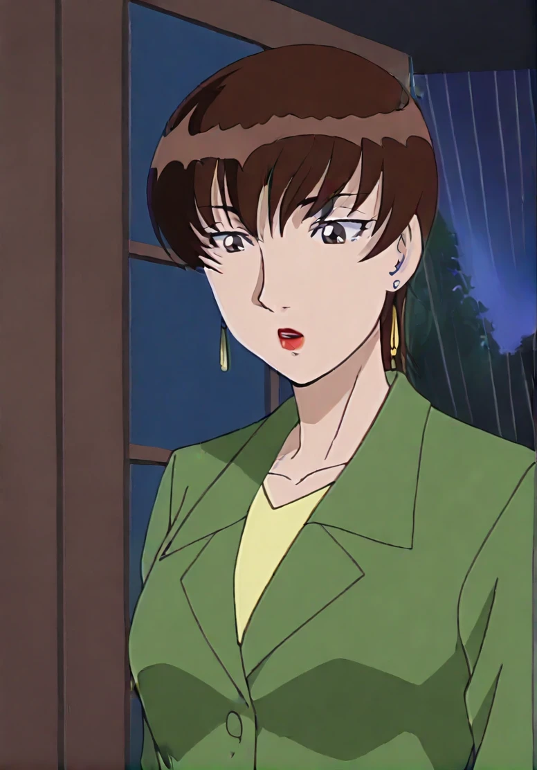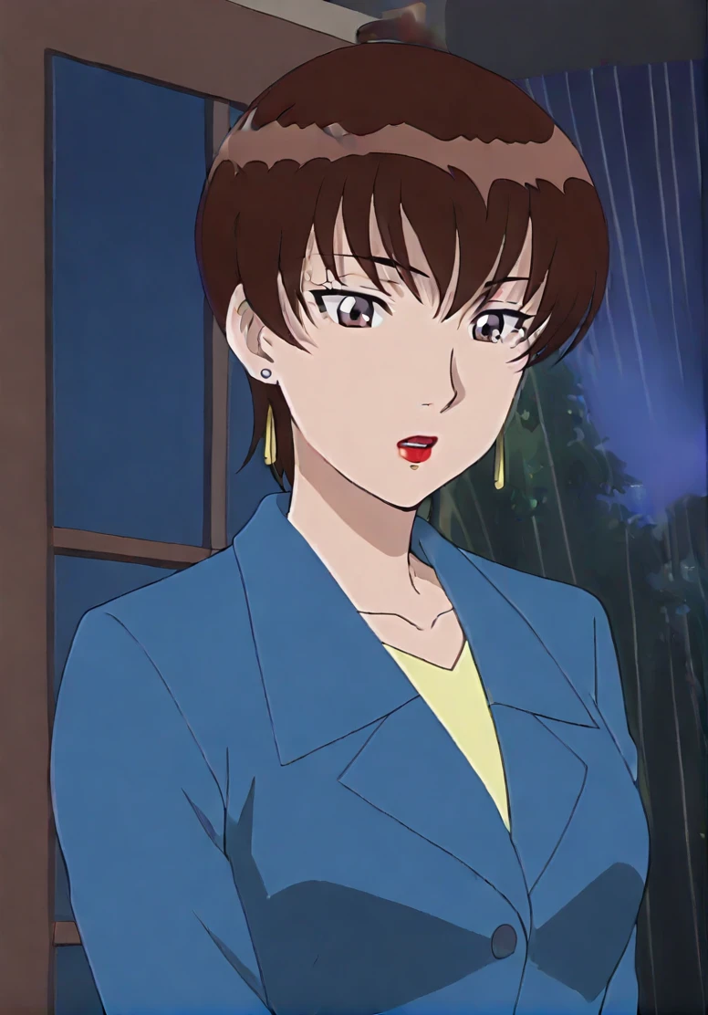 anime screencap,anime coloring<lora:Kagawa Kome - Kindaichi Sonen no Jikenbo v2:0.8> 1girl, short hair, brown hair, jewelry, earrings, makeup, lipstick, lipstick tube, Kagawa Kome,Medium