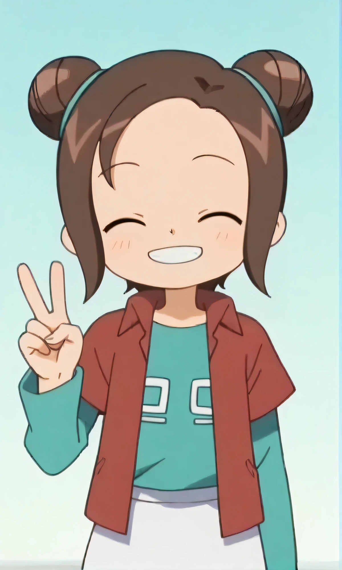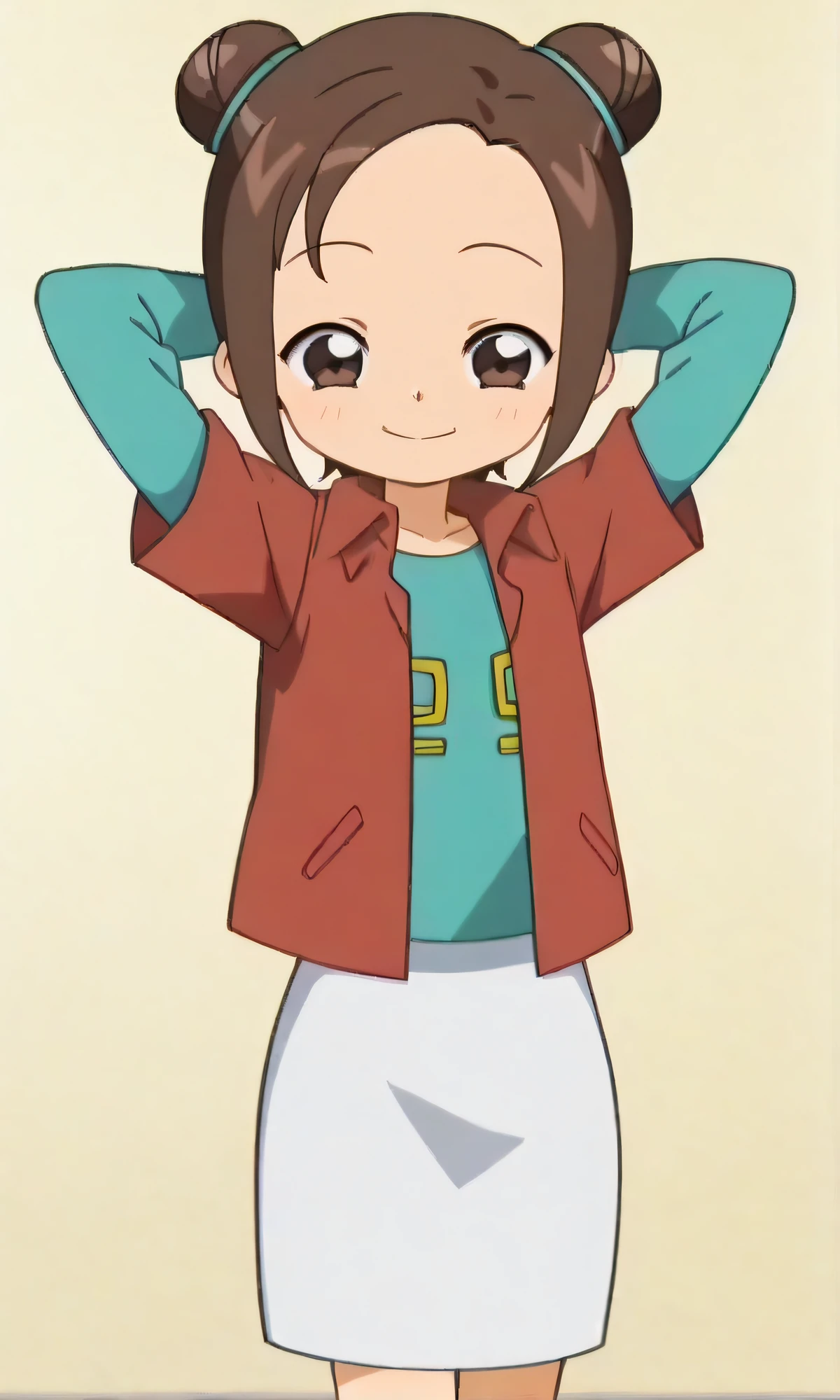 umeno, brown hair, doublebun, brown eyes, layered shirt, white skirt, layered sleeves, open clothes, blue long sleeves, red short sleeves, pencil skirt