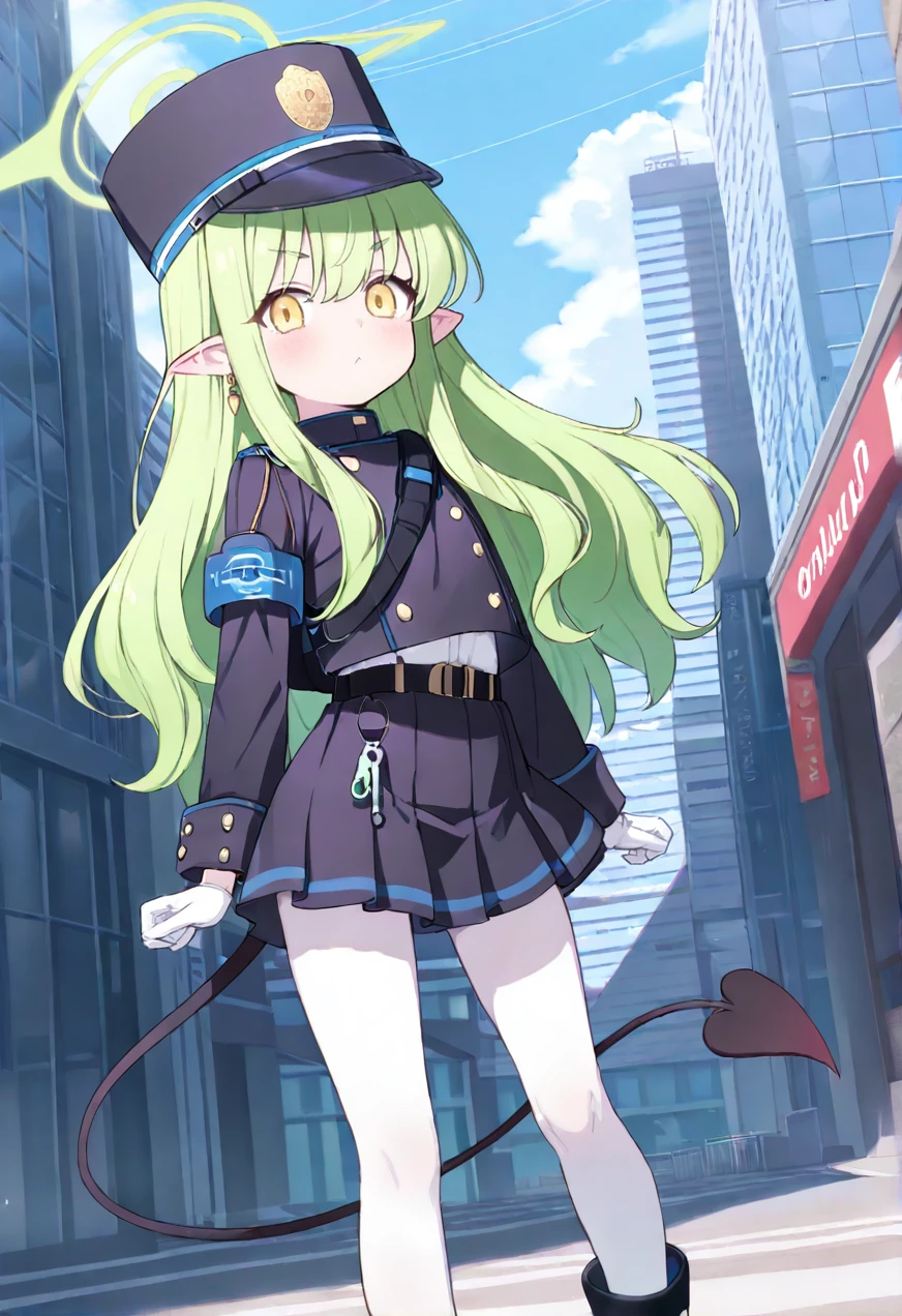 hikari-default,hikari_\(blue archive\),closed eyes,green hair,long hair,earring,pointy ears,halo,tail,black jacket,long sleeves,white shirt,black skirt,arm band,white pantyhose,white gloves,boots,peaked cap