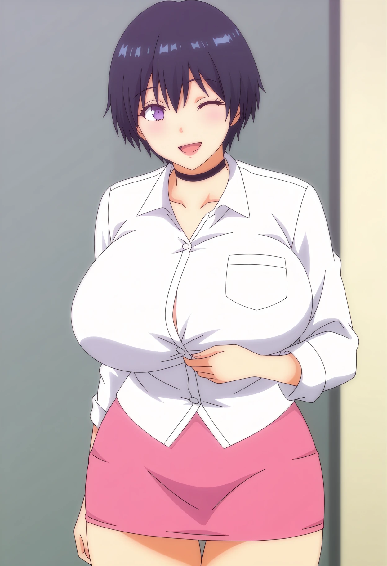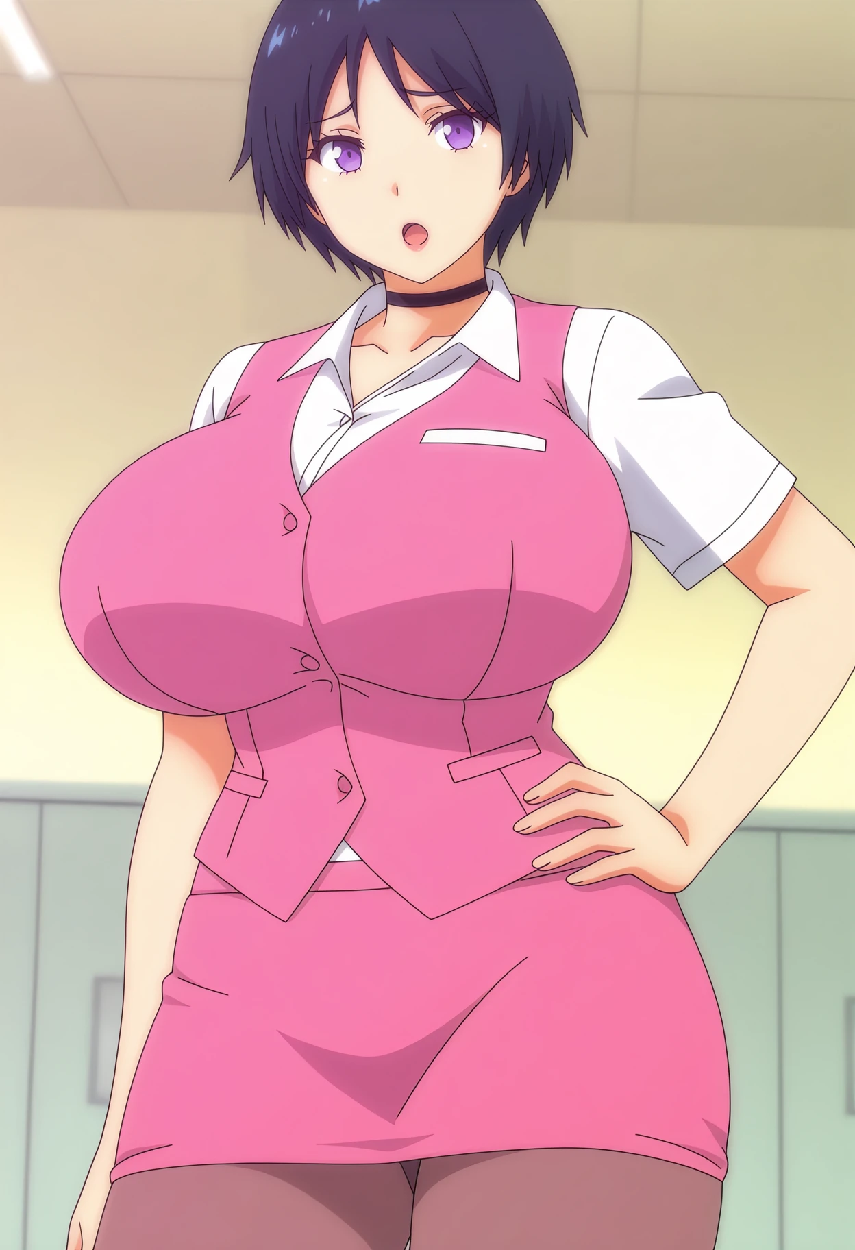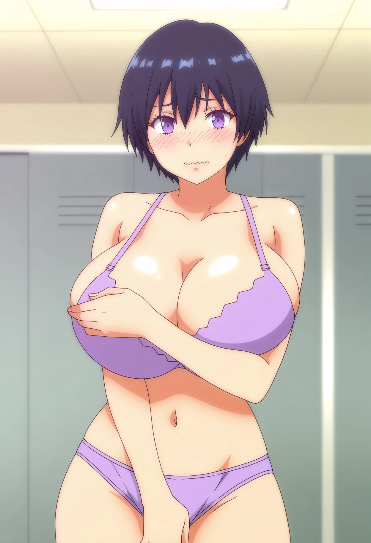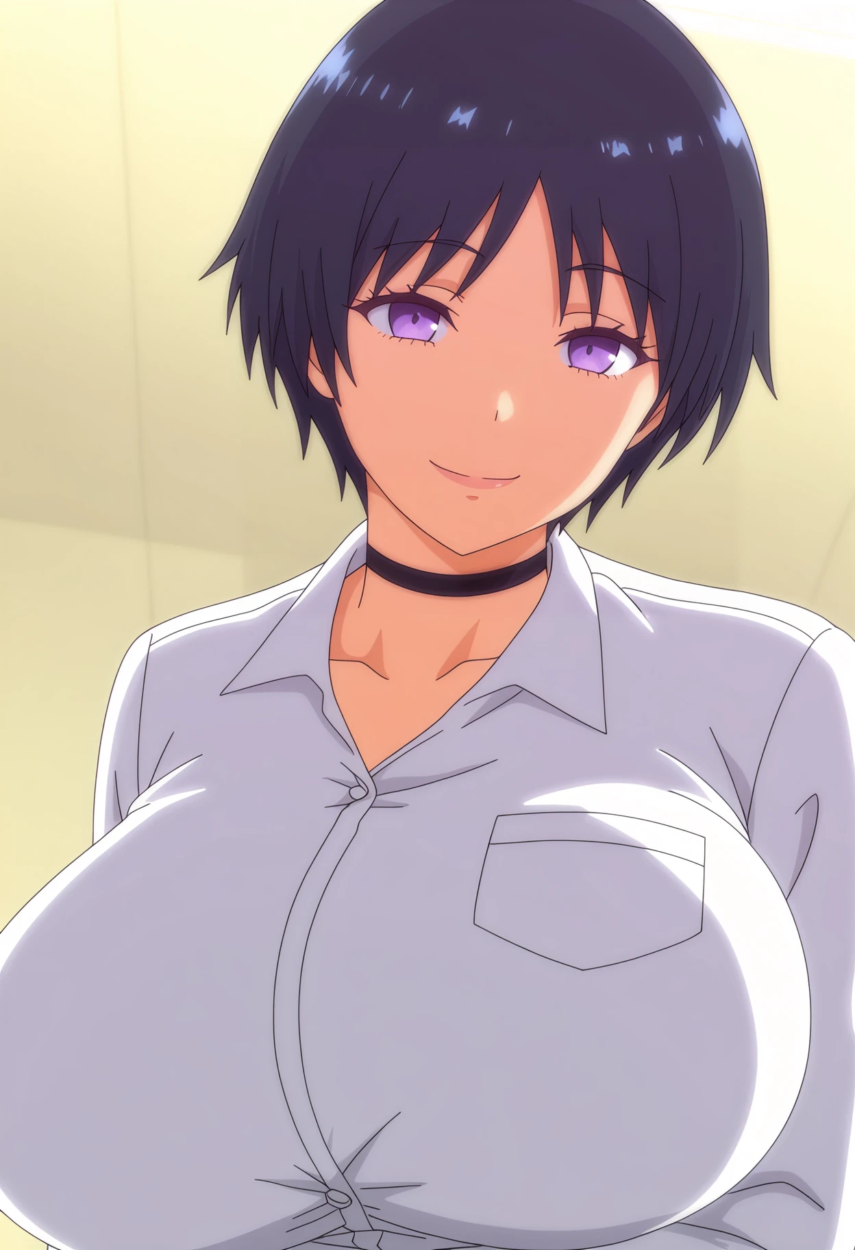 1girl,solo,anime coloring,mm,short hair,black hair,purple eyes,huge breasts