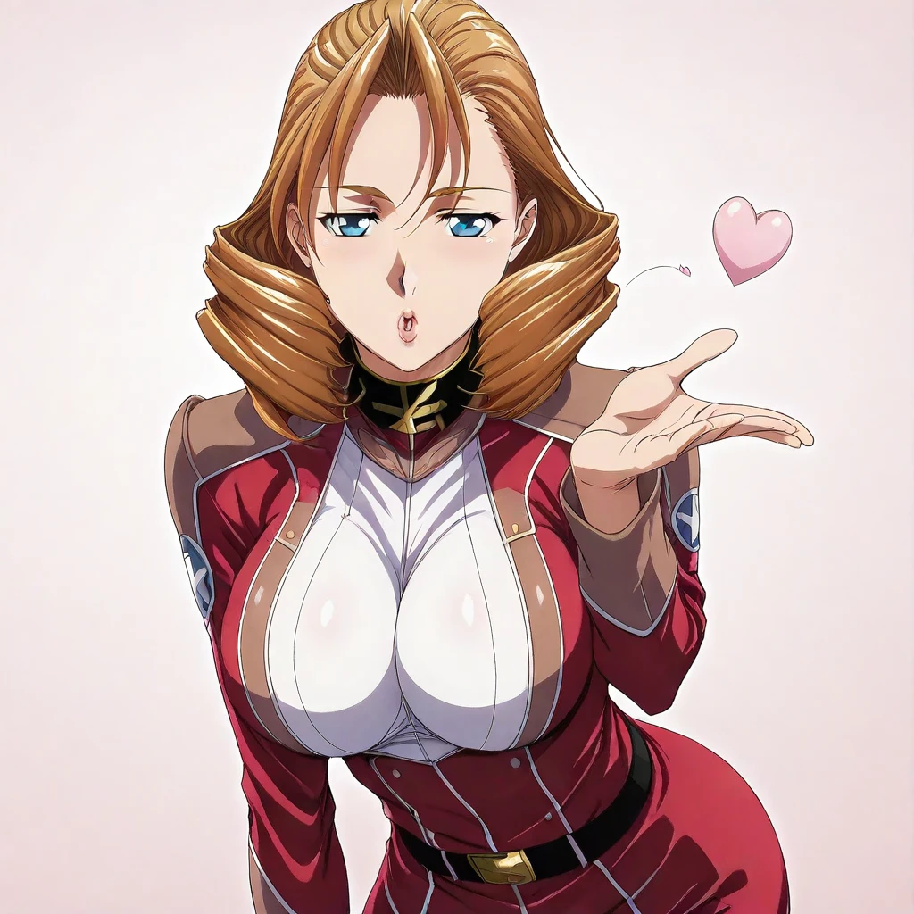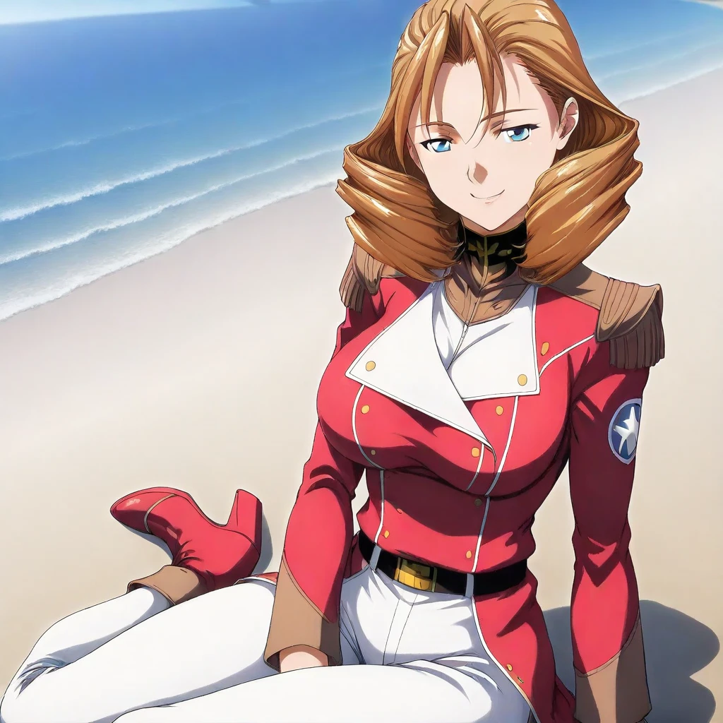 luna armonia \(gundam\), brown hair, medium hair, bangs, brown eyes, ascot, collar, military uniform, skirt, belt, white pants, heels, large breasts, 1girl, solo