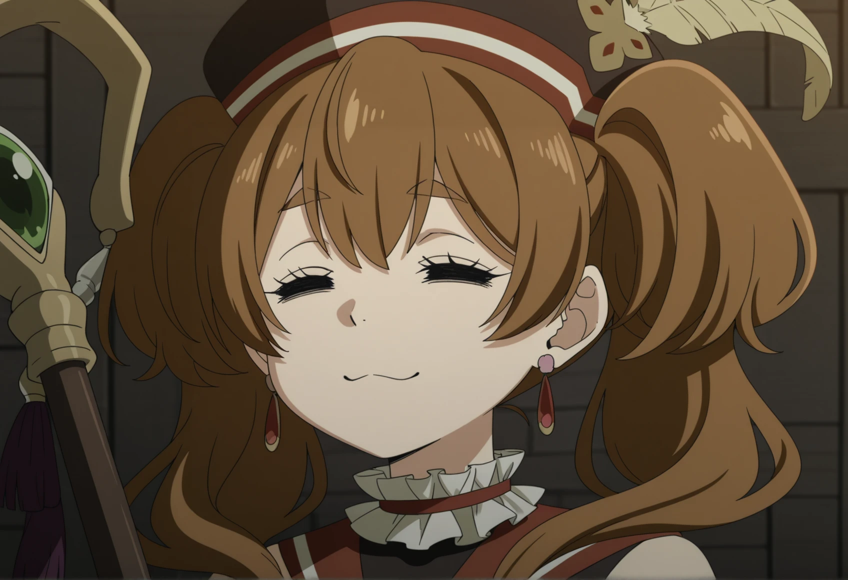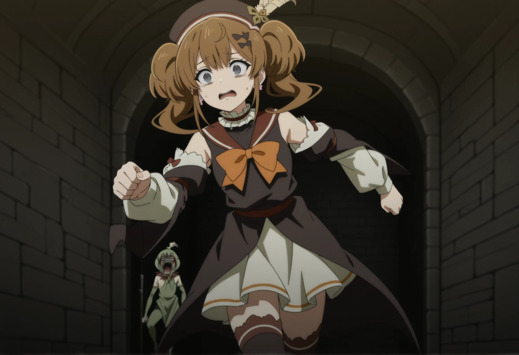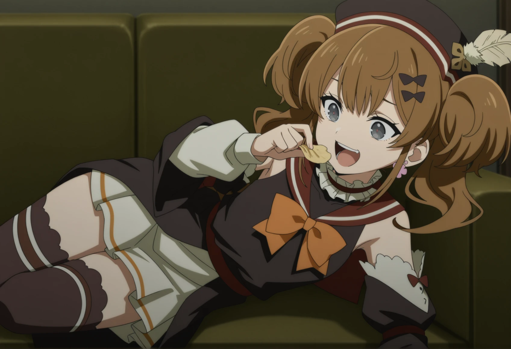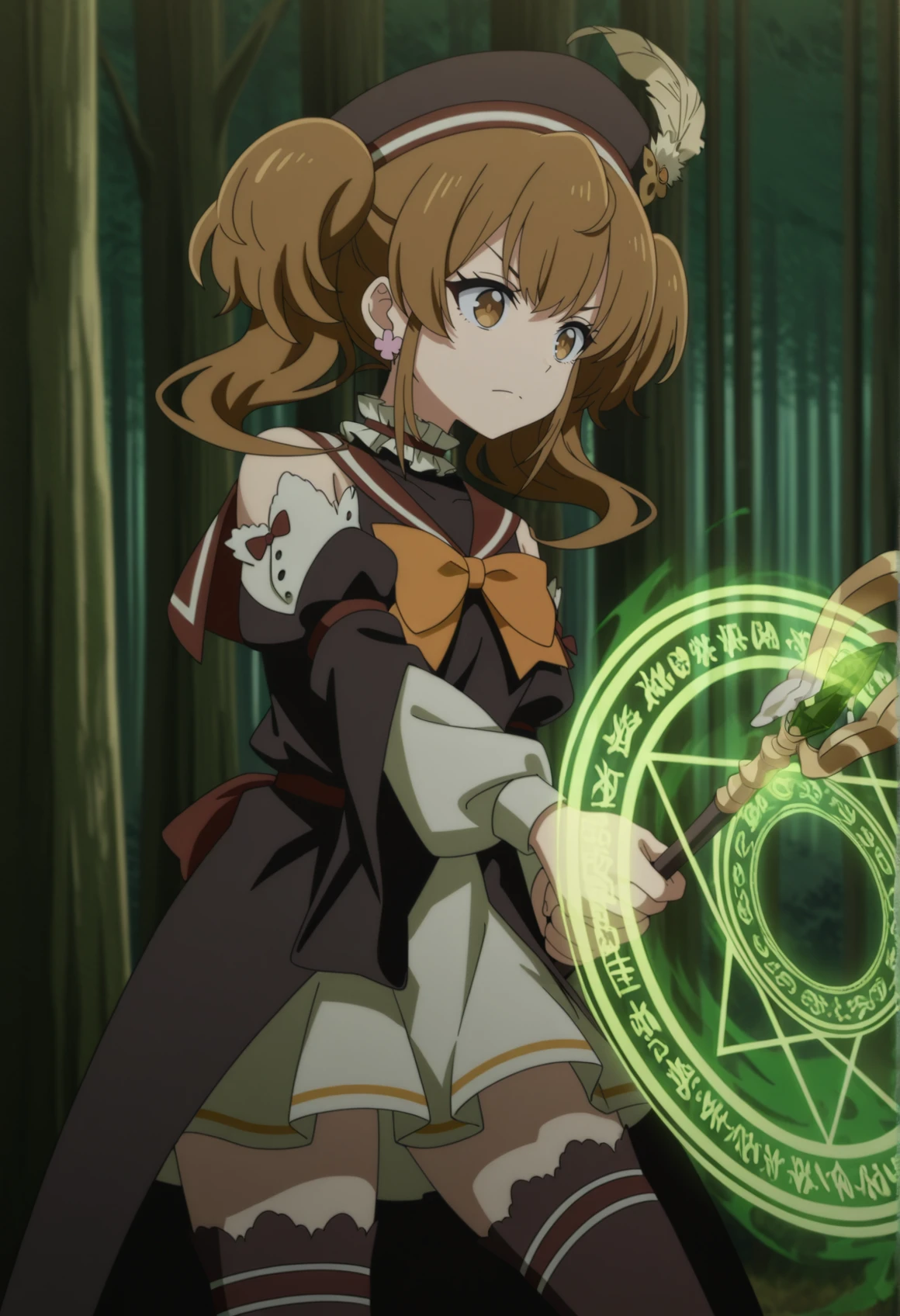 brown hair, twintails, earrings, hair bow, beret, feather, short dress, detached sleeves, bare shoulder, serafuku collar, chest ribbon, frills, choker, thighhighs