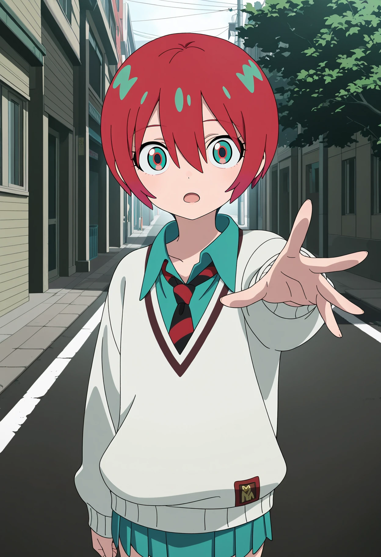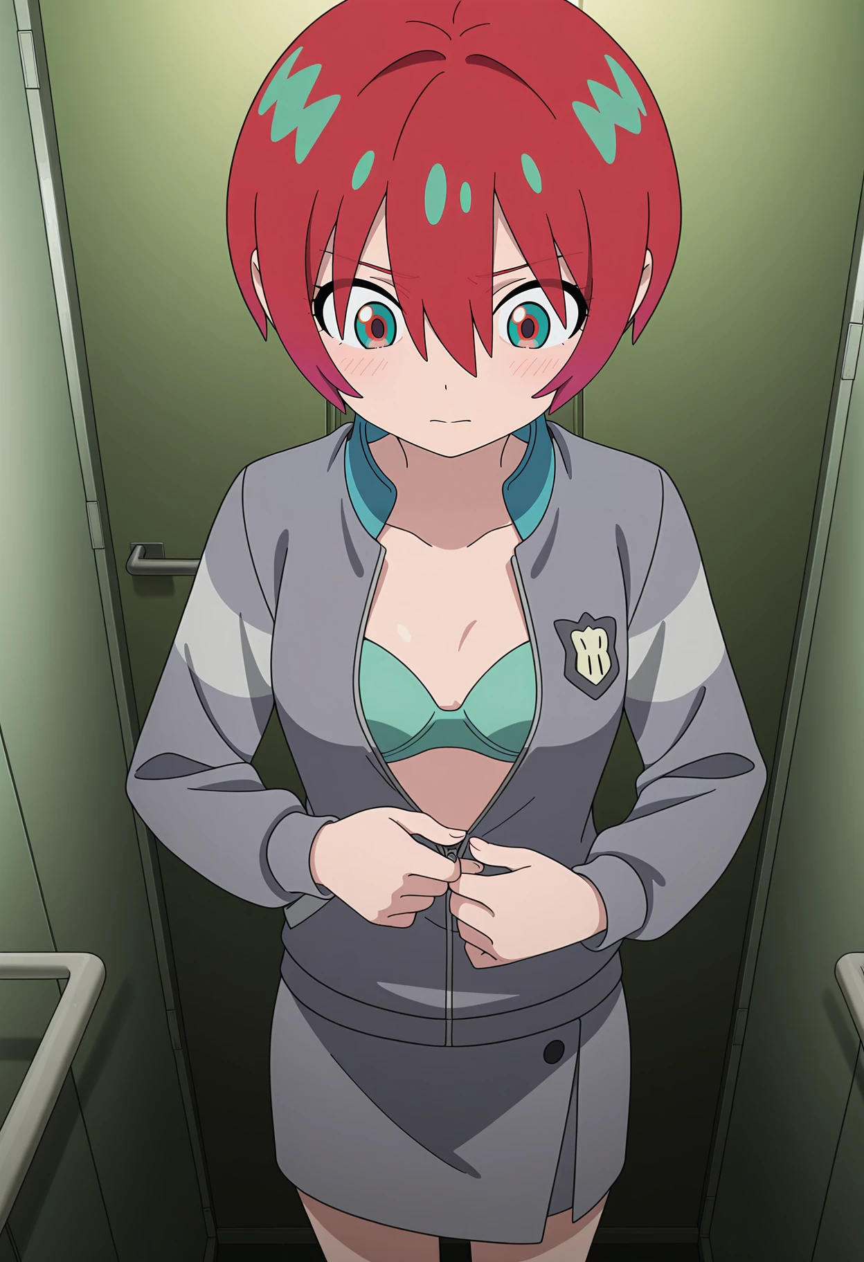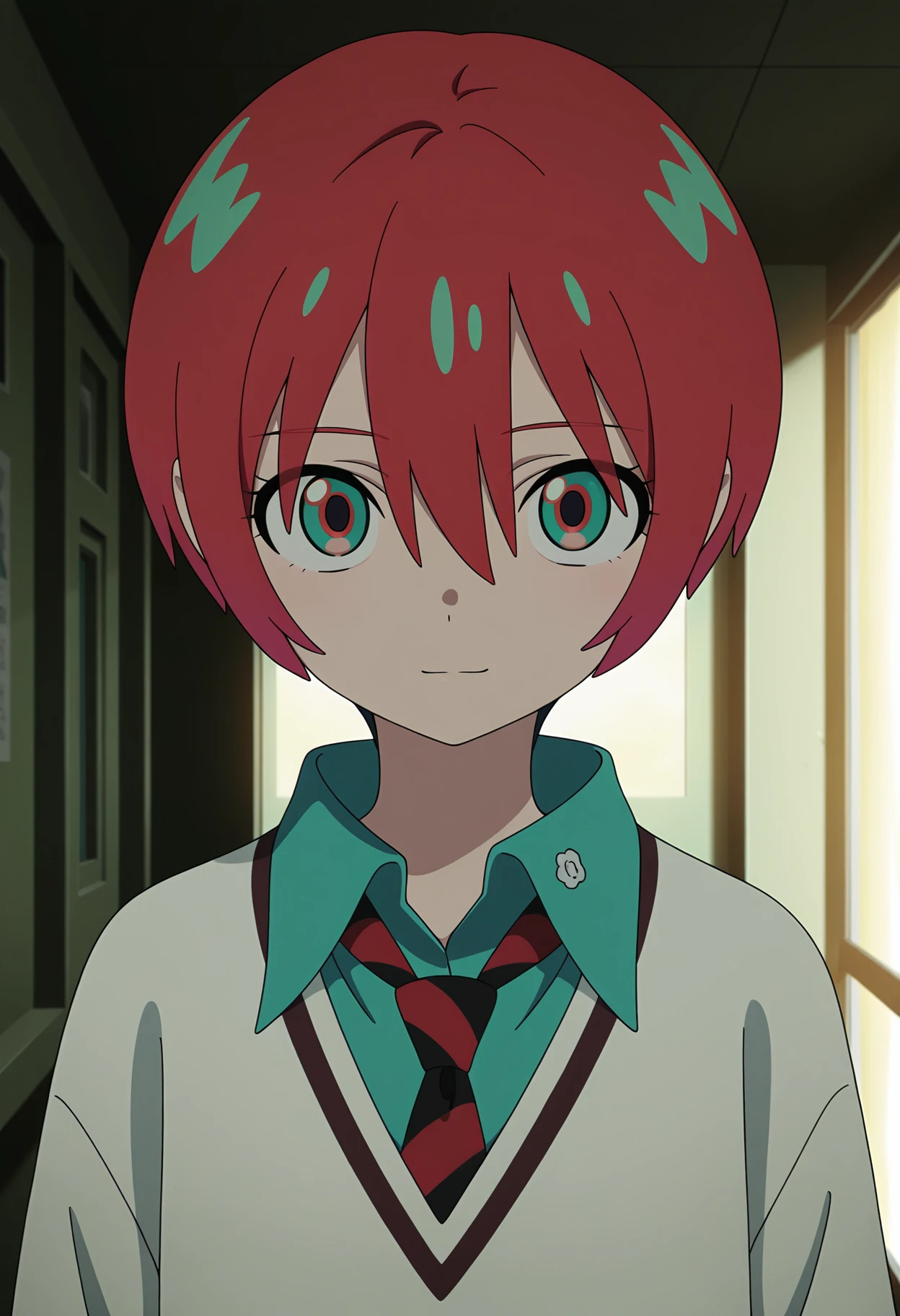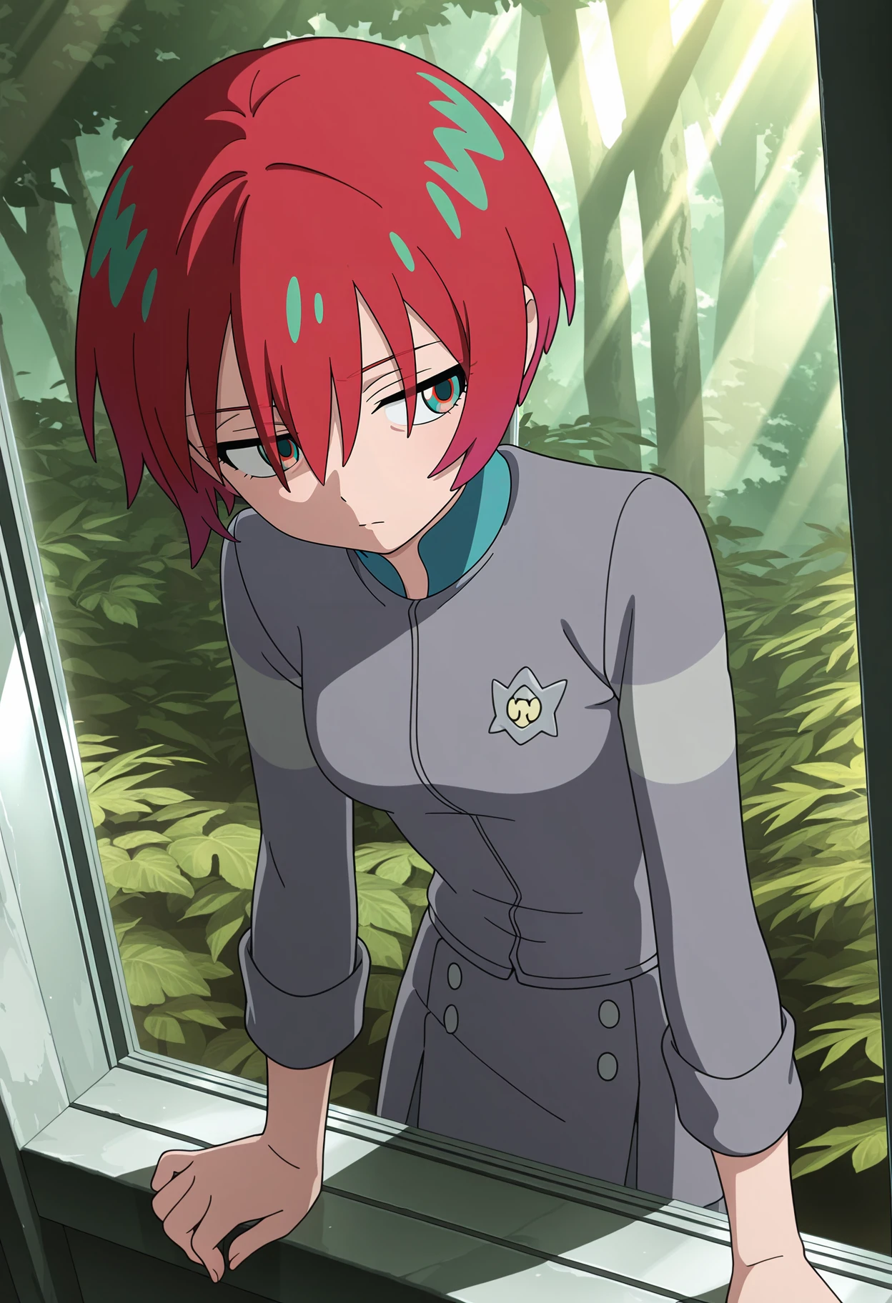 mm,red hair,short hair,hair between eyes,red and green eyes,anime coloring